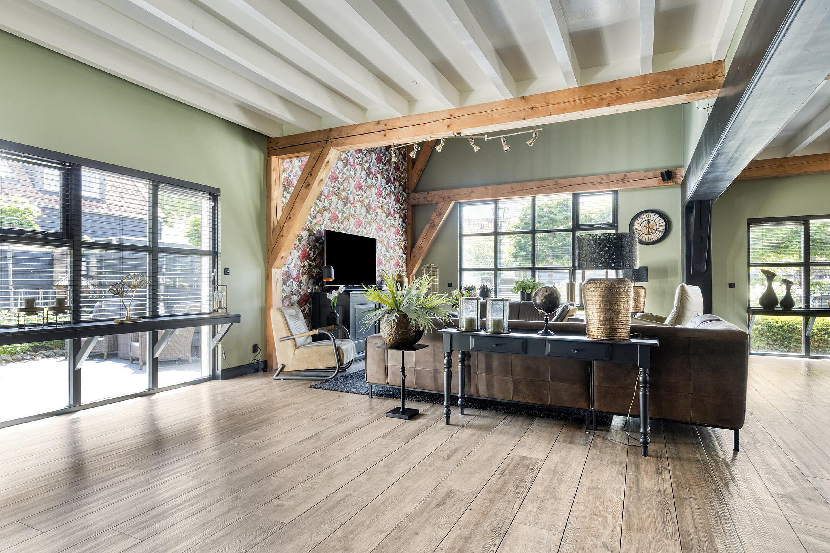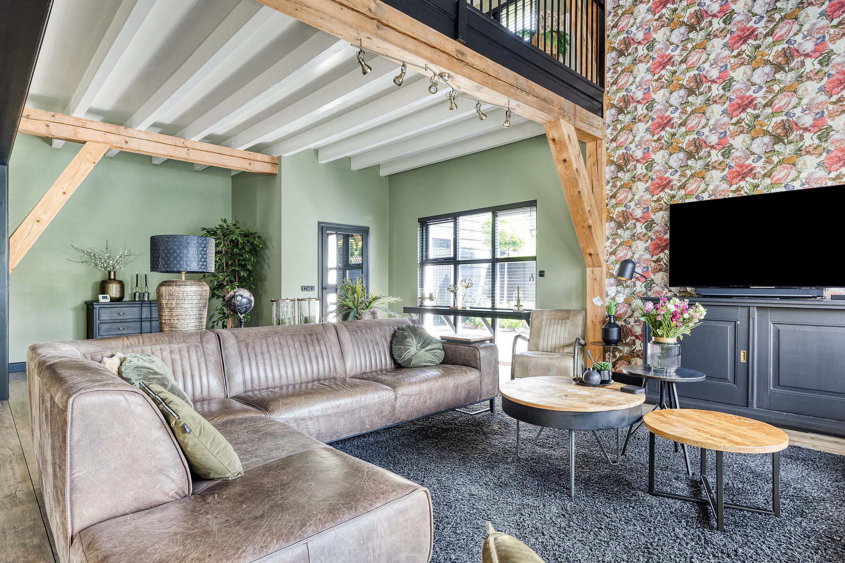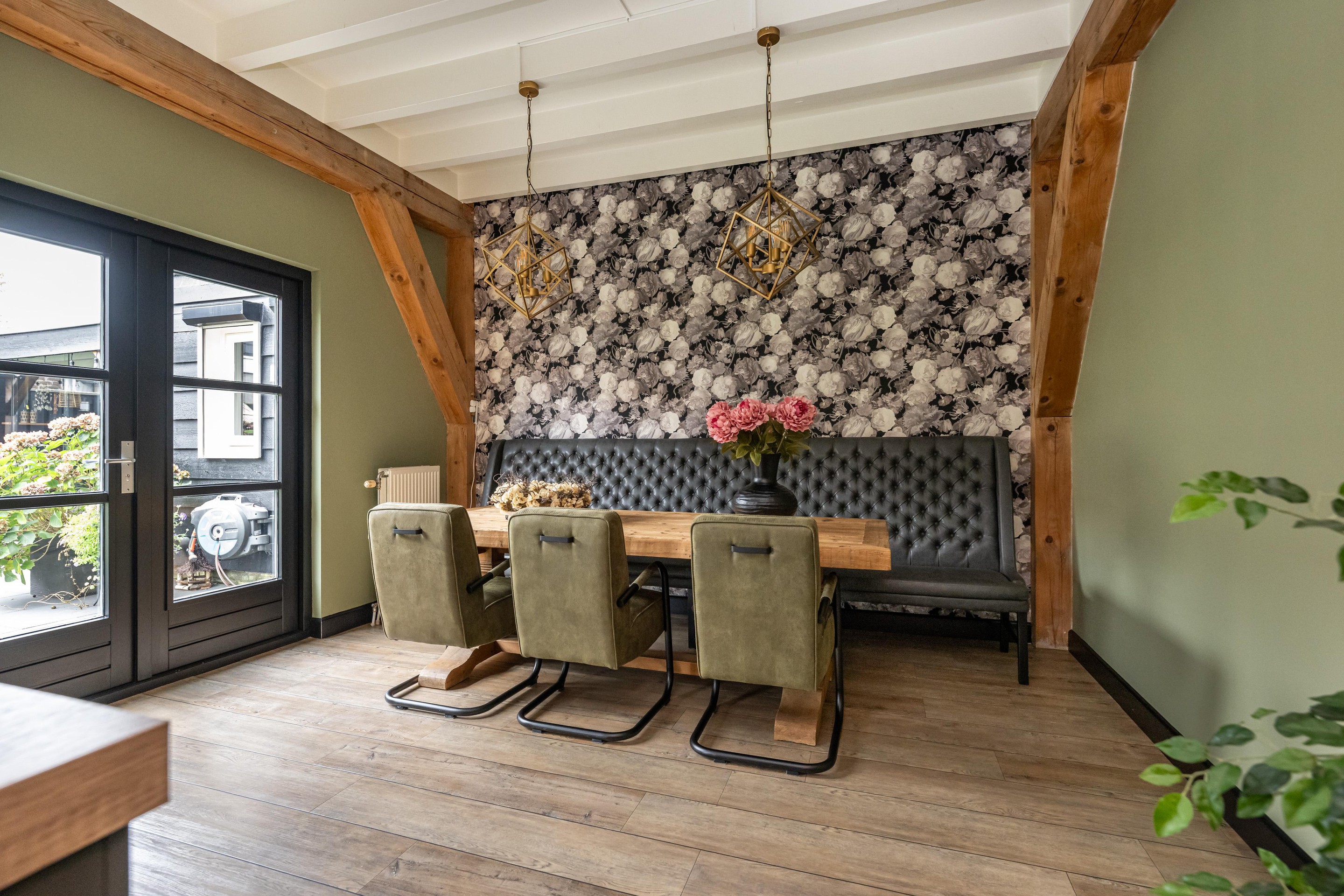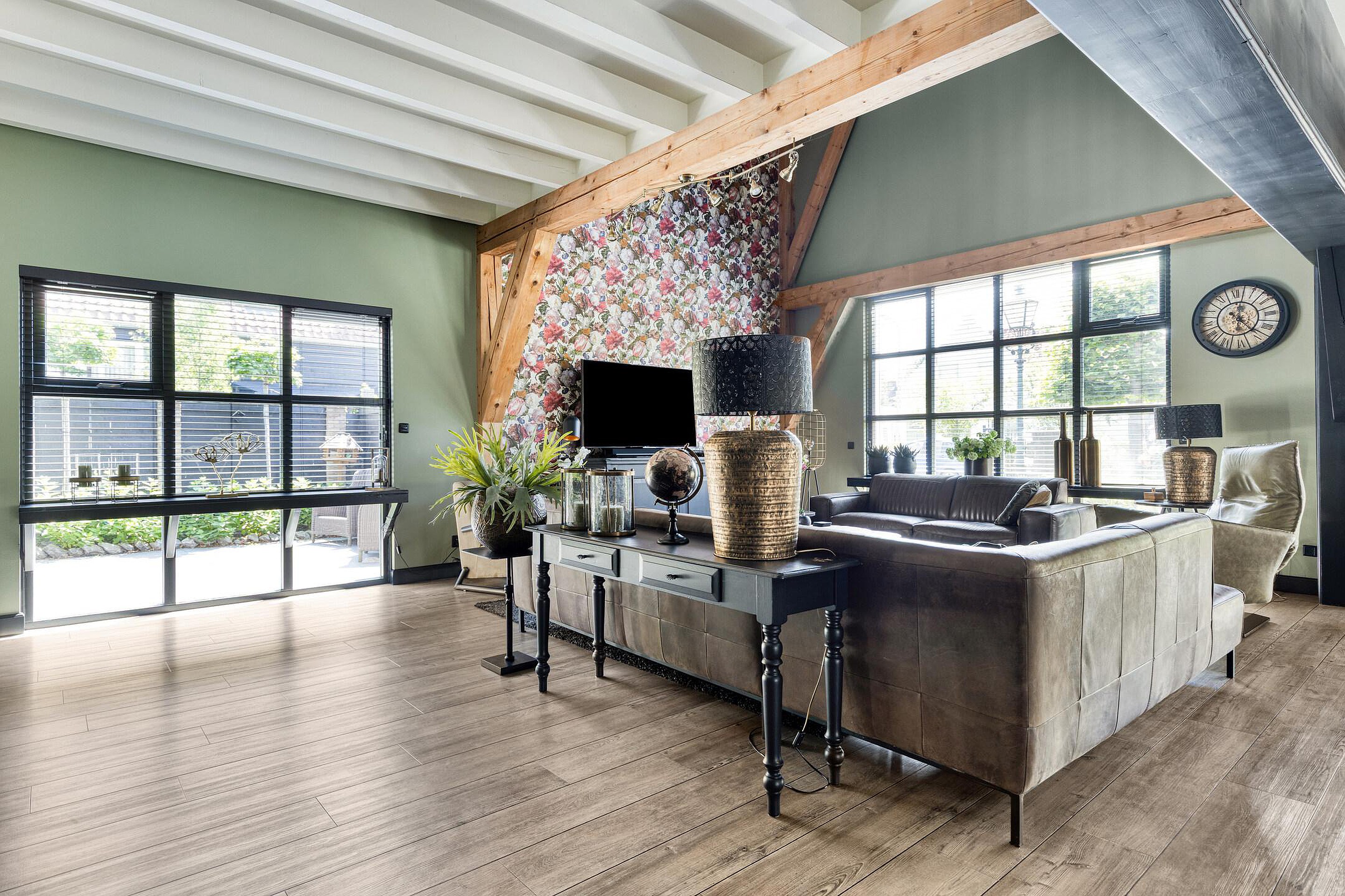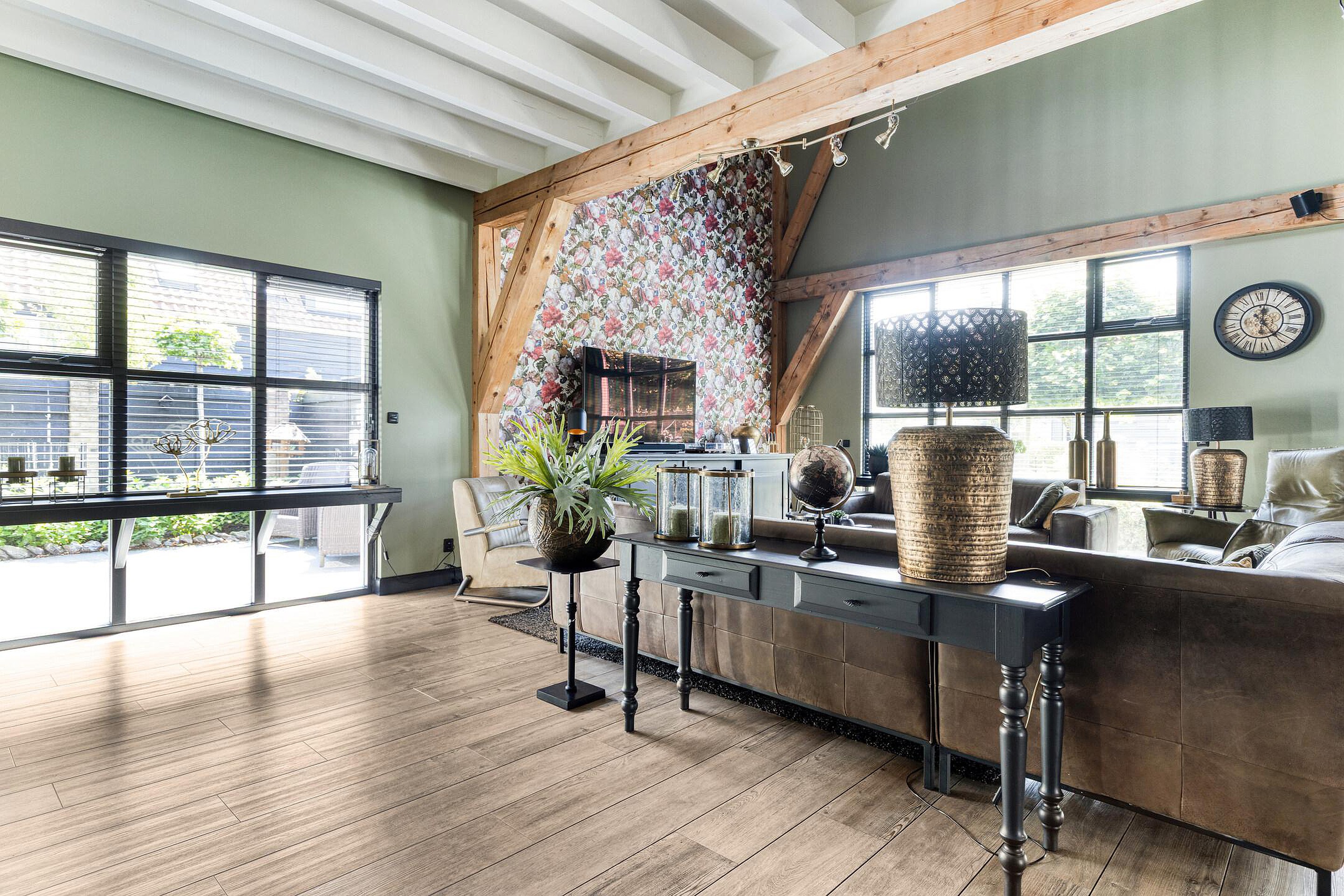 De woonkamer combineert sfeer en gezelligheid dankzij de originele houten draagbalken en een knusse gashaard. En de luxe tuinkamer met glazen schuifdeuren maakt het mogelijk om het hele jaar door te genieten van je tuin – of het nu stormt of stralend zonnig is.