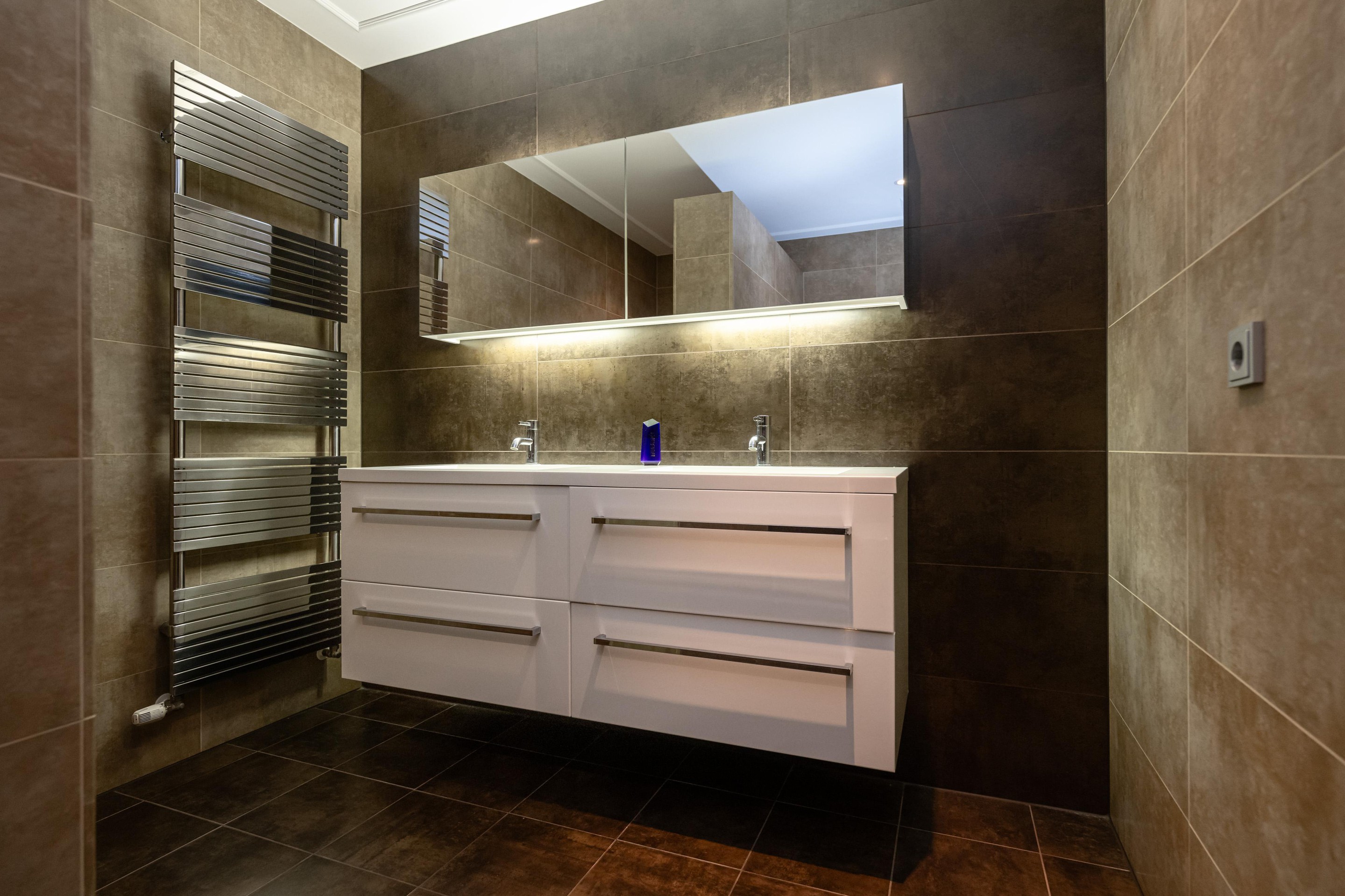 Eerste verdieping Overloop, 2 ruime slaapkamers met airco, een moderne badkamer met douche, dubbele wastafel, zwevend toilet, vloerverwarming en vide.