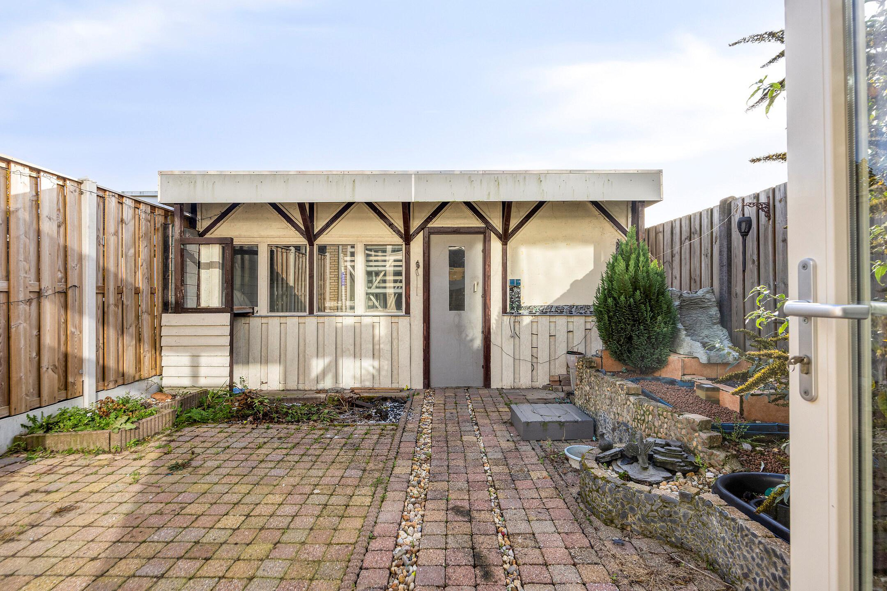 Tuin De achtertuin is prettig van formaat en biedt voldoende ruimte voor zowel een loungehoek als een eettafel. Achterin staat een praktische berging voor fietsen en opslag.