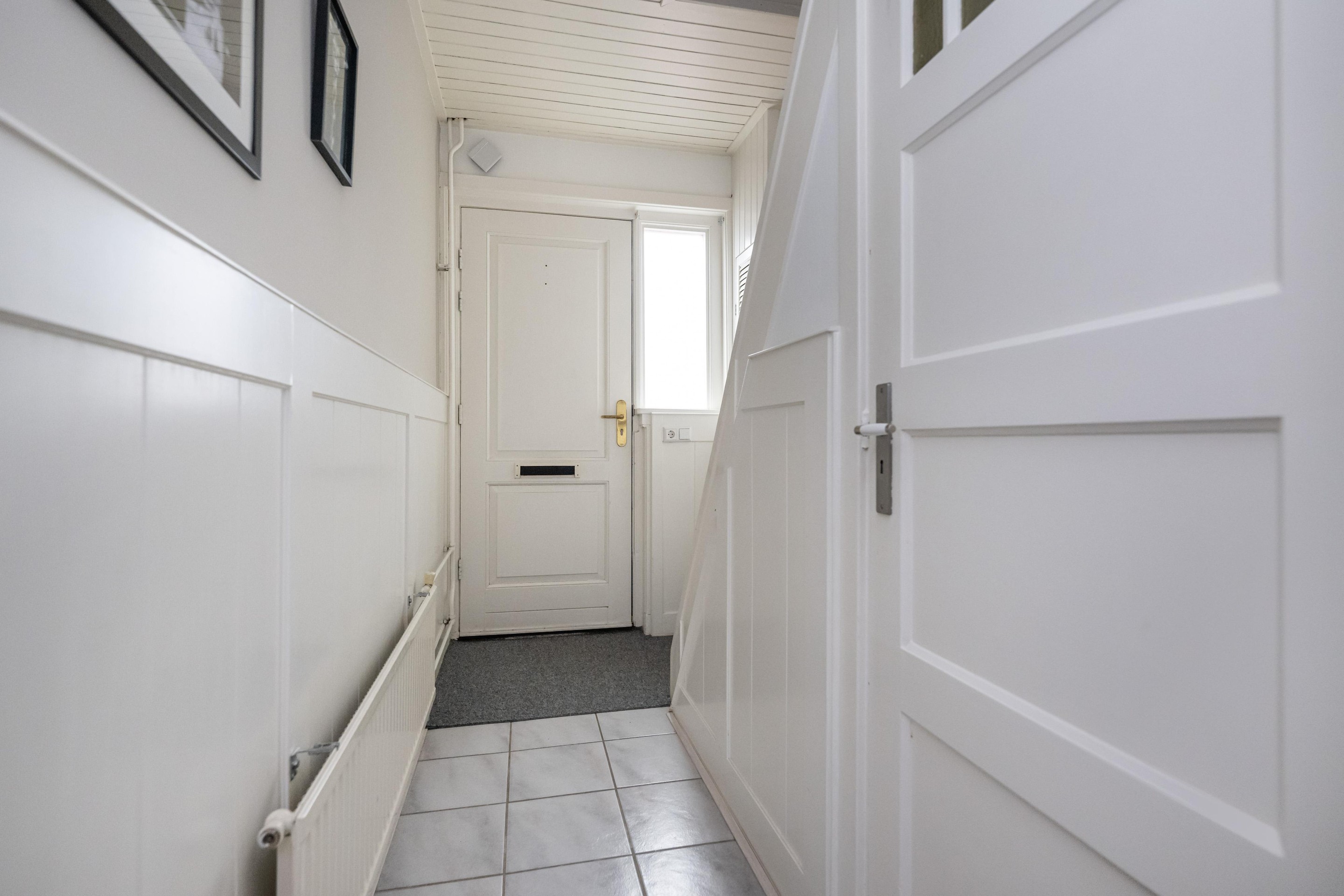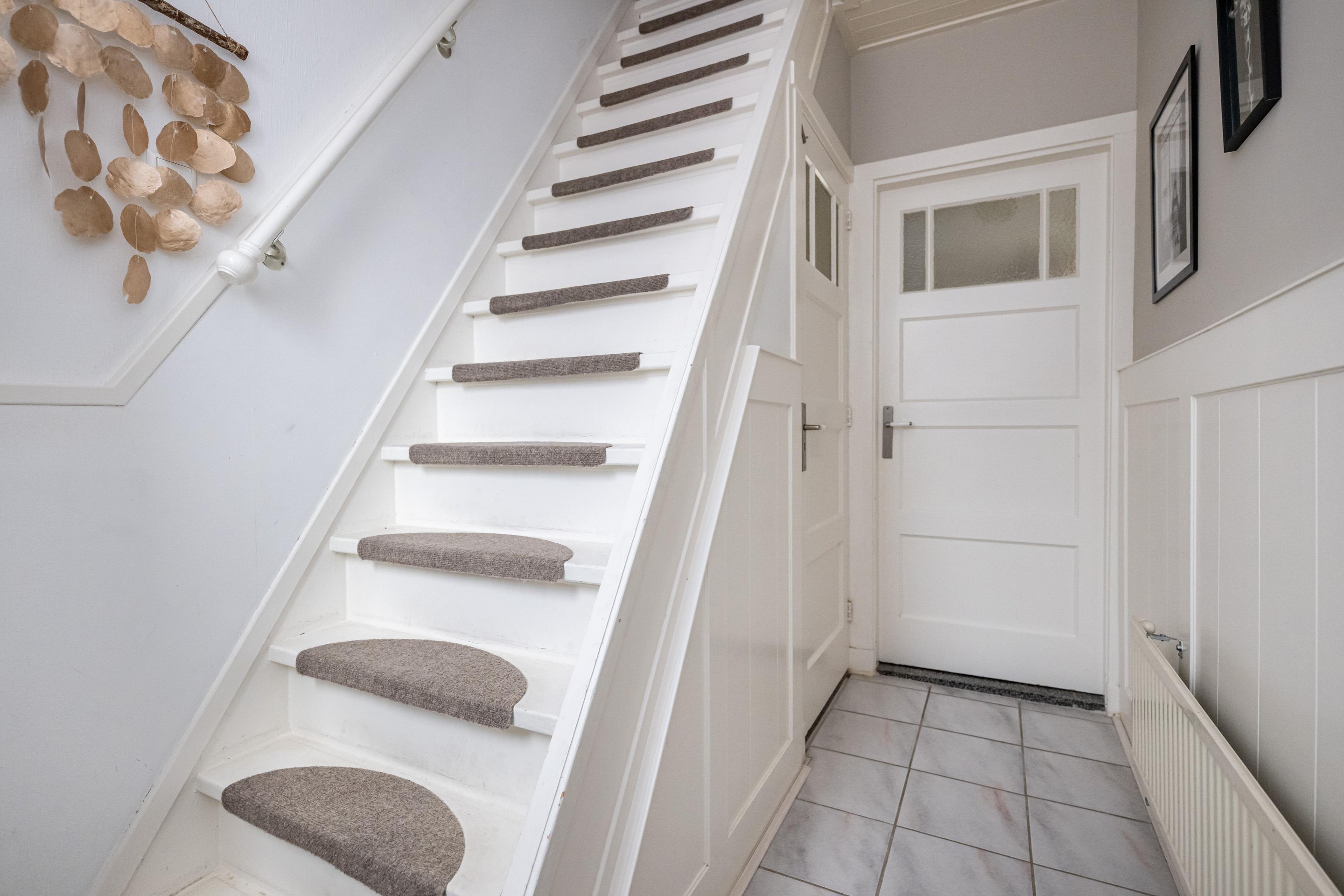 Plavuizenvloer, radiator, meterkast, trapkast en trapopgang.