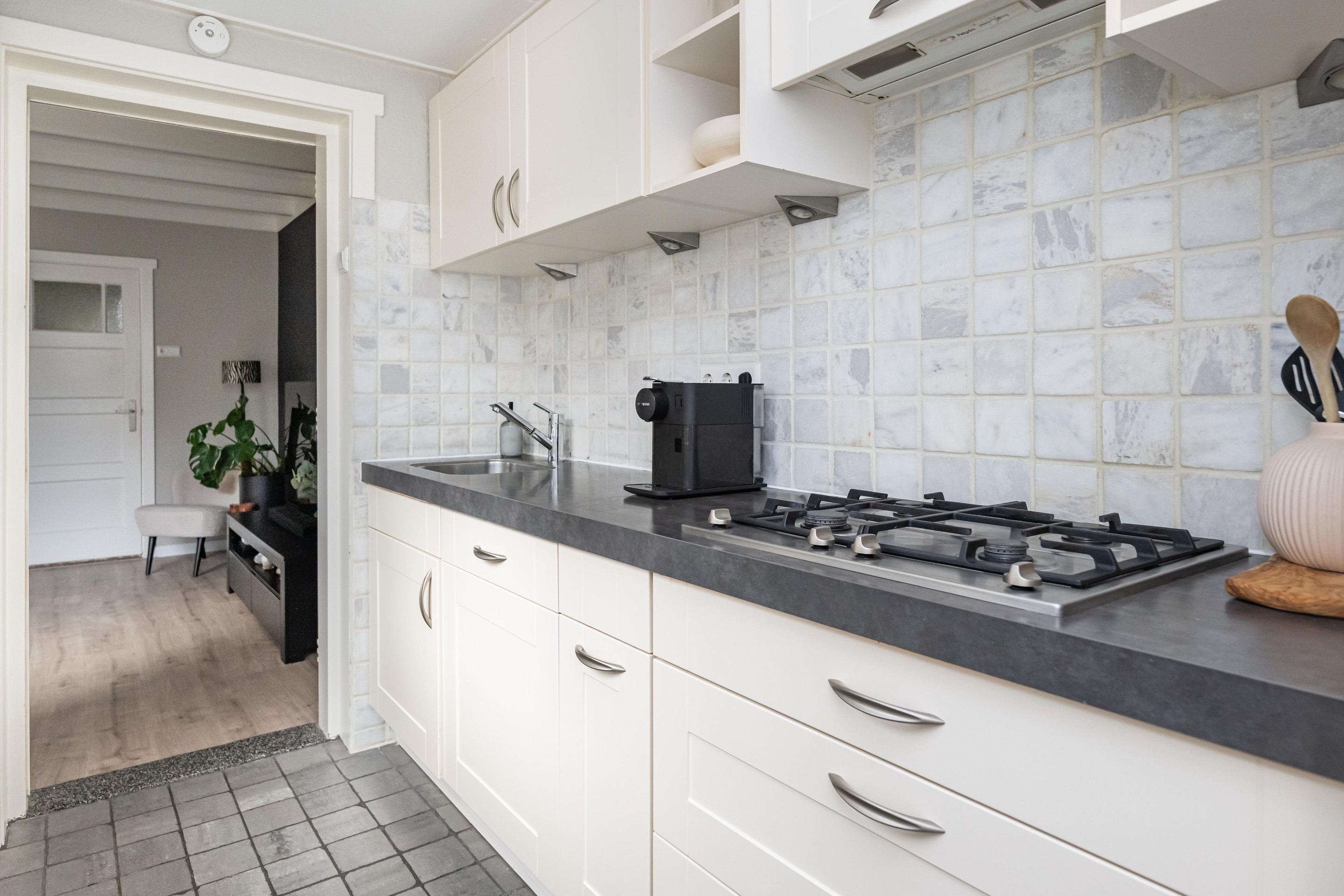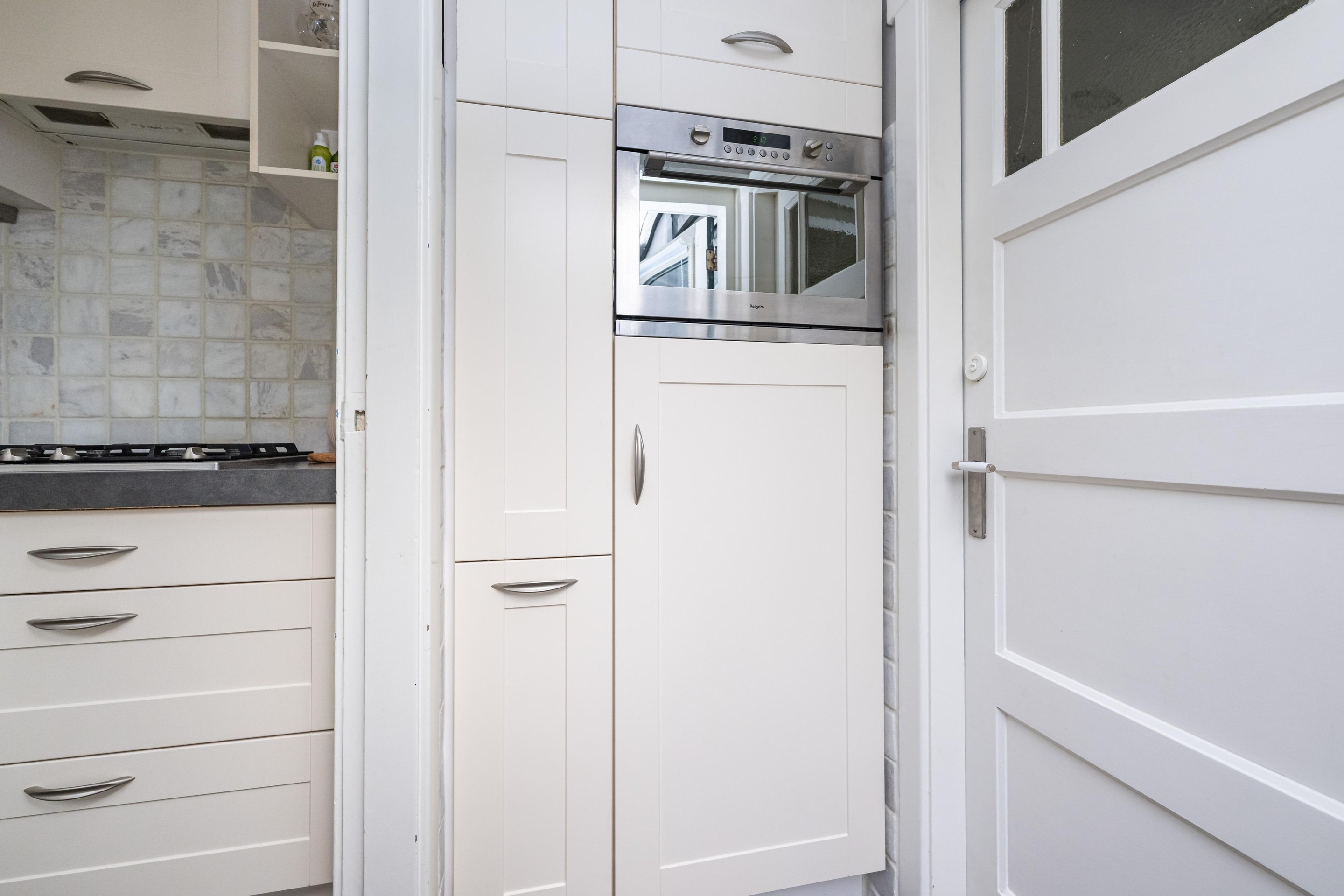 Plavuizenvloer, 4-pits gaskookplaat, afzuigkap, enkele spoelbak, vaatwasser, koelkast, apothekerskast, combi-oven, radiator, rolluik en deur naar achtertuin.
