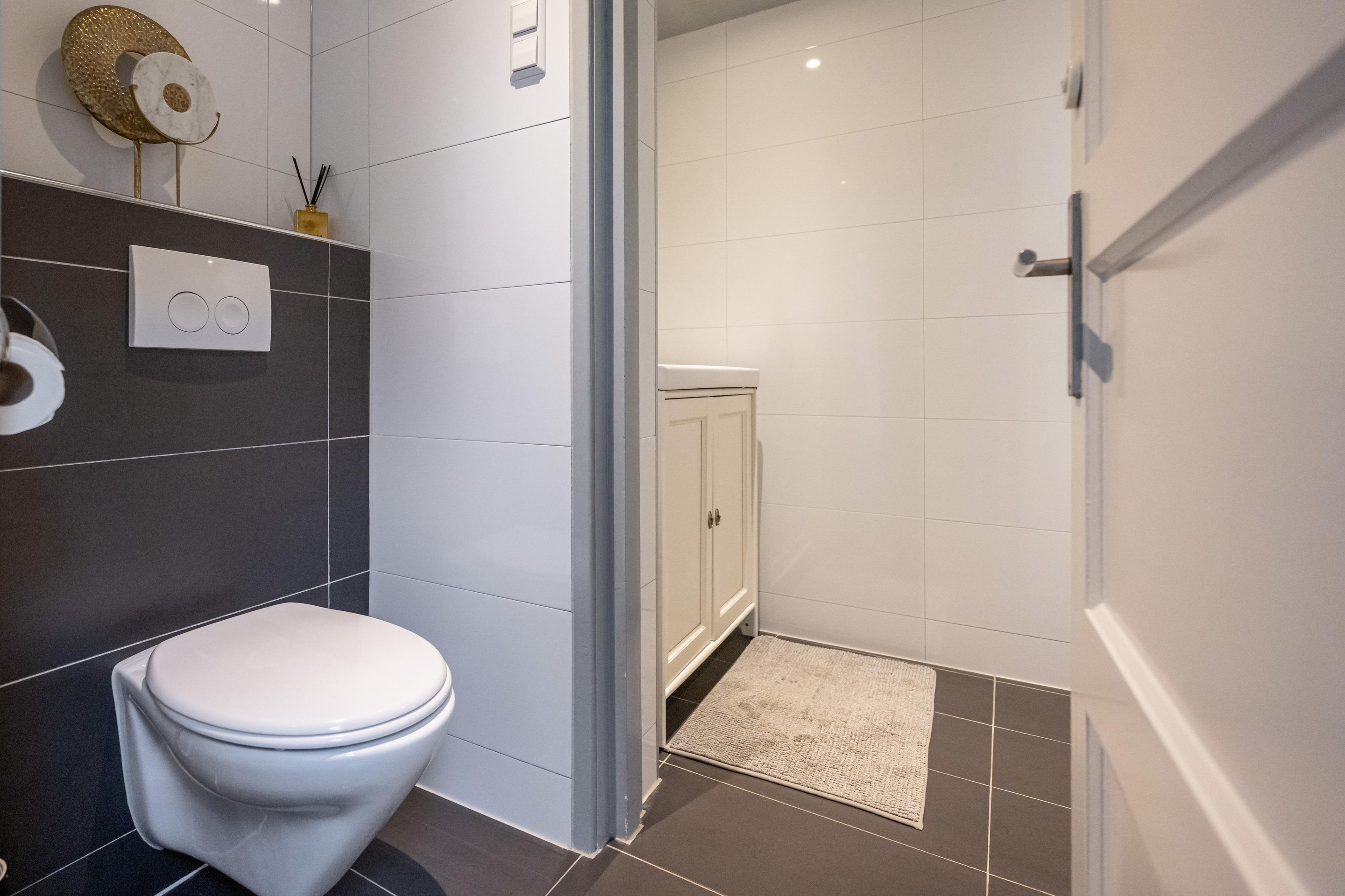 Inloopdouche, zwevend toilet, wastafel met meubel, vloerverwarming en geheel betegeld.