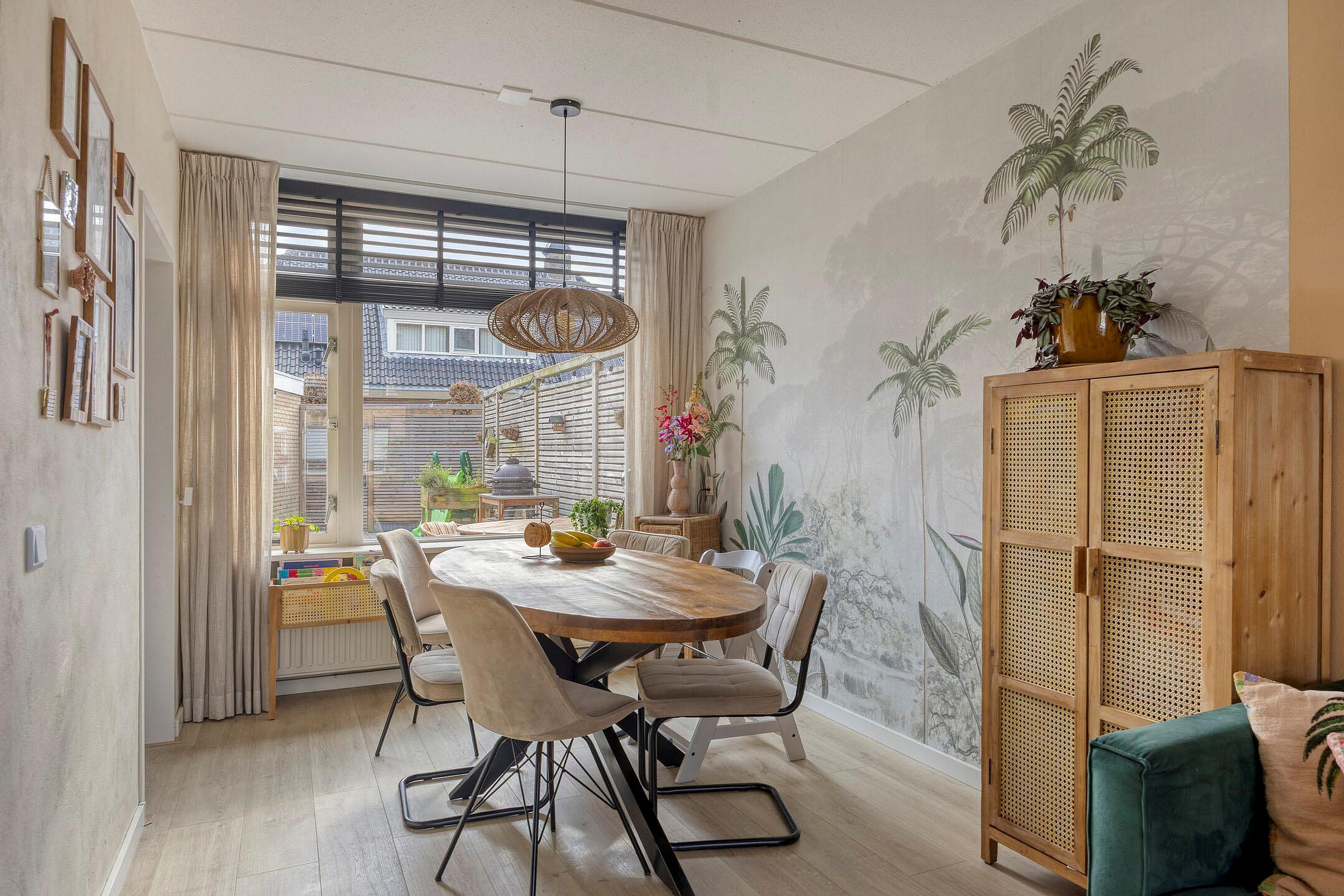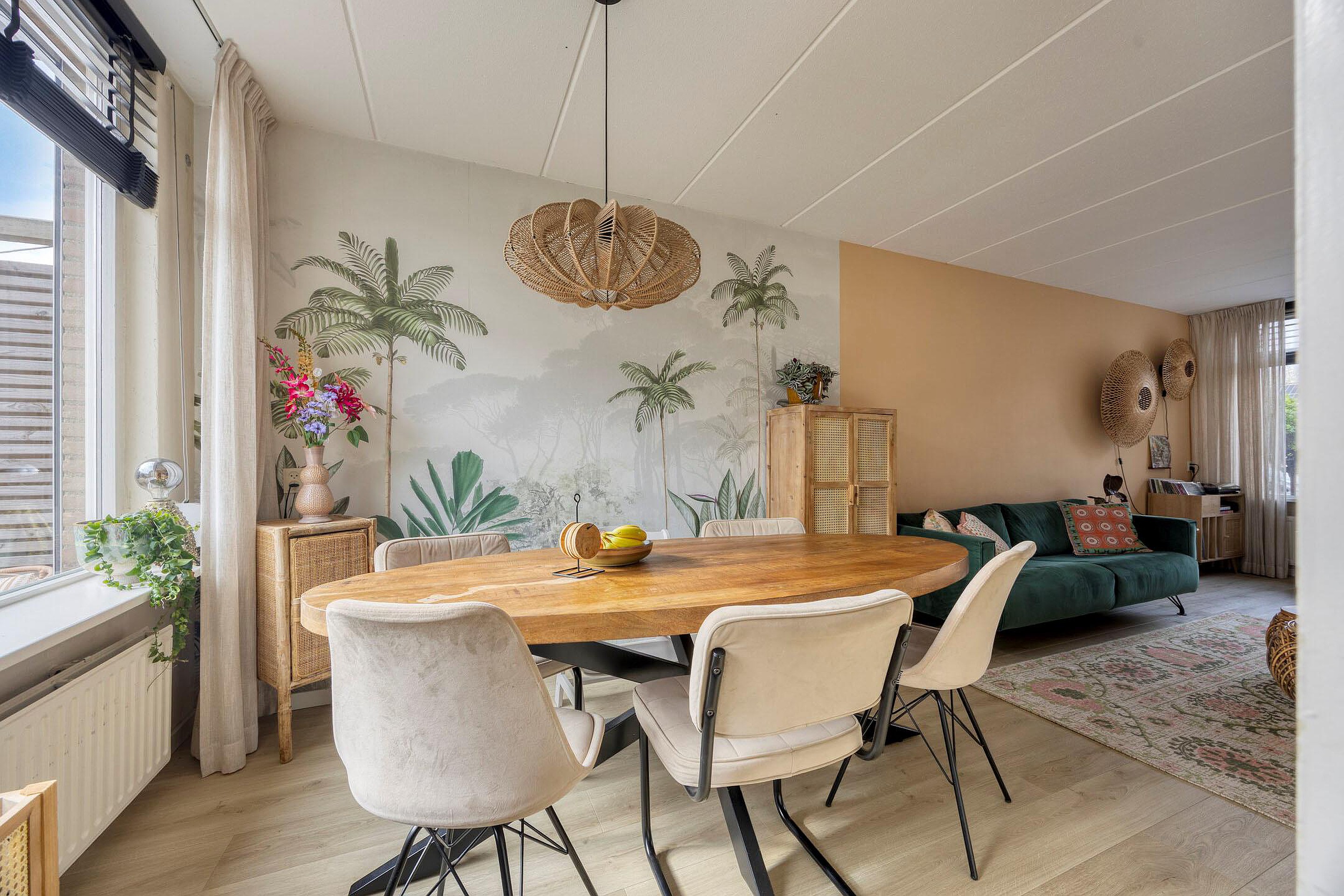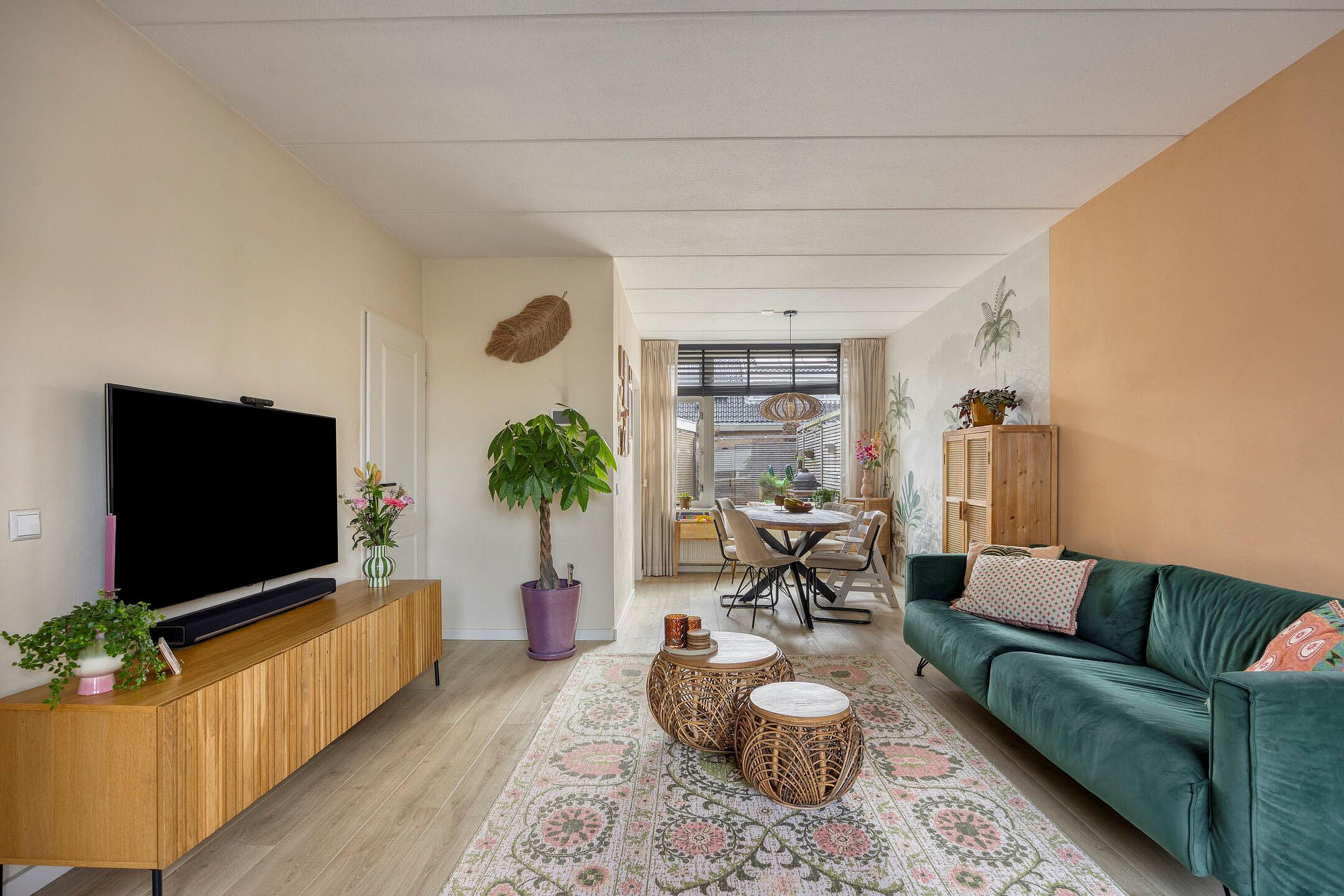 Via de hal, met toilet en trapopgang, kom je in de woonkamer. Deze strekt zich uit over de volledige diepte van de woning en heeft dankzij de raampartijen een prettige lichtinval. Er is voldoende ruimte voor zowel een zit- als eethoek.