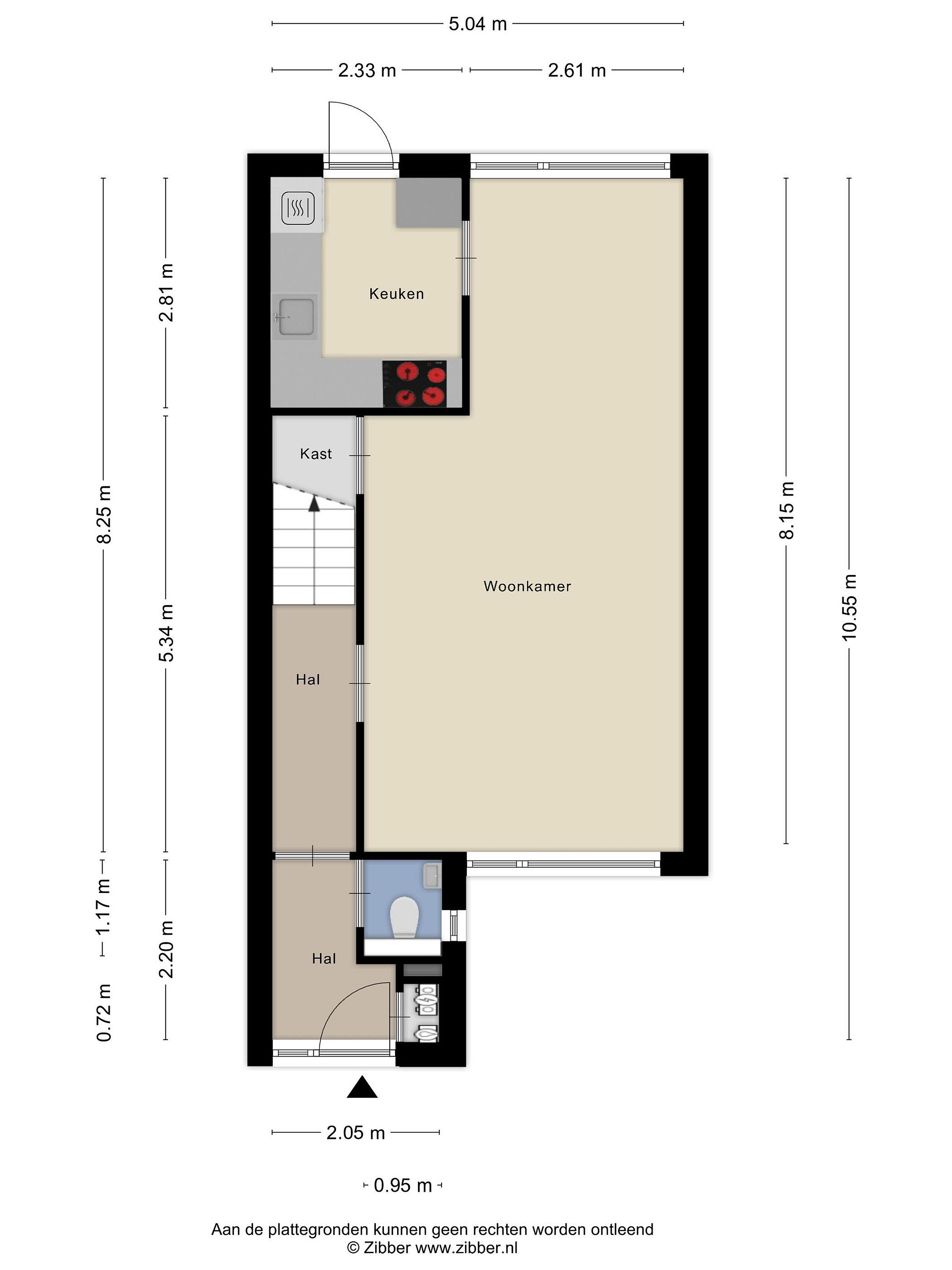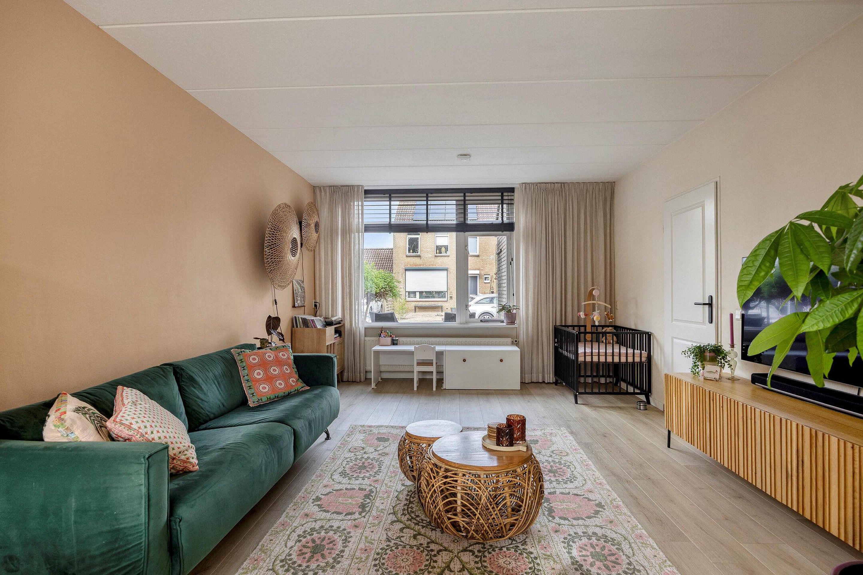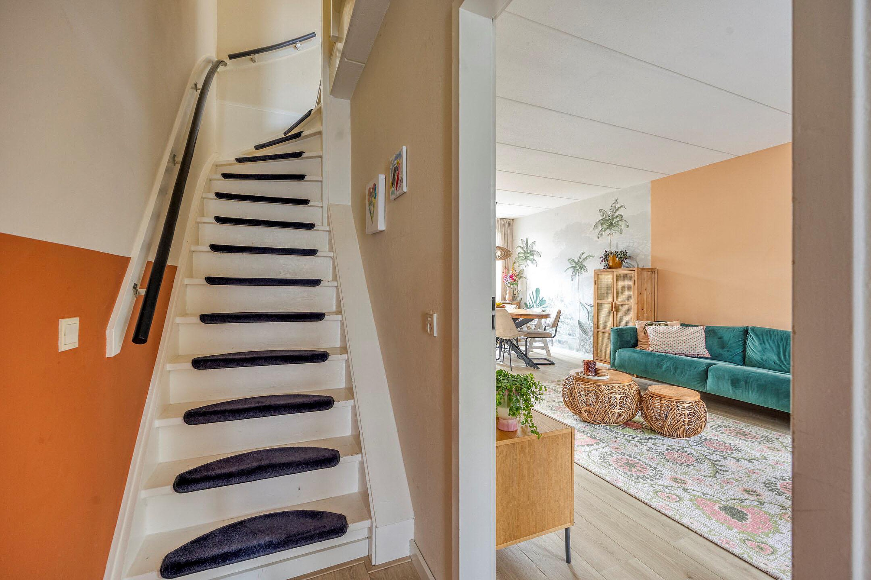Via de hal, met toilet en trapopgang, kom je in de woonkamer. Deze strekt zich uit over de volledige diepte van de woning en heeft dankzij de raampartijen een prettige lichtinval. Er is voldoende ruimte voor zowel een zit- als eethoek.