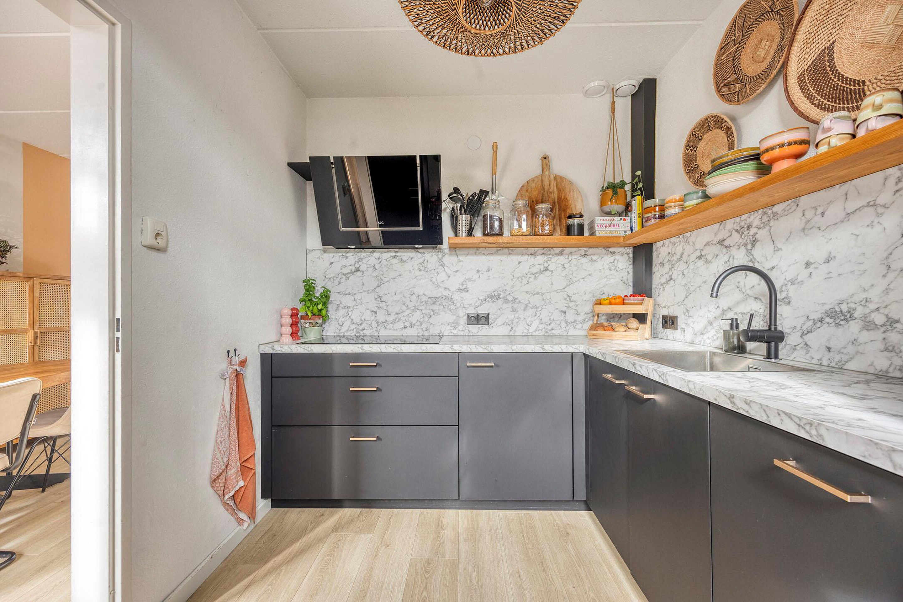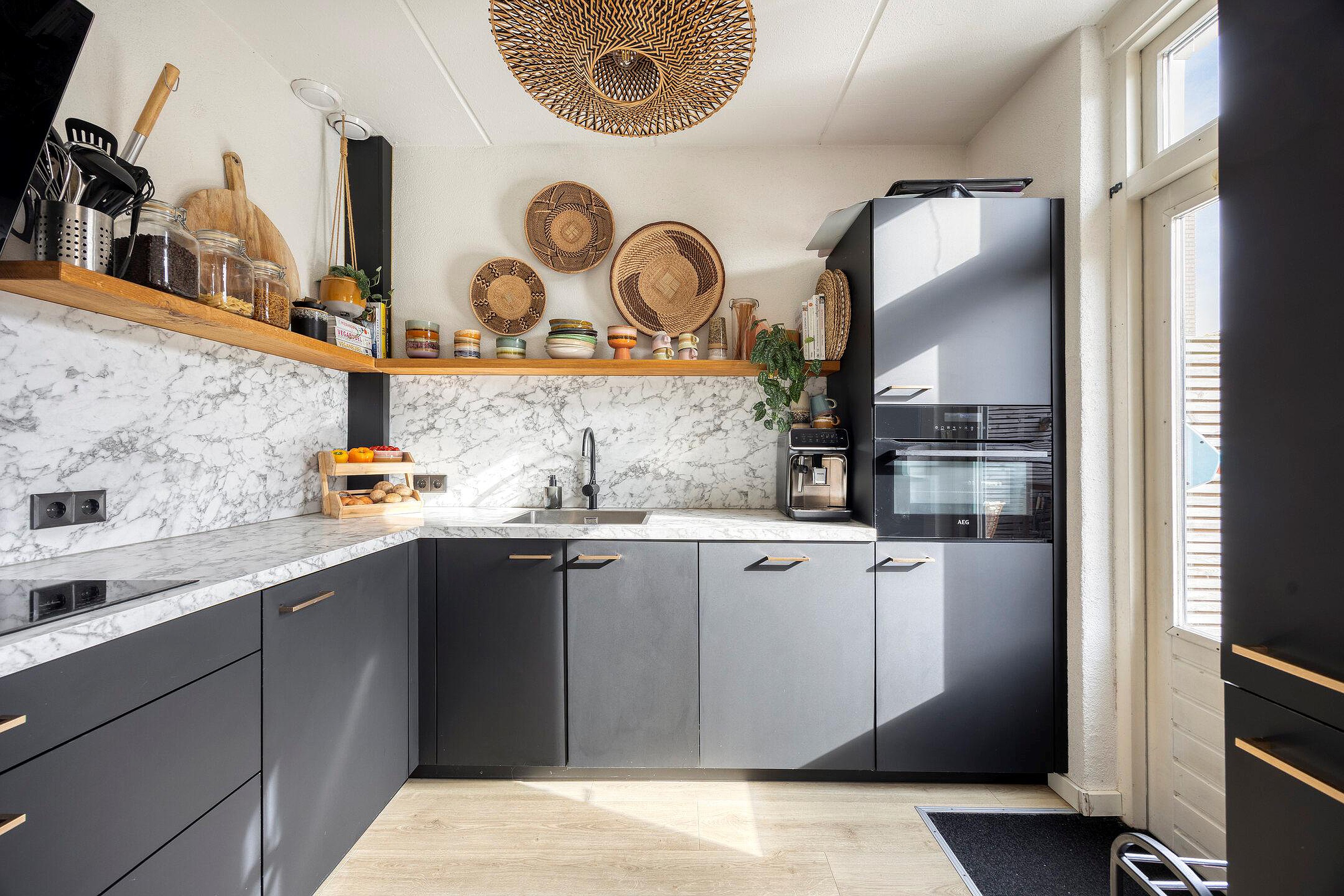 Aan de achterzijde bevindt zich de zwarte met marmerlook keuken, opgesteld in een praktische opstelling en voorzien van diverse inbouwapparatuur, waaronder een combi-oven, vaatwasser en inductiekookplaat. Vanuit de keuken is er toegang tot de tuin
