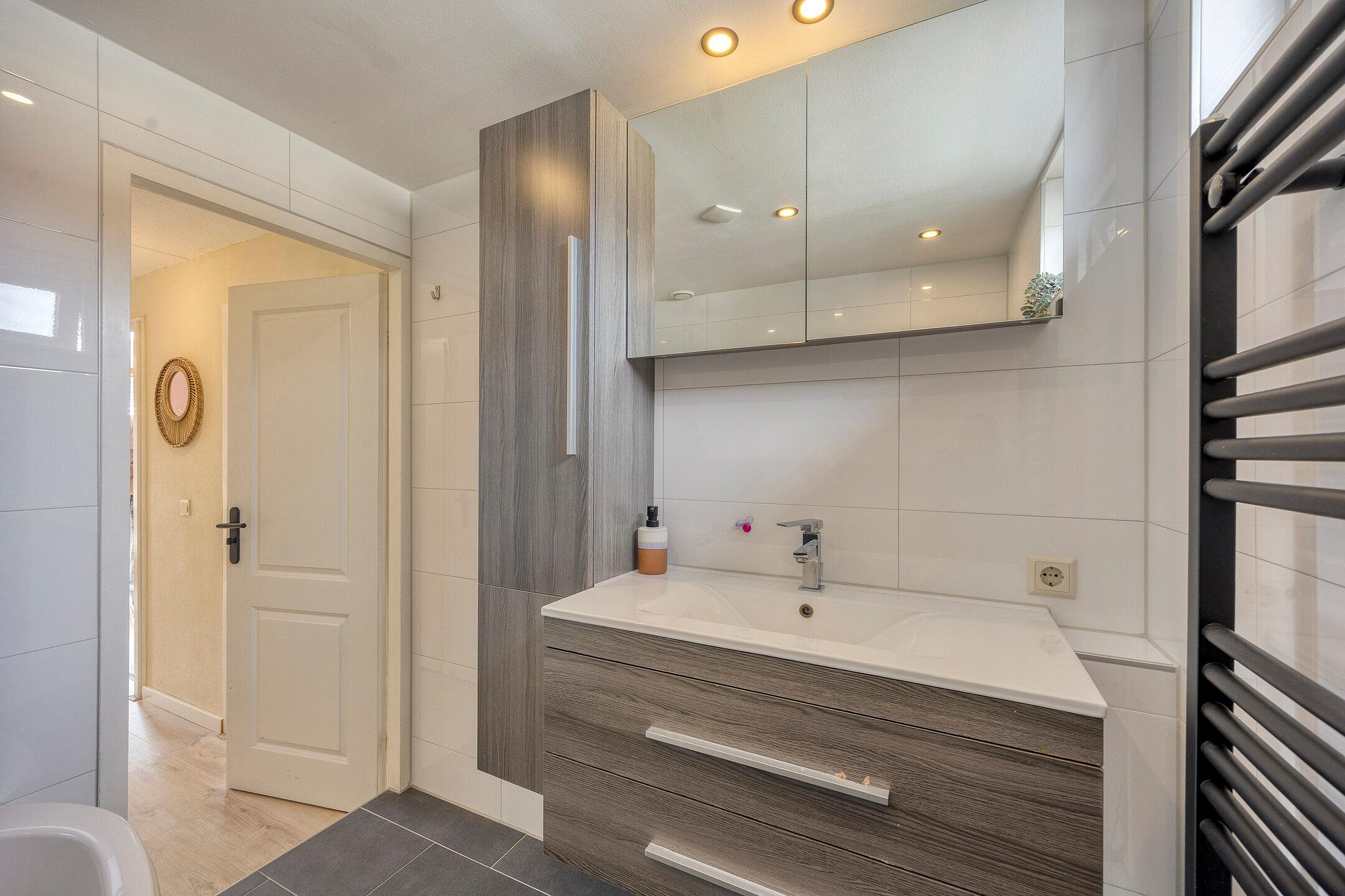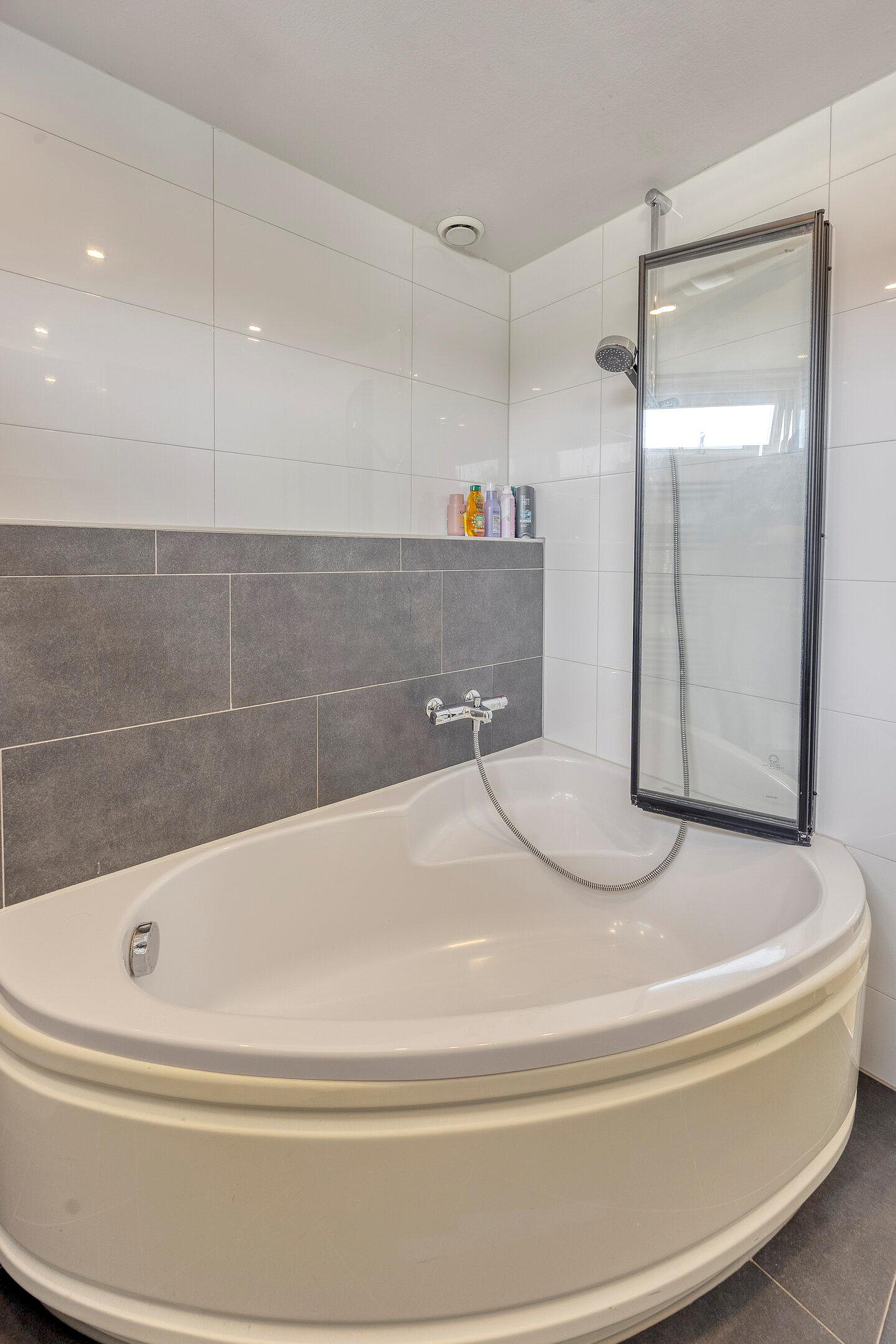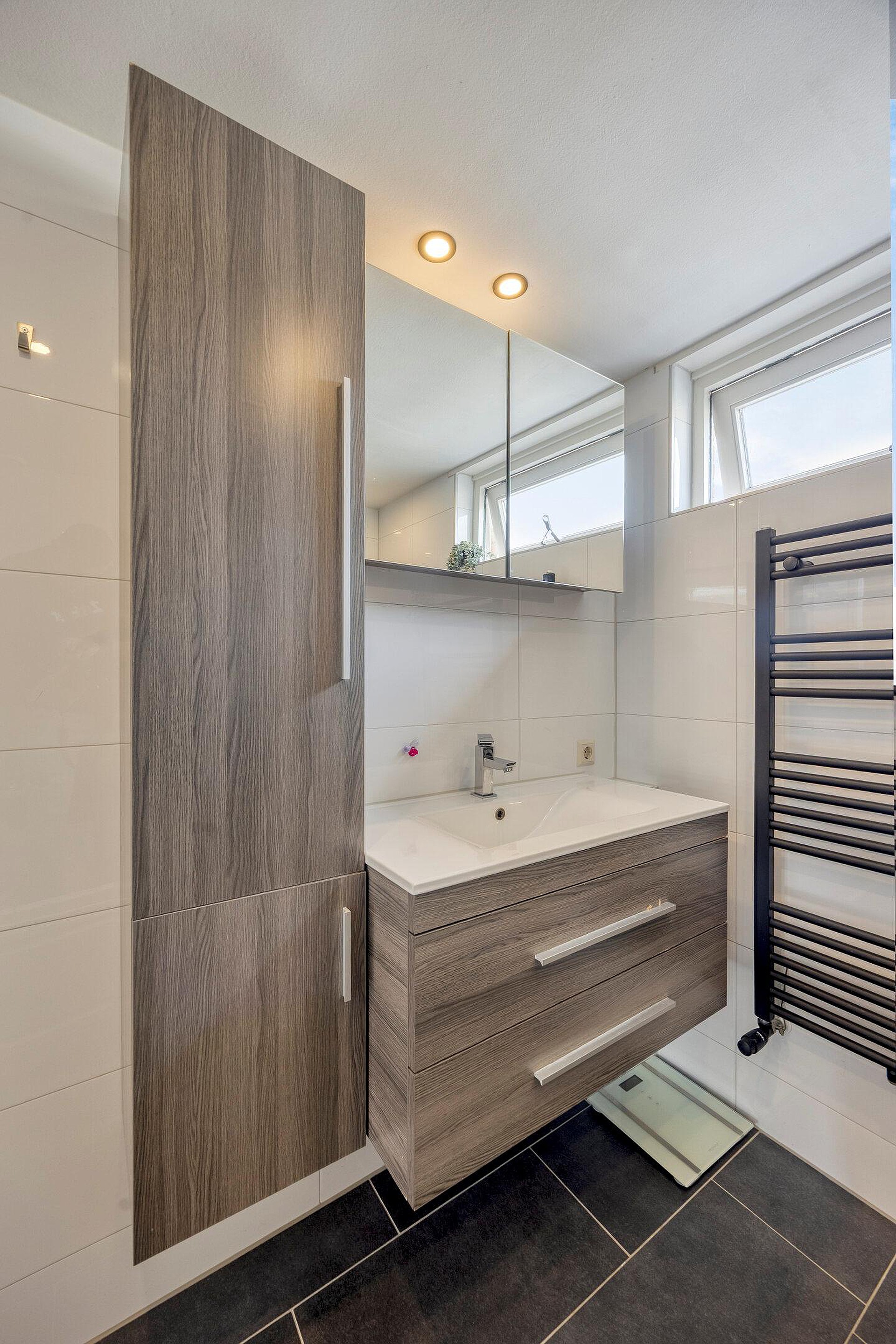Op de eerste verdieping bevinden zich drie slaapkamers van goed formaat. De badkamer is uitgerust met een bad-douchecombinatie, wastafelmeubel en toilet. Ook is er een aparte ruimte waar wasapparatuur kan worden aangesloten. De ruimtes maken deze verdieping geschikt voor zowel een gezin als voor bijvoorbeeld een thuiswerkplek.