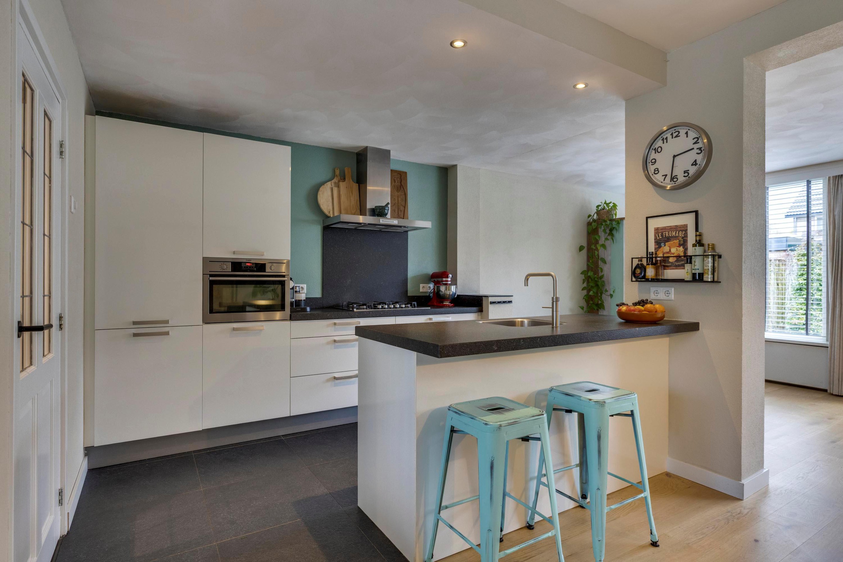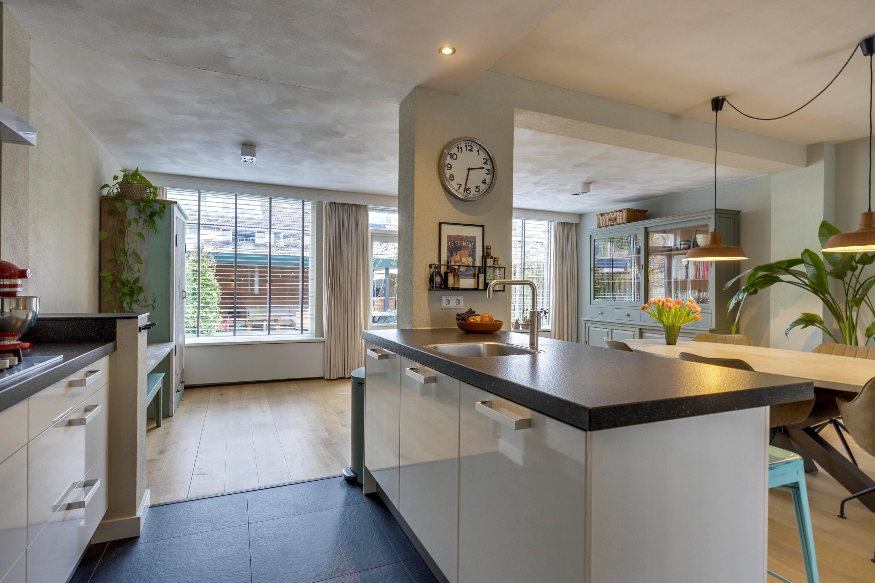 Via de verzorgde voortuin bereikt u de overdekte entree. De ontvangsthal is keurig afgewerkt met een houten vloer, stucwerk en inbouwspots. Hier vindt u de meterkast, de trapopgang, een praktische trapkast en de moderne toiletruimte. Deze is vernieuwd in 2018, deels betegeld en voorzien van een vrijdragend toilet en inbouwspots. Zodra u de woonkamer binnenstapt, ervaart u direct de ruimte en de gezellige sfeer. De woning is aan de achterzijde royaal uitgebouwd, waardoor er een fijne leefruimte is ontstaan. Aan de voorzijde geniet u van een knus zitgedeelte met open haard, terwijl de achterzijde zich perfect leent voor een royale eethoek met zicht op de tuin. De achterdeur met plissé hordeur brengt u naar de tuin. De open keuken vormt het hart van de woning en is zowel praktisch als stijlvol ingericht. Met een spoeleiland inclusief eetbar en een wandopstelling beschikt u over volop werk- en bergruimte. De keuken is uitgerust met diverse inbouwapparatuur, waaronder een vijfpits gaskookplaat, afzuigkap, combi-oven, koelkast, vriezer, vaatwasser en een Quooker (vaatwasser en Quooker vernieuwd in 2022).