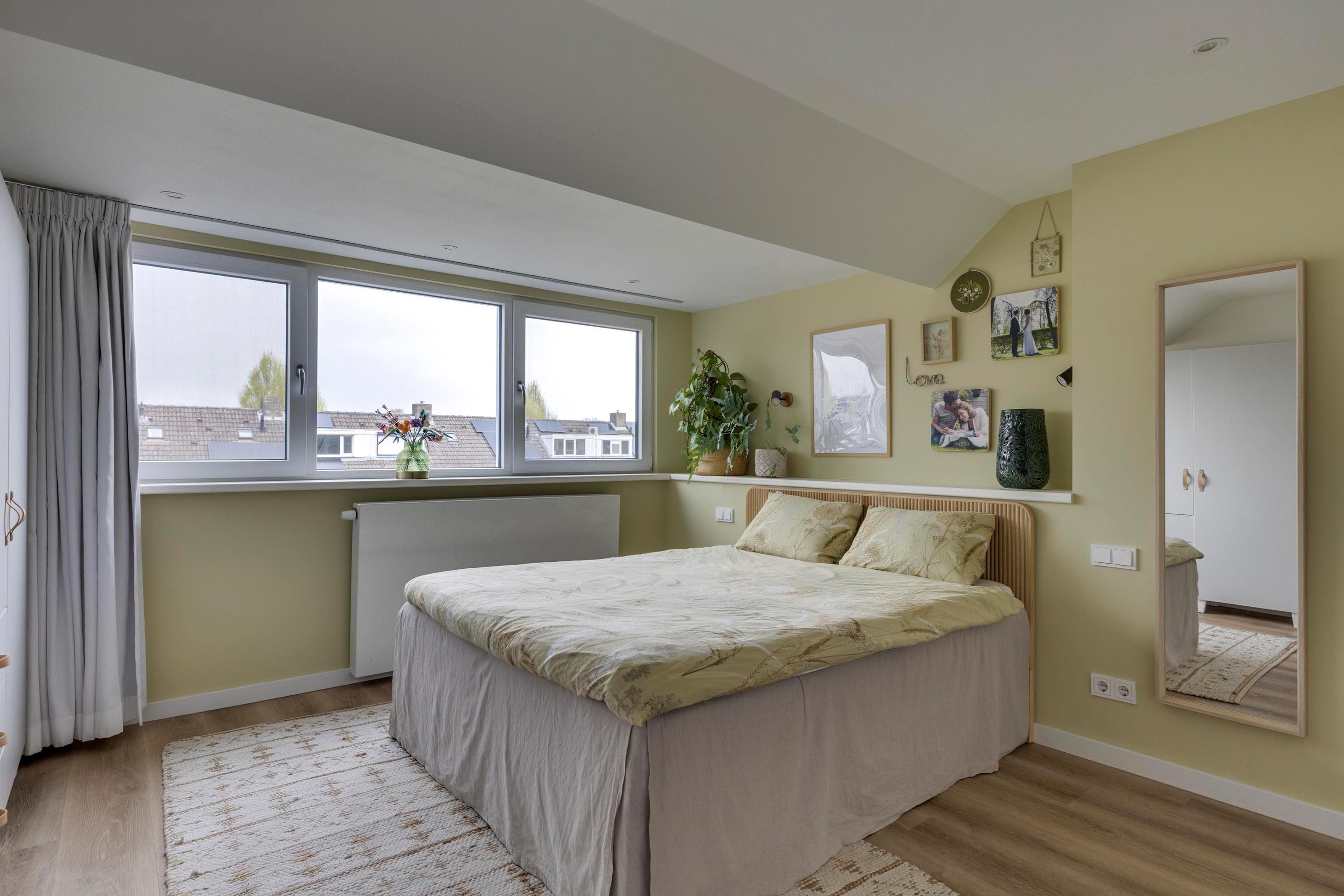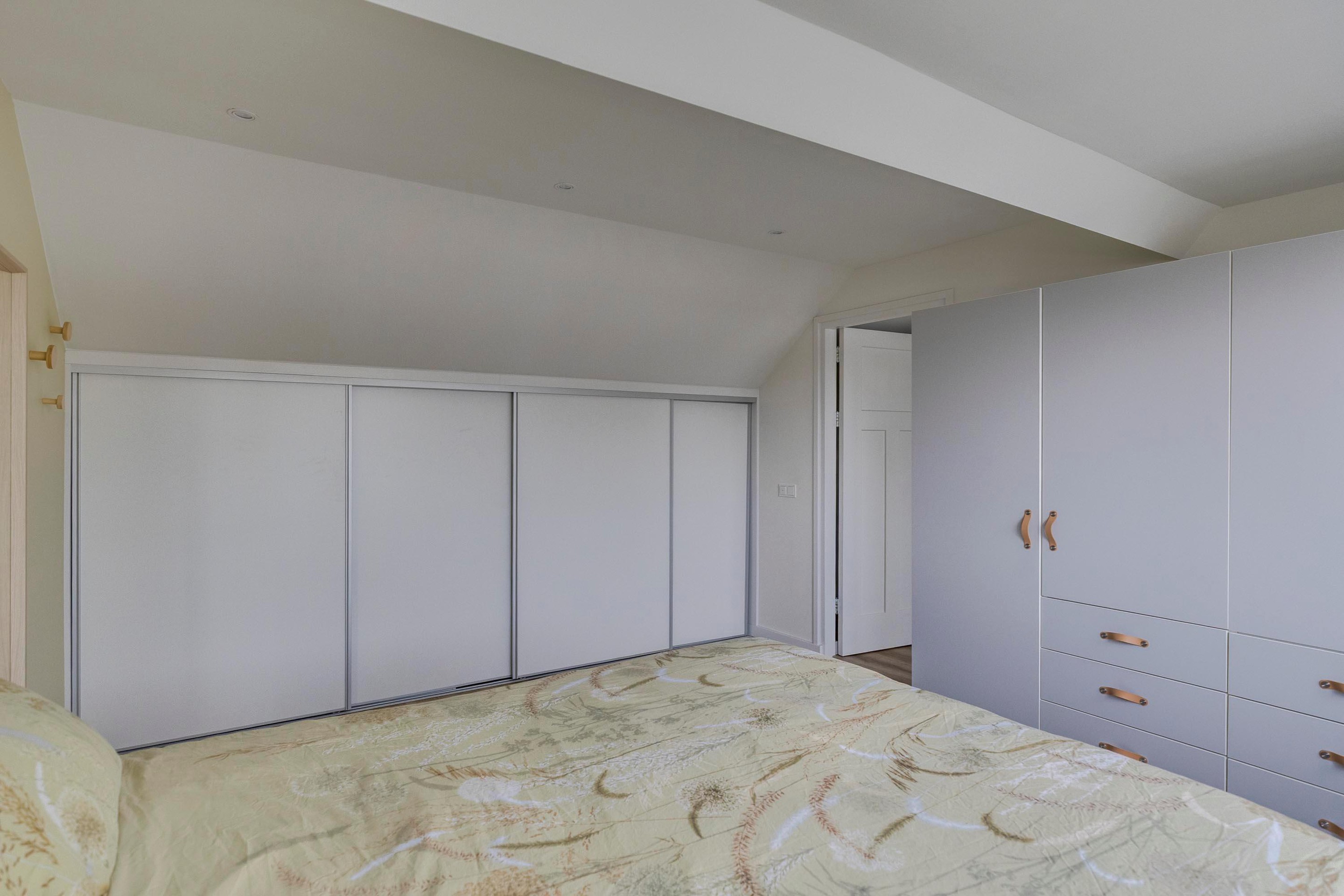 De voorzolder is voorzien van een dakkapel, vaste kastenwand met daarin de opstelling van de HR-combiketel Remeha (2015), de omvormer voor de zonnepanelen en de aansluitingen voor uw wasapparatuur. Tevens is er nog een extra bergkast aanwezig. Tenslotte bereikt u de vierde slaapkamer. Dankzij de grote dakkapel (met hor) aan de tuinzijde geniet u hier van extra ruimte en veel natuurlijk licht, waardoor deze kamer zich perfect leent als volwaardige slaapkamer, werk- of hobbykamer. Ook hier zijn vaste schuifwandkasten en inbouwspotjes aanwezig.