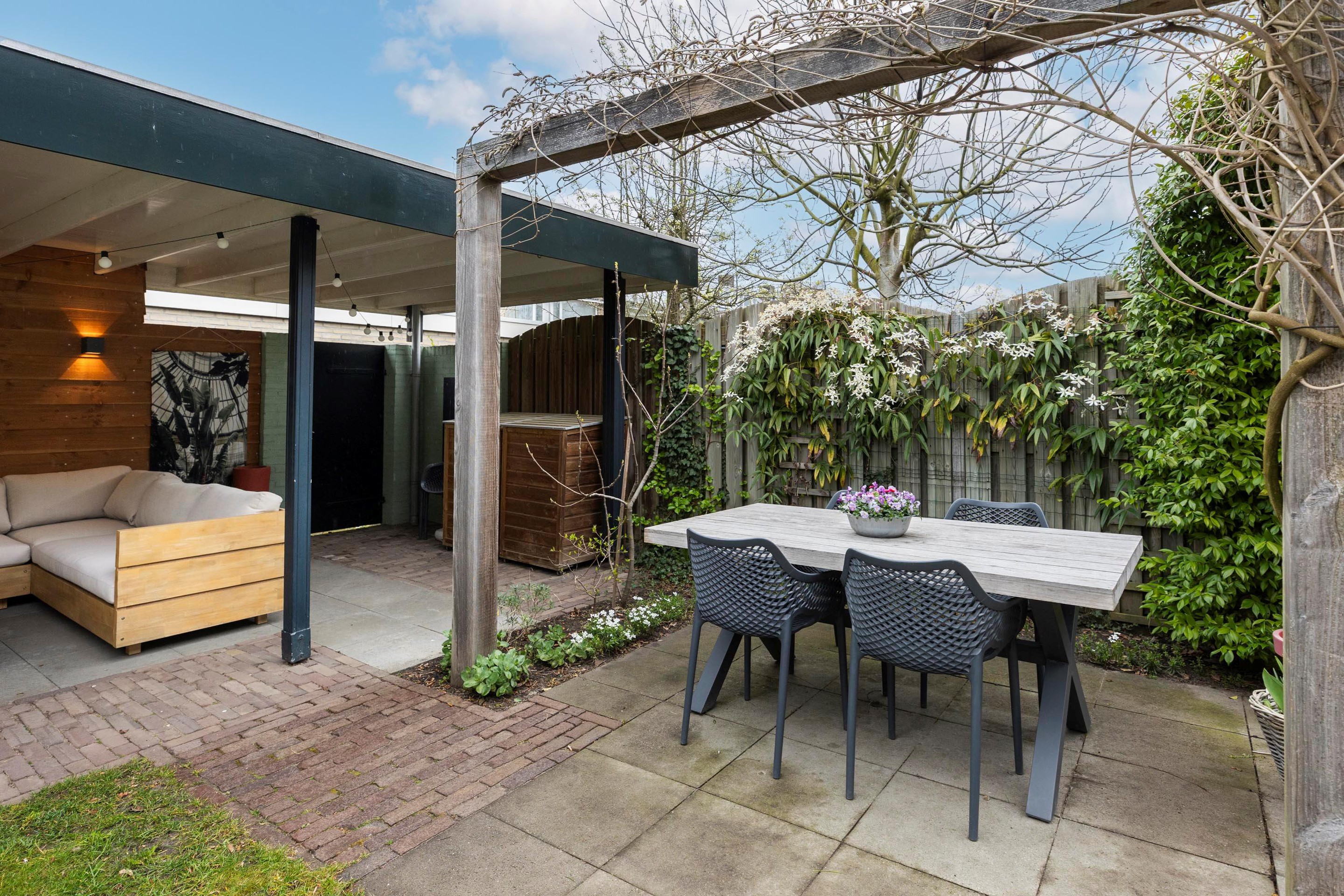 De achtertuin is voorzien van 2 terrassen waarvan 1 royaal overdekt terras achter in de tuin, en 1 terras aan de zijkant in het midden van de tuin. Het overdekte terras beschikt over sfeervolle wandlampjes en biedt tevens toegang tot de achterom. Daarnaast zijn er een speelgazon, vaste beplanting en een buitenkraantje aanwezig.