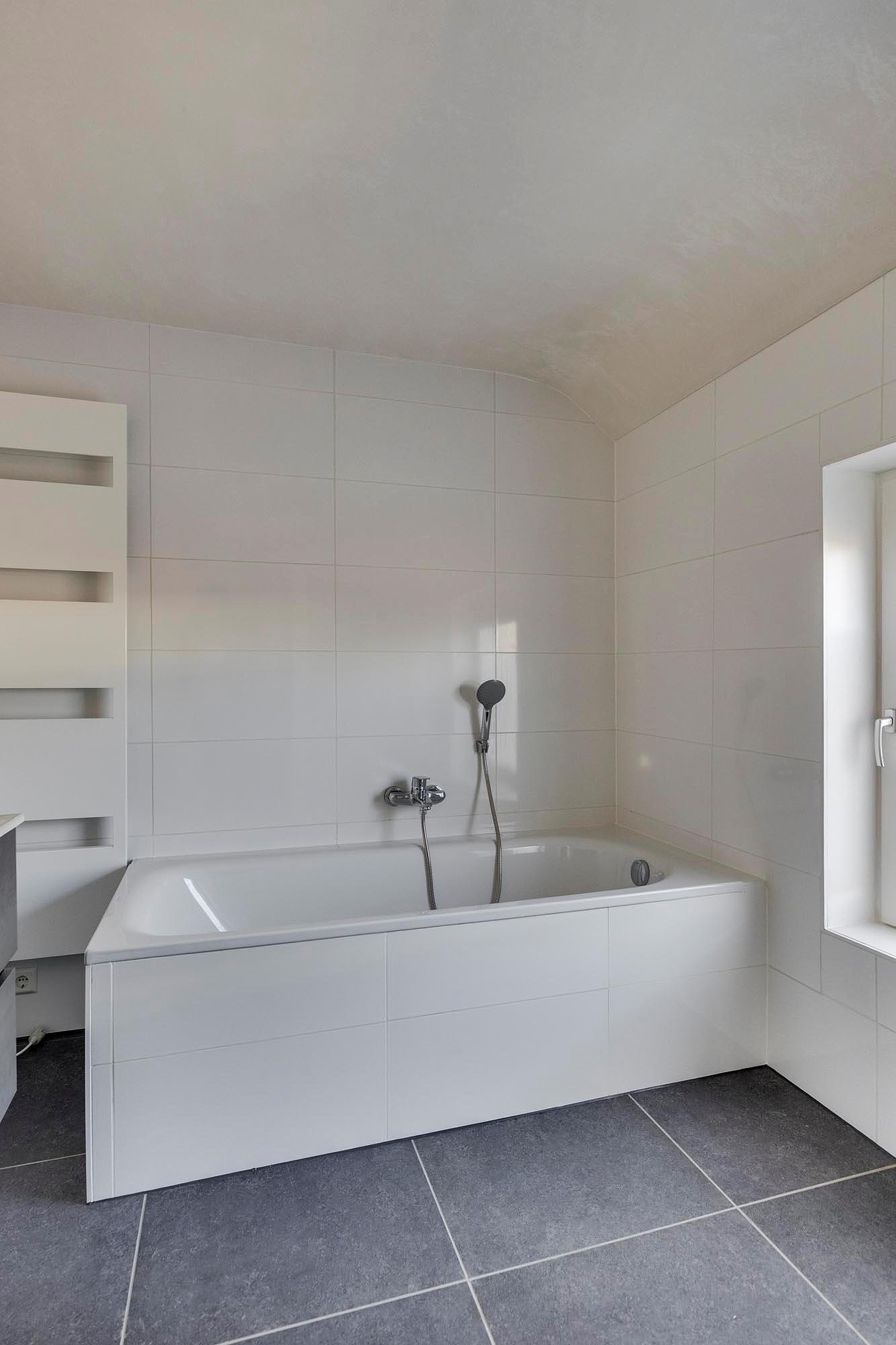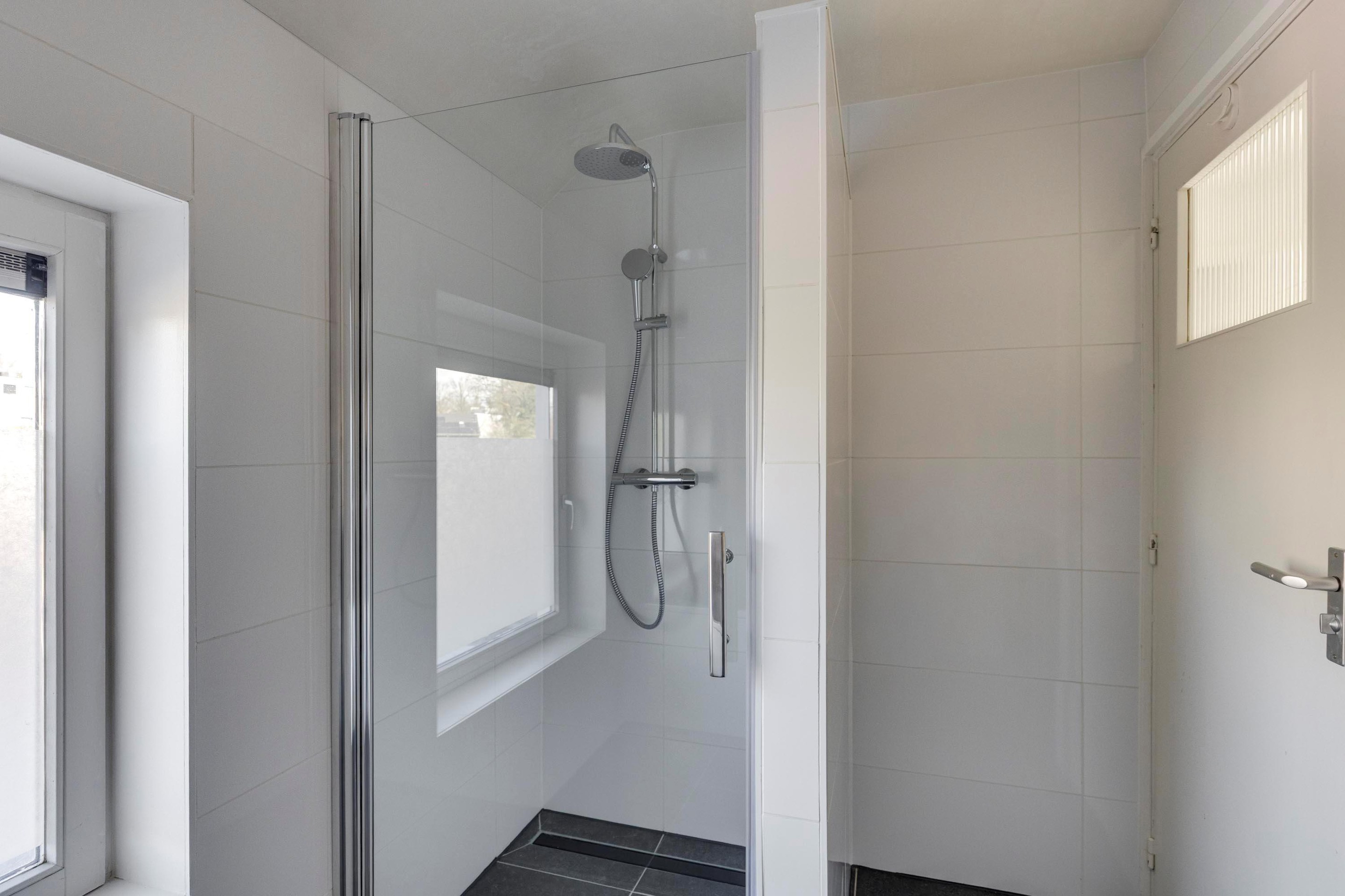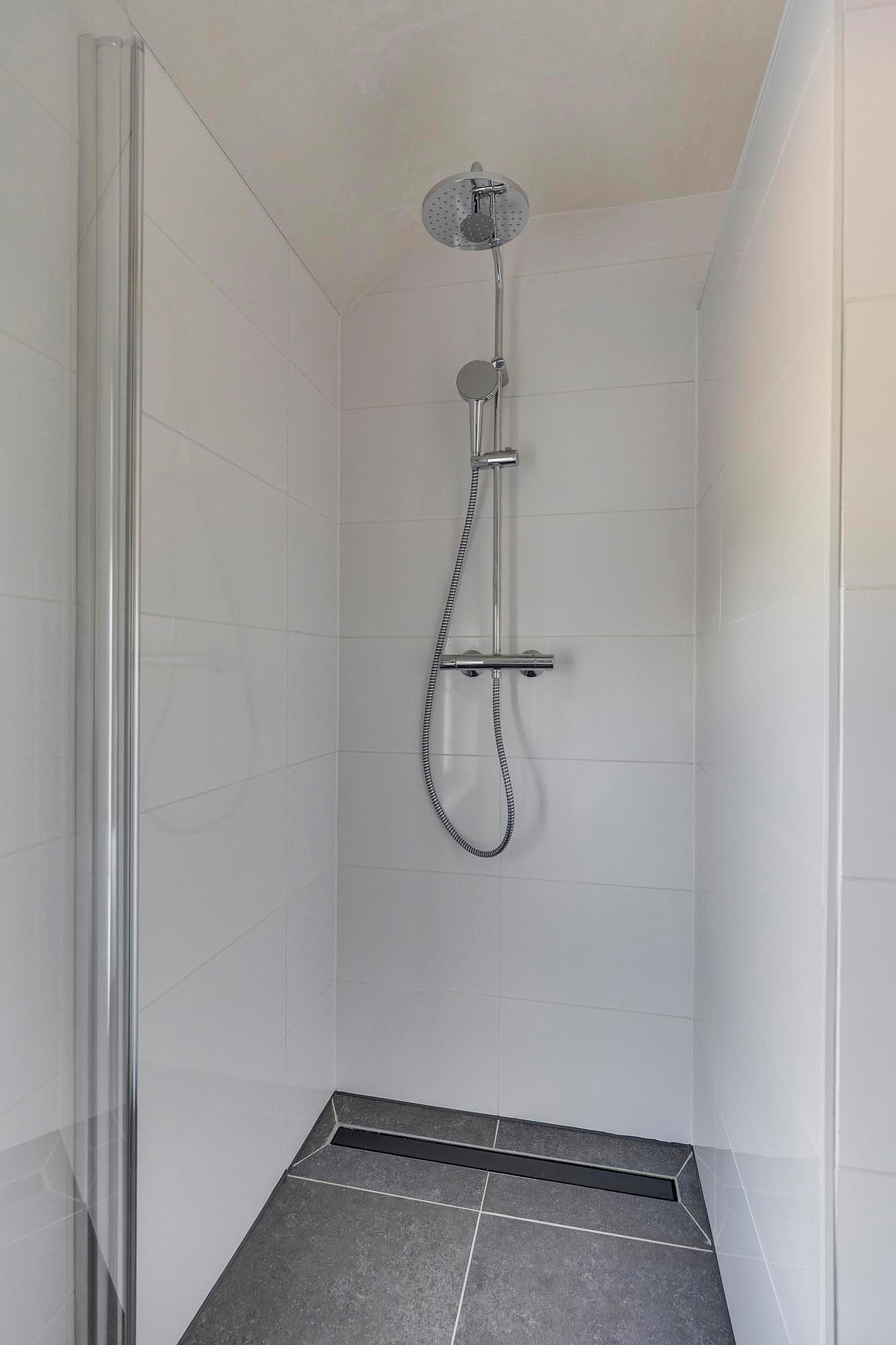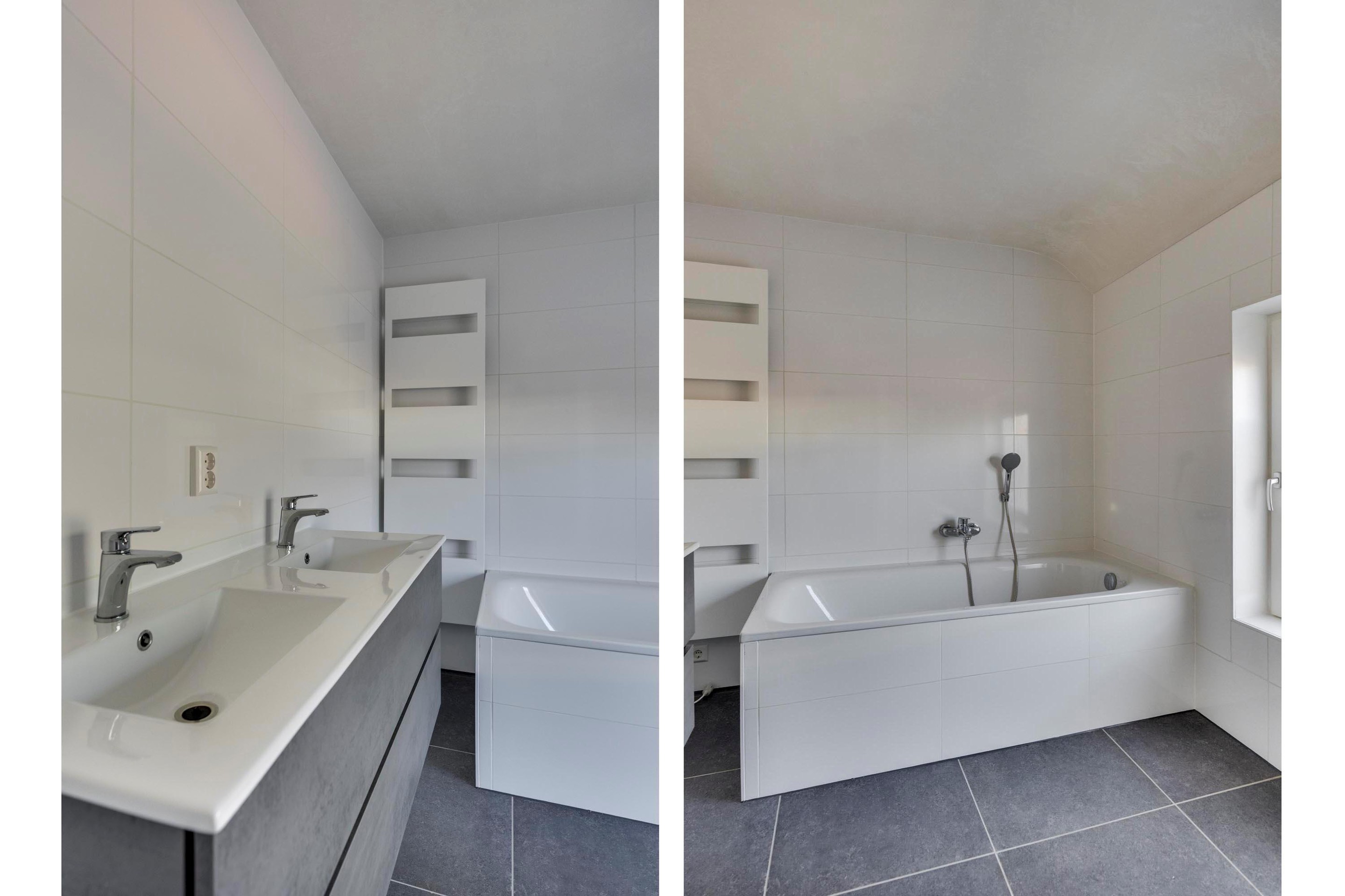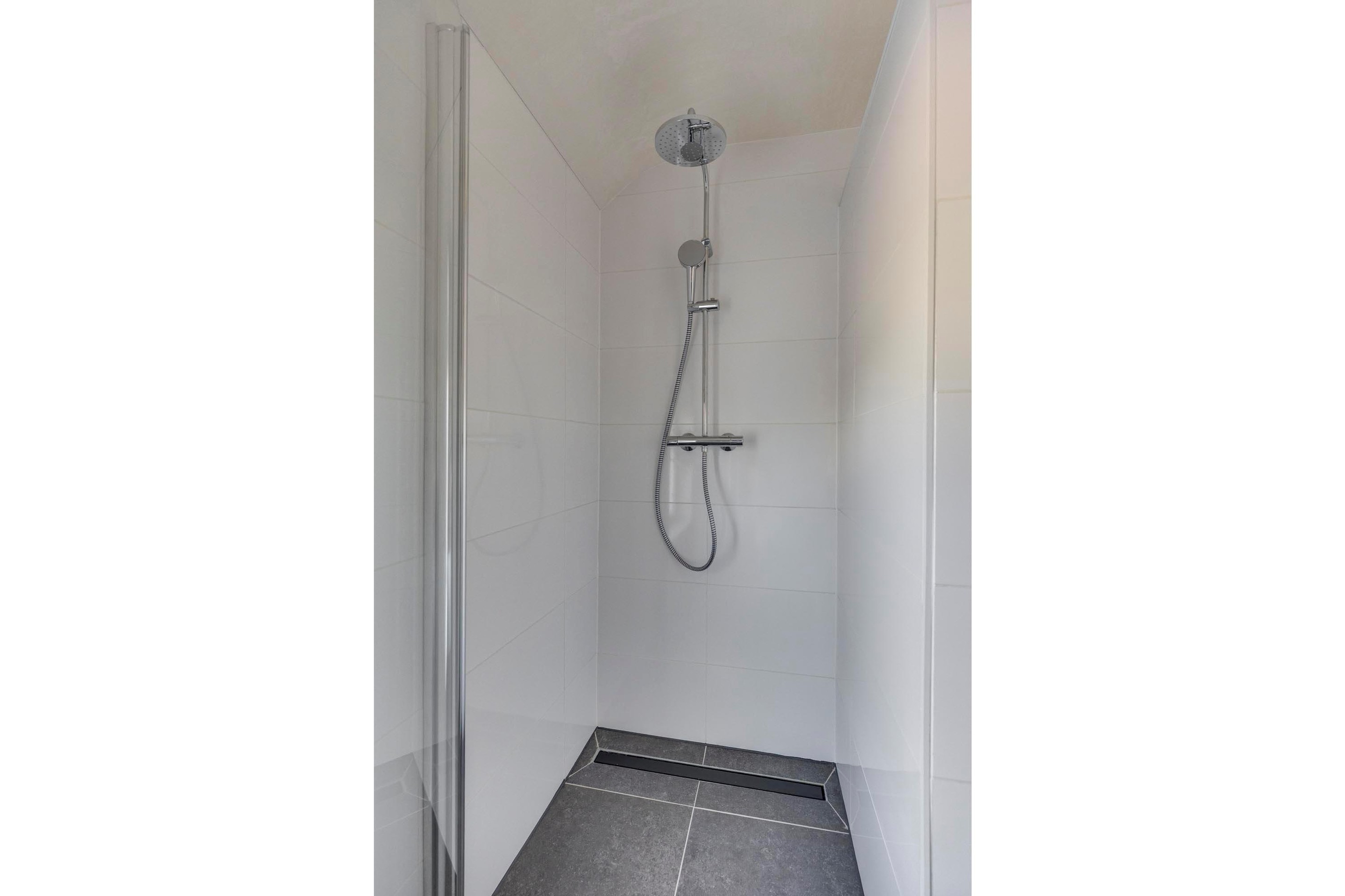 Eerste verdieping De overloop is afgewerkt met laminaat, stucwerk wanden/plafond en biedt middels een vlizoluik toegang de bergzolder. Daarnaast is er nog een praktische inloopkast aanwezig. Hier bevinden zich drie slaapkamers, respectievelijk 9.6m , 7.6m en 7.1m groot. De slaapkamers zijn alle drie afgewerkt met keurige laminaat vloer, stucwerk wanden en een gestuct plafond. Hiervan beschikken 2 slaapkamers over inbouwkasten en 1 slaapkamer met een kastenwand (deze blijft achter). De moderne, volledig betegelde badkamer beschikt over een ligbad, inloopdouche, een stijlvol wastafelmeubel met dubbele wastafel en een handdoekenradiator.