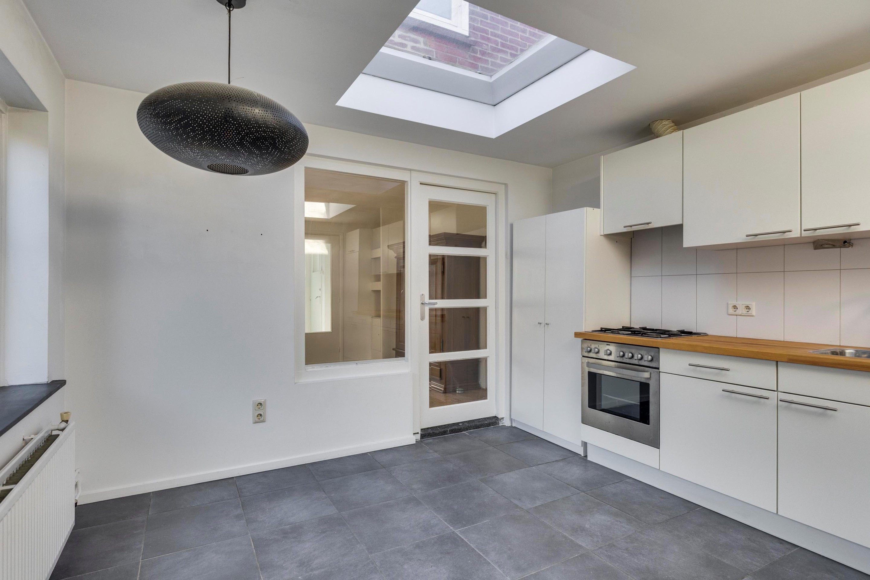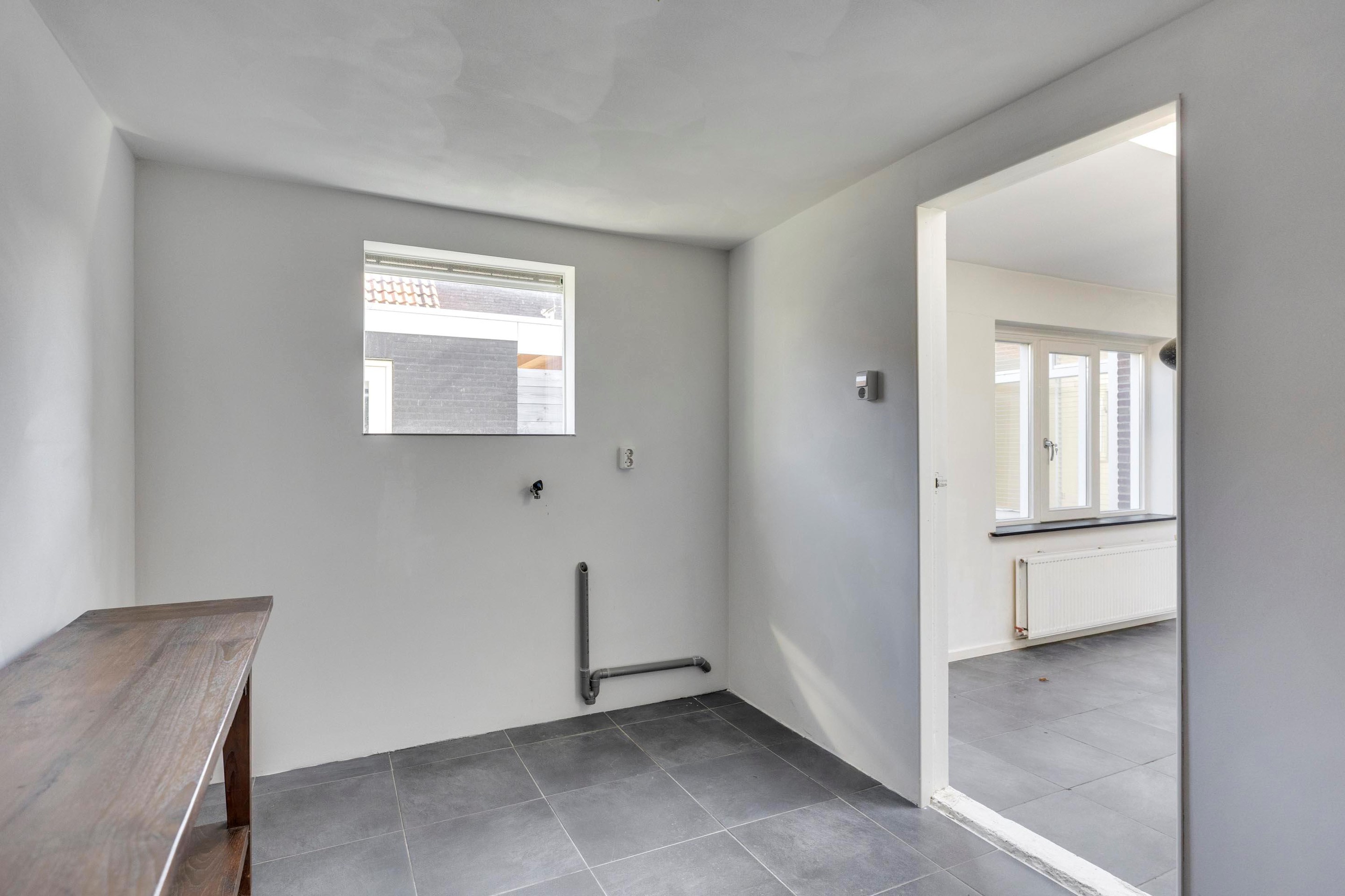 lichtkoepels en een extra raampartijen. De keuken is uitgevoerd in een praktische wandopstelling en voorzien van een vierpits gaskookplaat, afzuigkap, oven, vaatwasser en koelkast. Via de loopdeur heeft u direct toegang tot de tuin. Aansluitend vindt u de bijkeuken/berging, eveneens netjes afgewerkt met een tegelvloer en