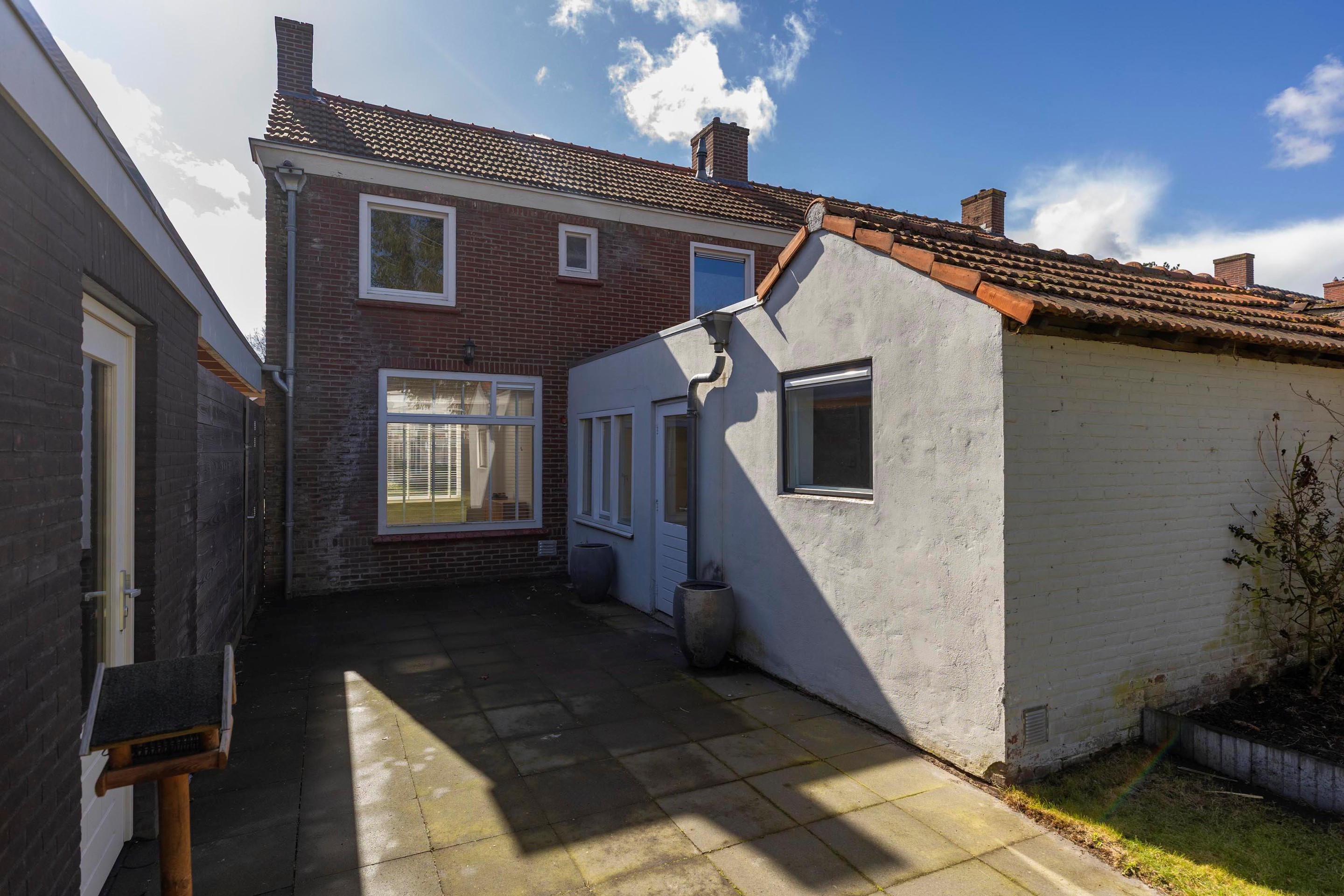 Tuin De diepe en zeer royale achtertuin is verzorgd en grotendeels voorzien van gazon. Direct aan de woning ligt een fijn terras, met daarnaast borders met diverse vaste beplanting. Achter de garage bevindt zich nog een overkapping. Ook is er een buitenkraan aanwezig en achterom.