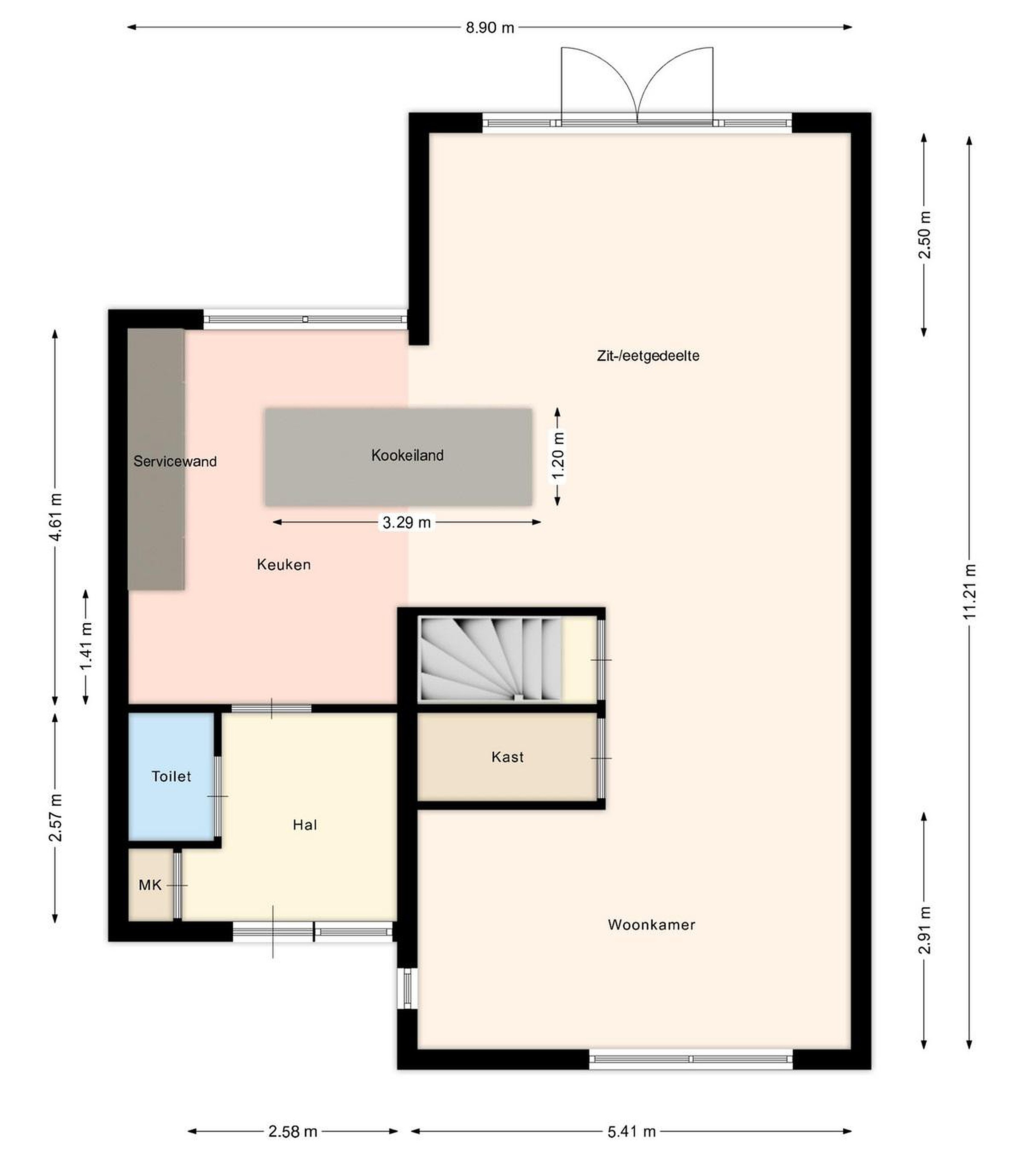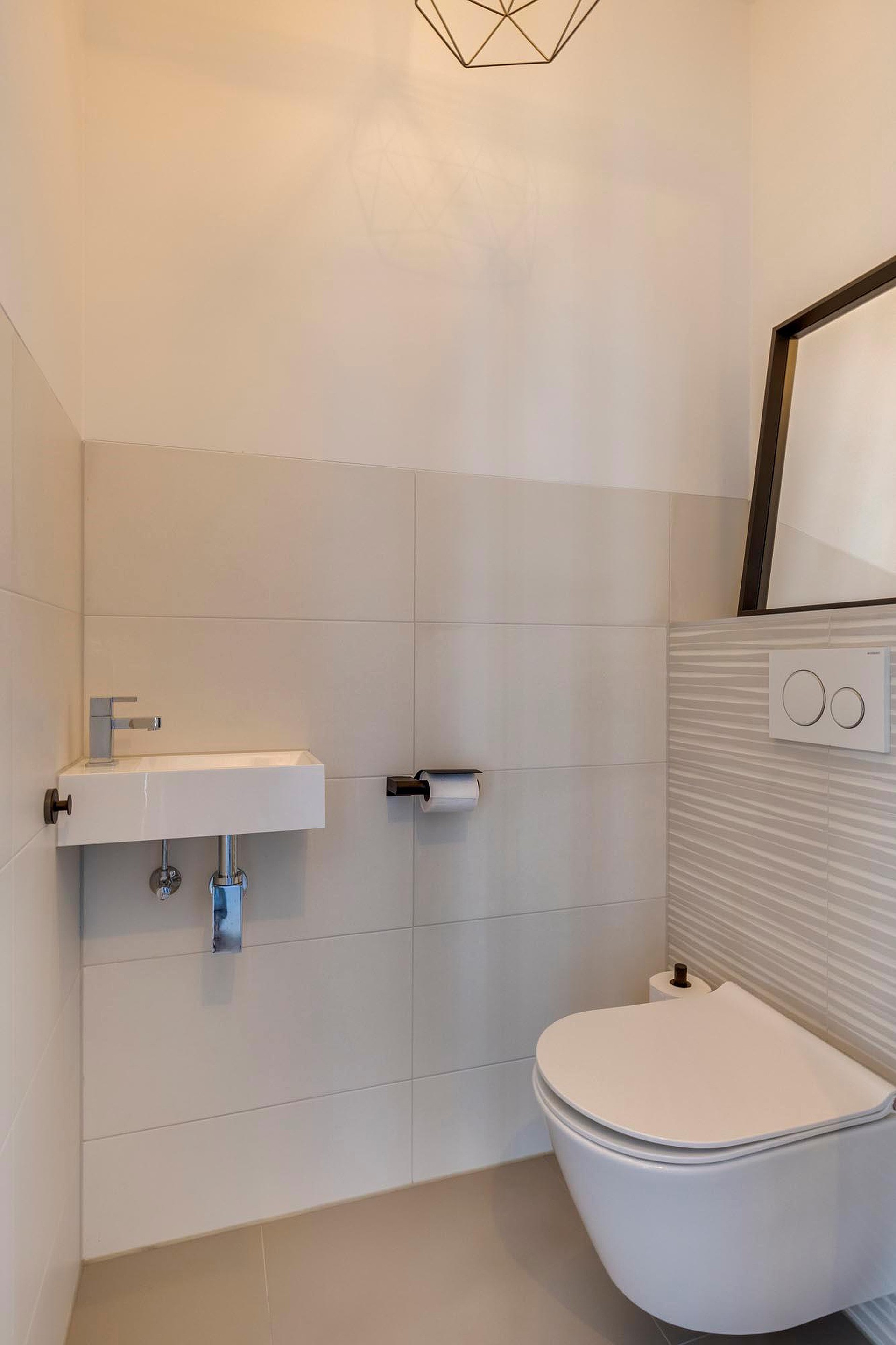 De ontvangsthal is ruim opgezet en beschikt over een uitgebreide meterkast, voldoende ruimte voor een garderobe en een moderne toiletruimte. Deze is deels betegeld en voorzien van een vrijdragend toilet en fonteintje. Vanuit de hal heeft u toegang tot de woonkamer.