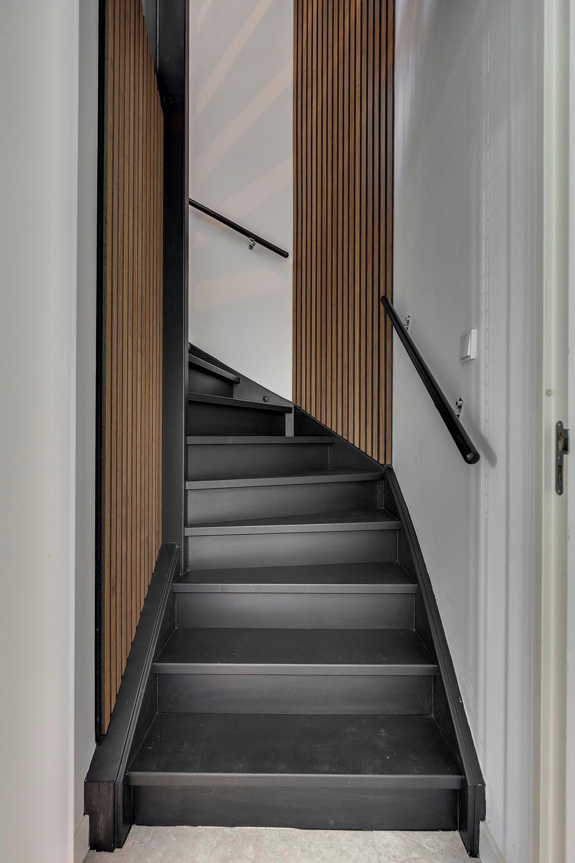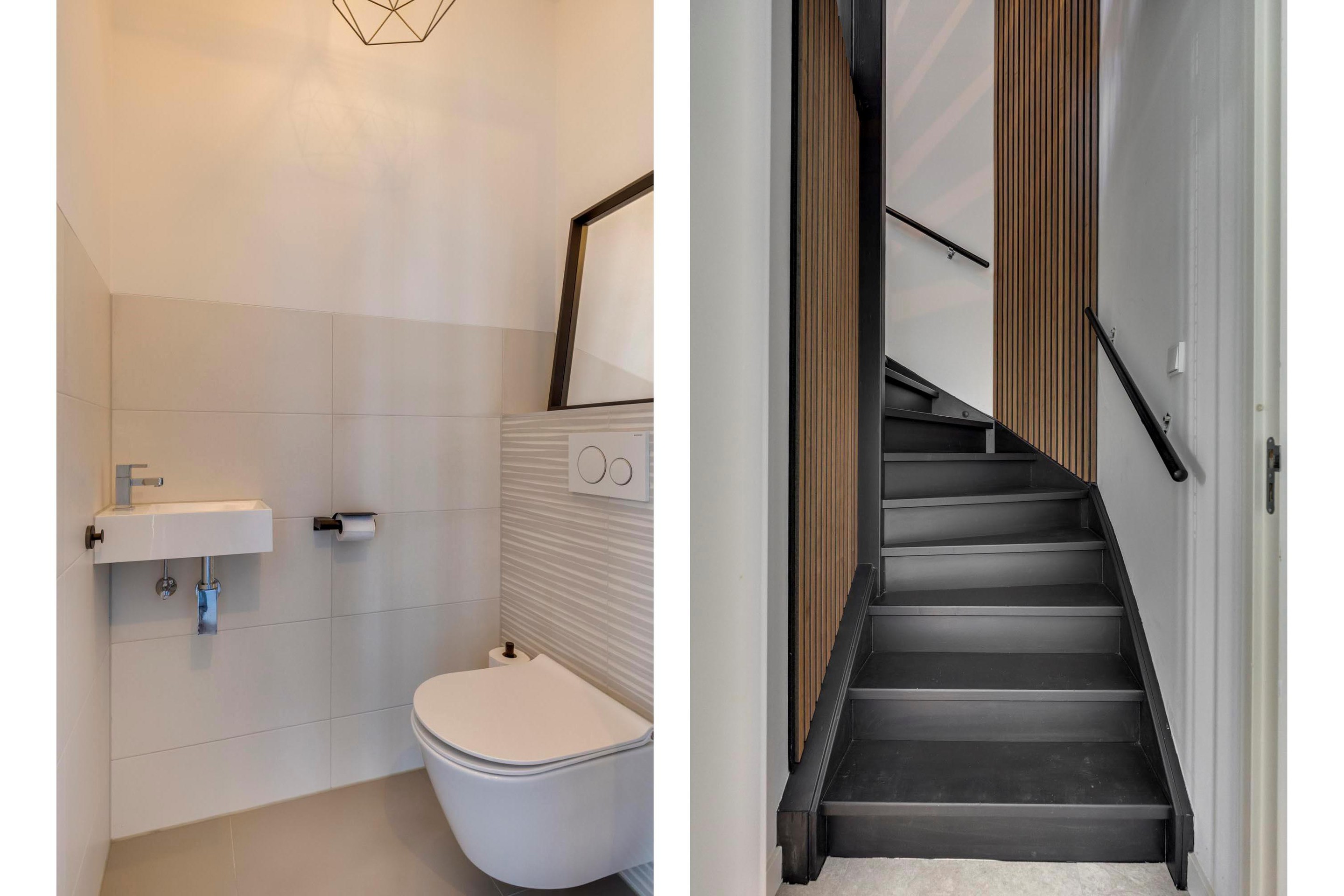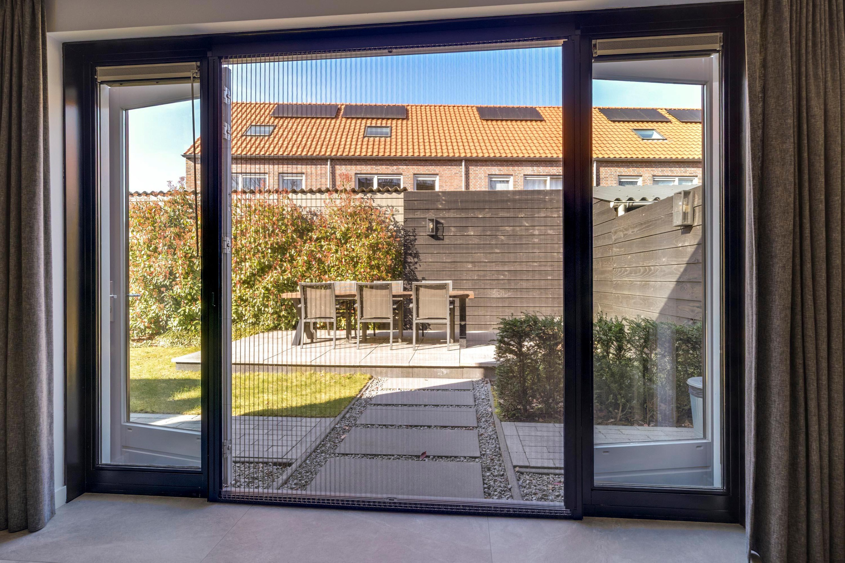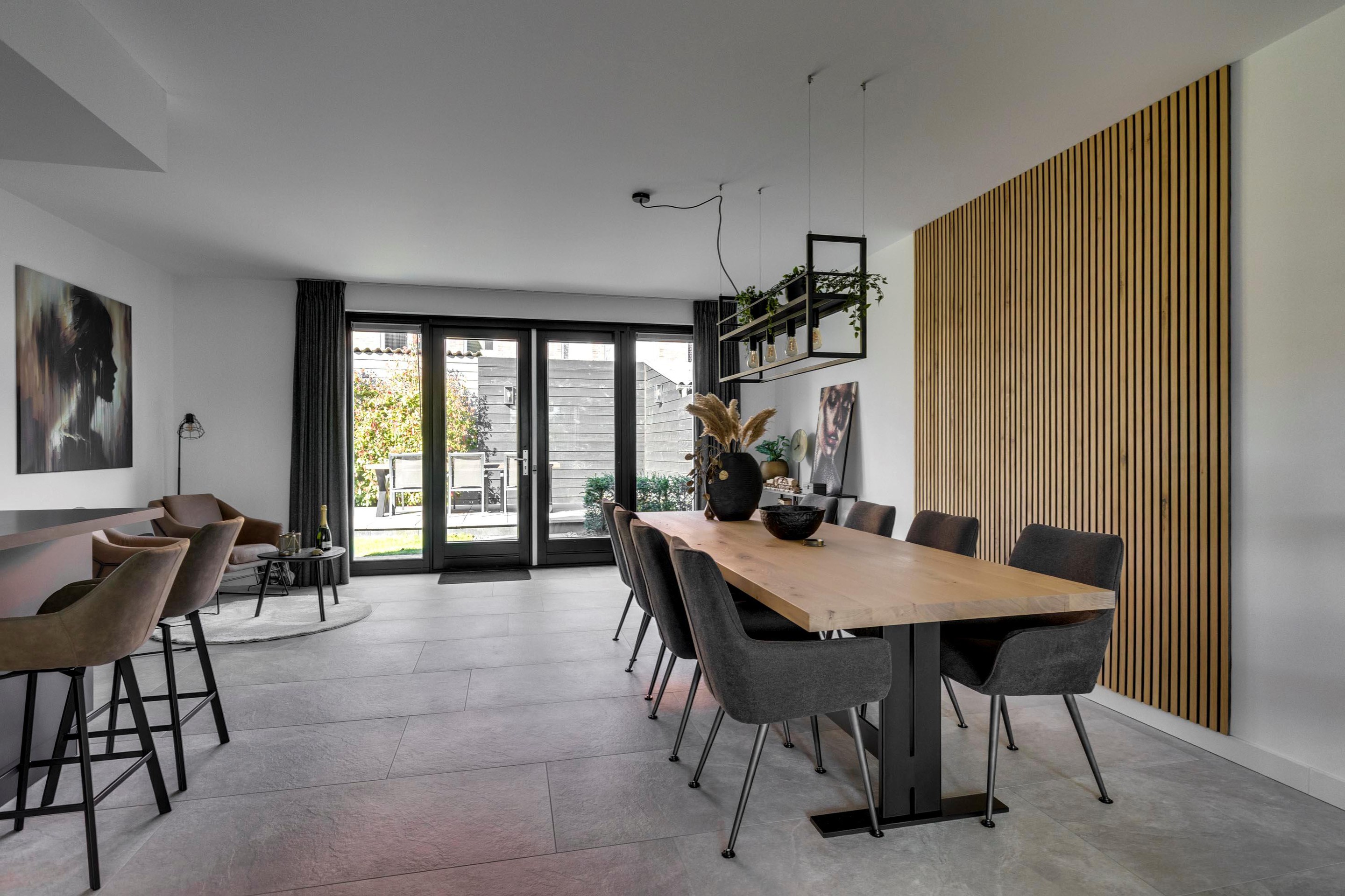 Bij het eetgedeelte zorgen openslaande deuren, voorzien van plissé hordeur, voor een fijne verbinding met de tuin. Binnen en buiten lopen hier moeiteloos in elkaar over. Aan de voorzijde van de woning bevindt zich de sfeervolle woonkamer voorzien van maatwerk TV meubel (blijft achter). Een fijne, rustige plek om te ontspannen, met een prettige lichtinval en een mooi zicht op de straatzijde. Daarnaast is er nog een praktische bergkast aanwezig (v.v. de vloerverwarmingsverdeler) en is de trapopgang naar de verdieping netjes weggewerkt in een apart portaal.