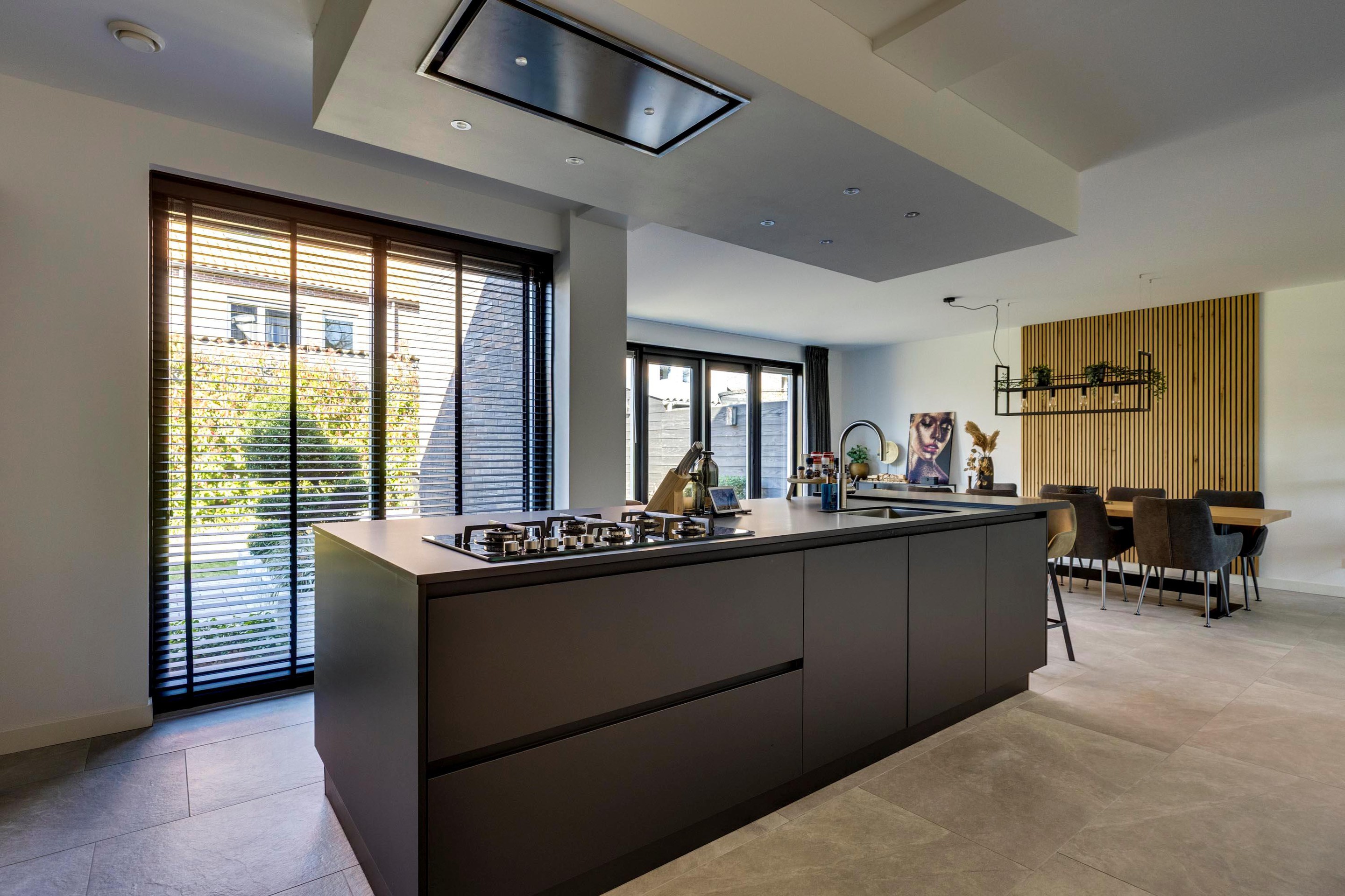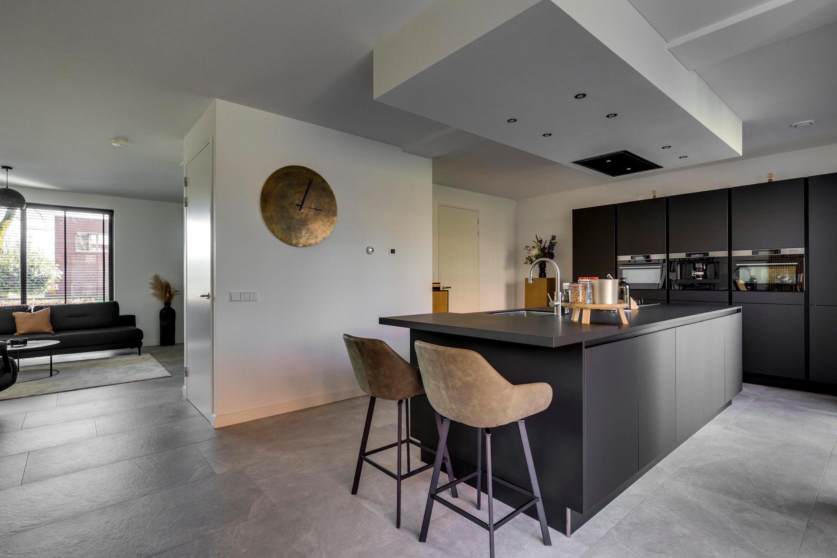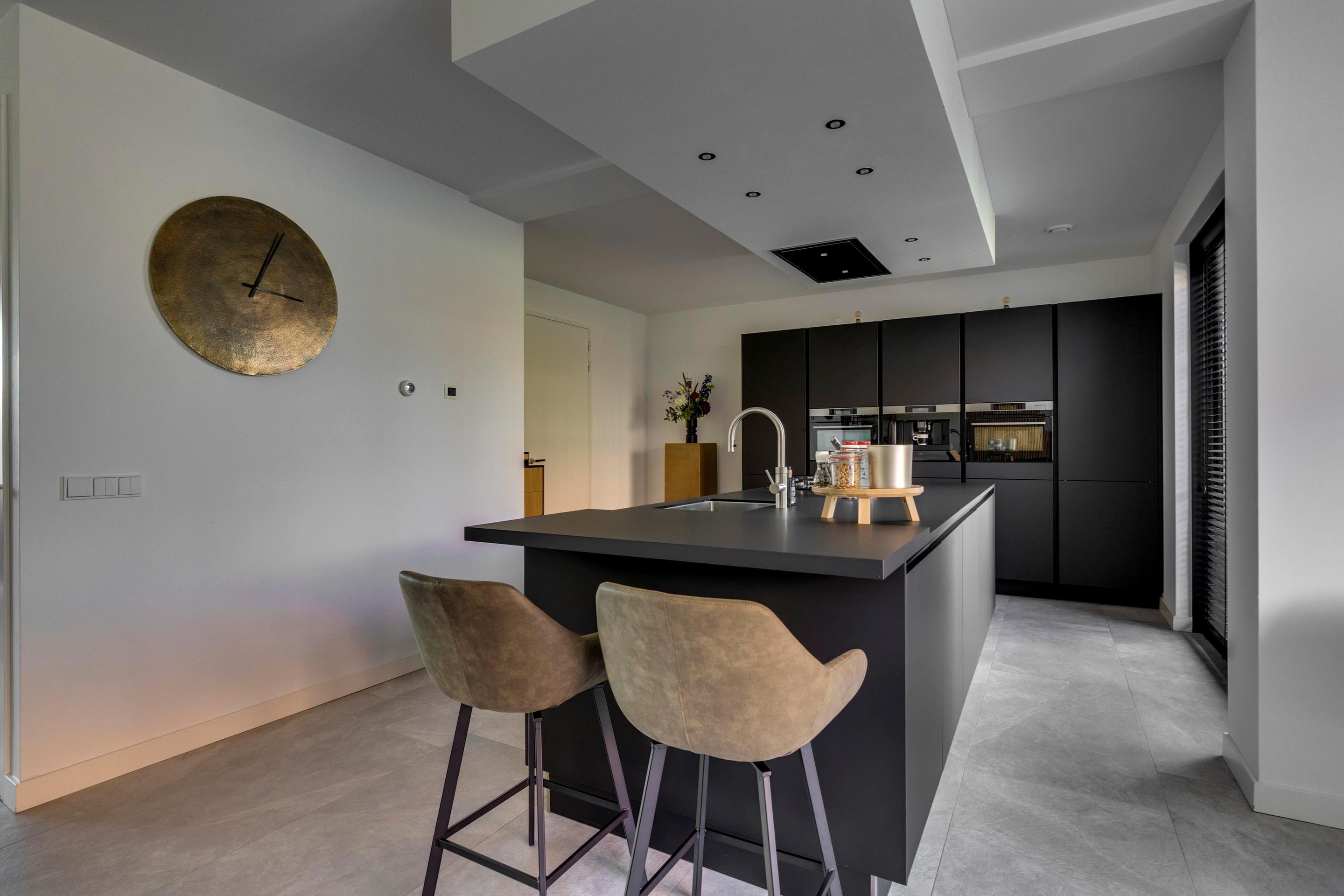 De open keuken is een absolute eyecatcher en uitgevoerd met een luxe servicewand en een fraai kookeiland. De servicewand is compleet uitgerust met hoogwaardige inbouwapparatuur van AEG, waaronder een stoomoven, koffieapparaat, combi-magnetron, koelkast en vriezer. Het kookeiland beschikt over een vijfpits gaskookplaat, afzuigkap en vaatwasser. Uiteraard ontbreekt ook de praktische kokendwaterkraan (Quooker) met spoelfunctie niet. Kortom van alle gemakken voorzien. Dankzij de uitbouw aan de achterzijde geniet u hier van verrassend veel leefruimte.