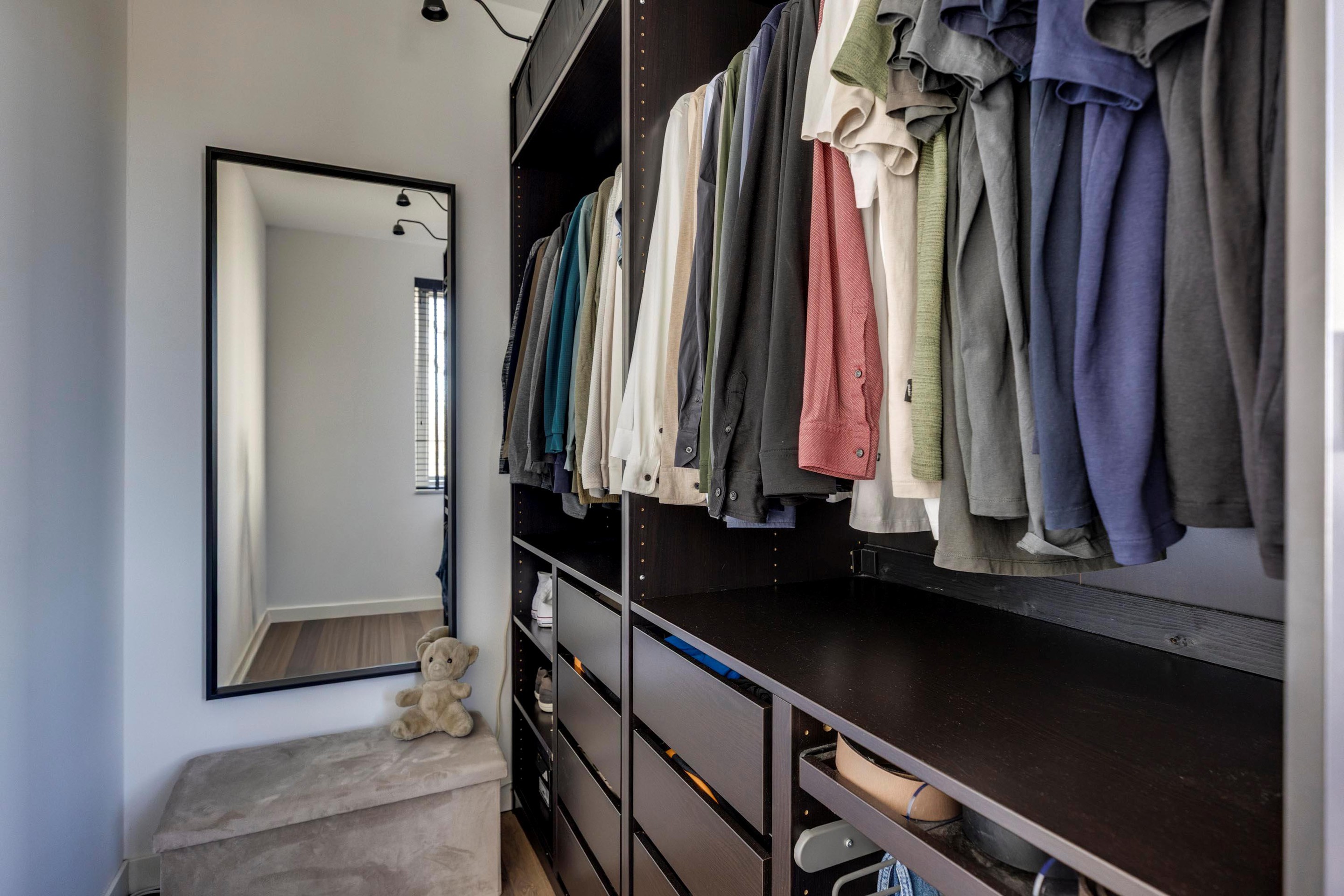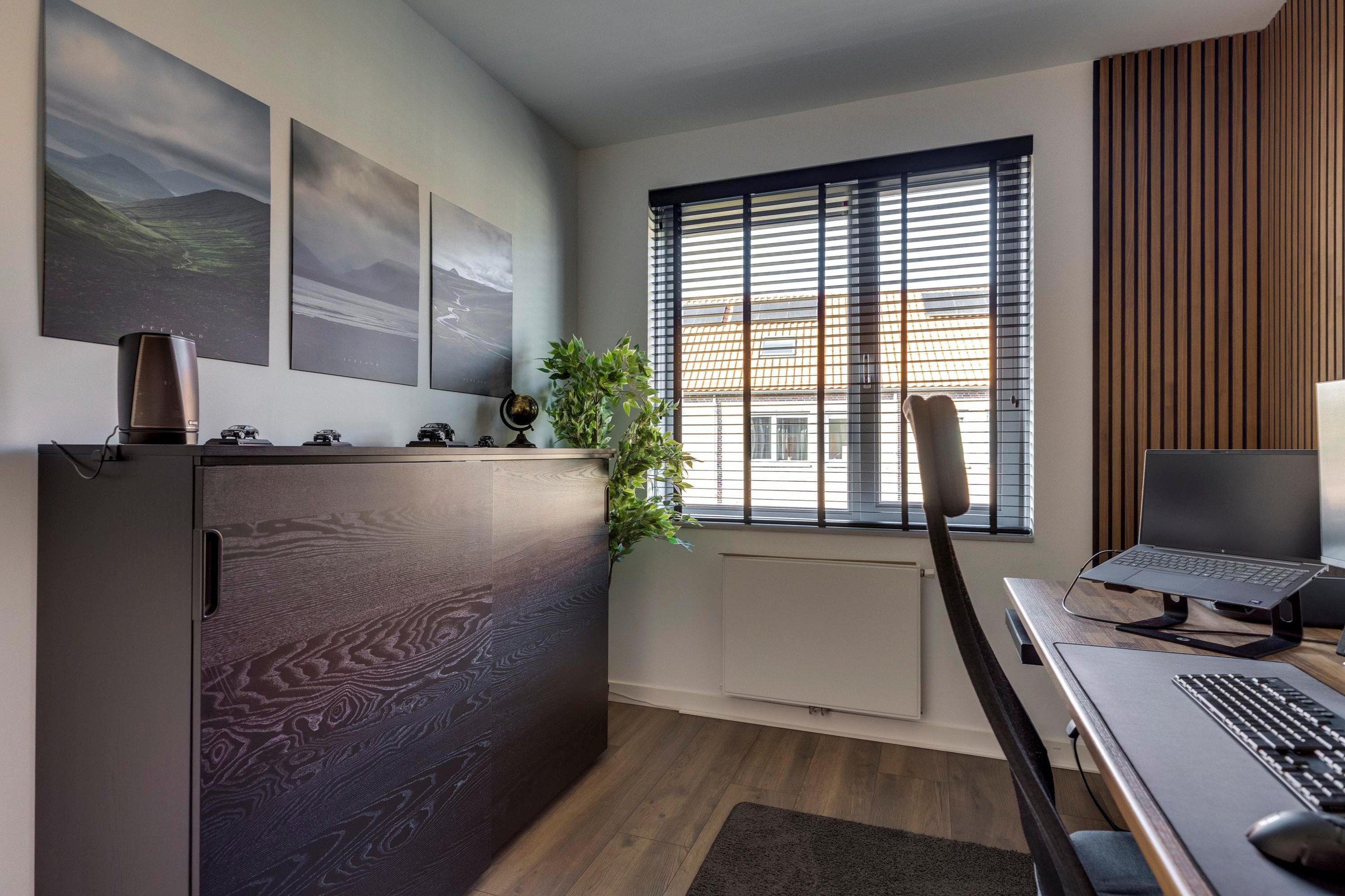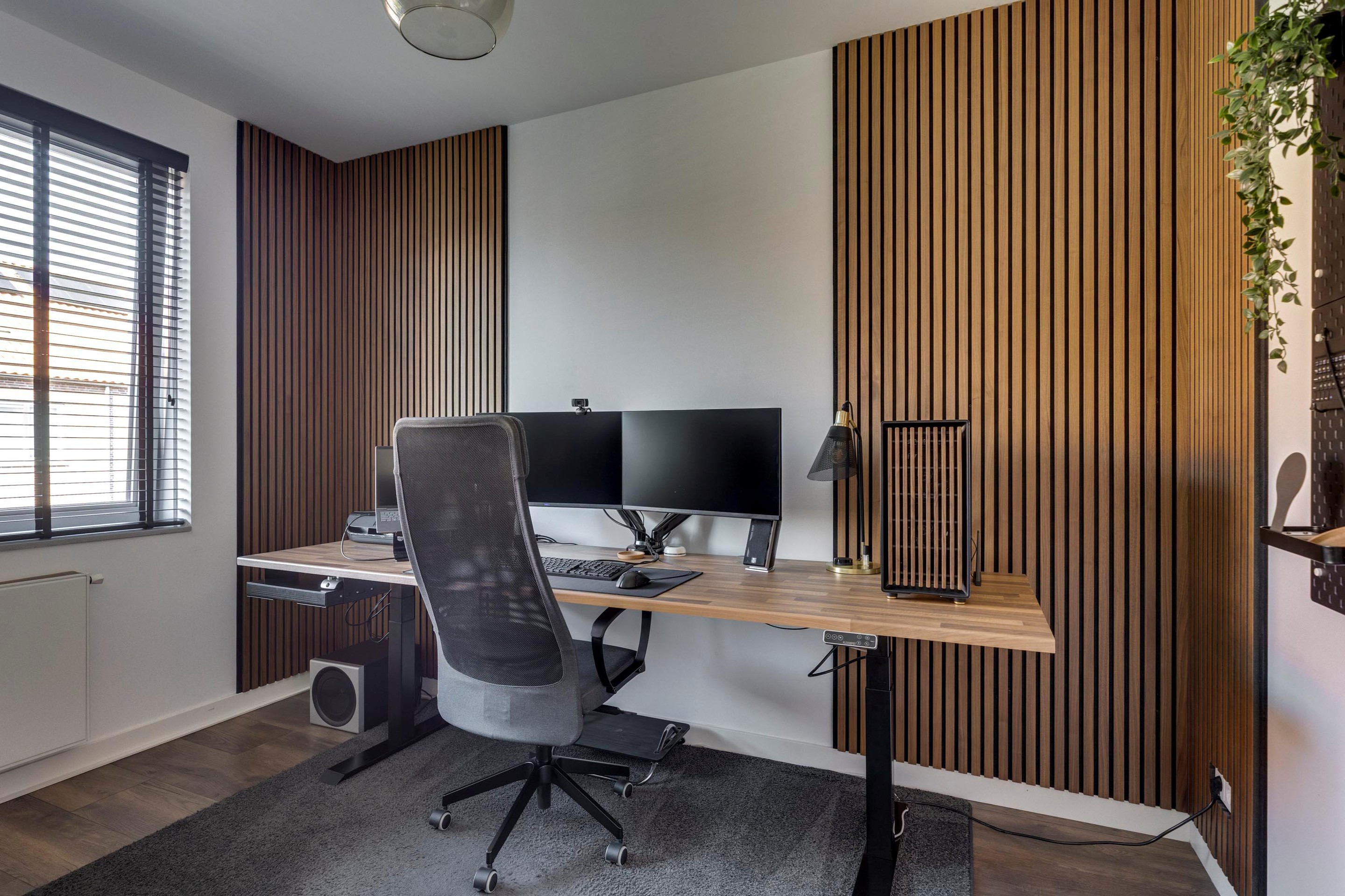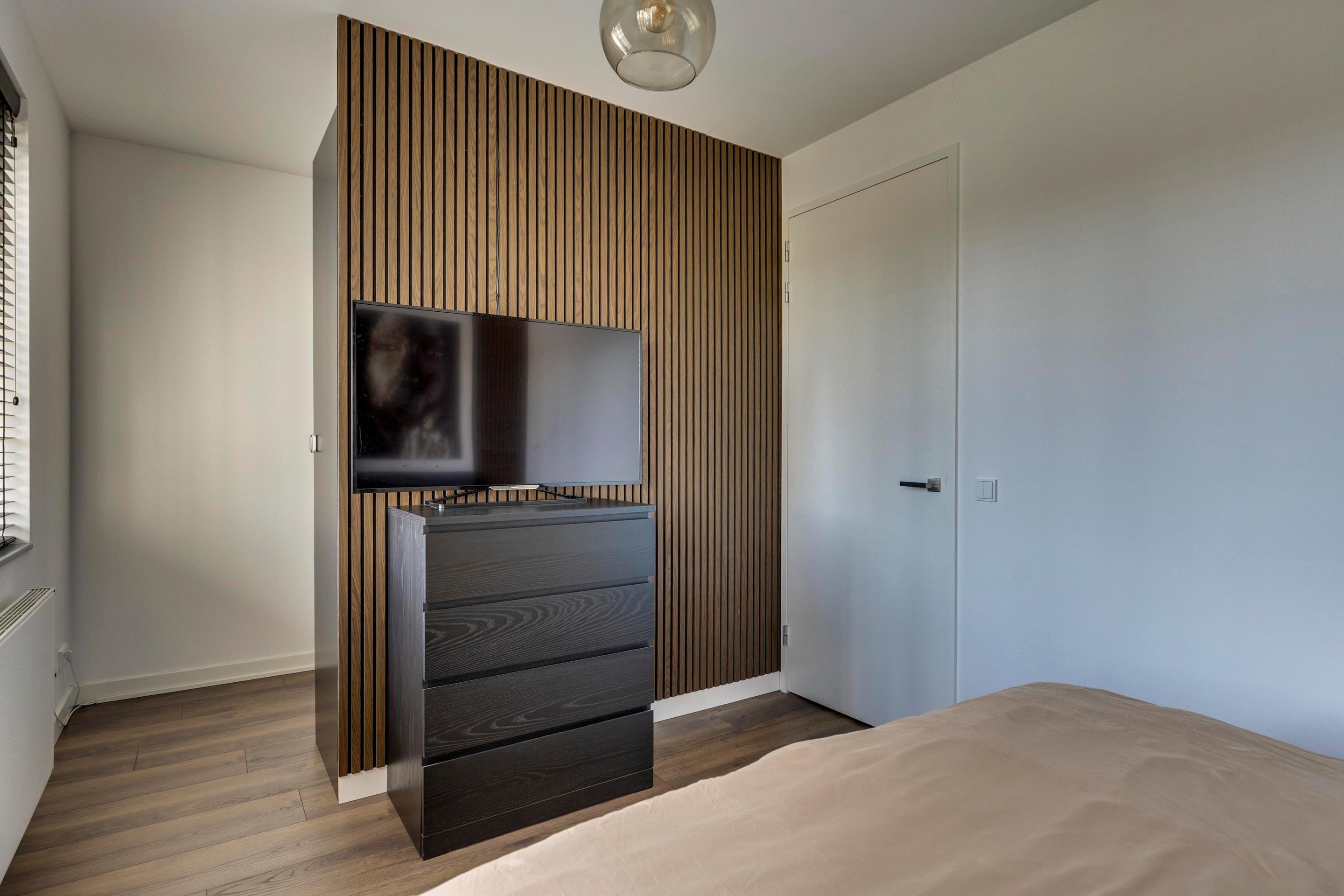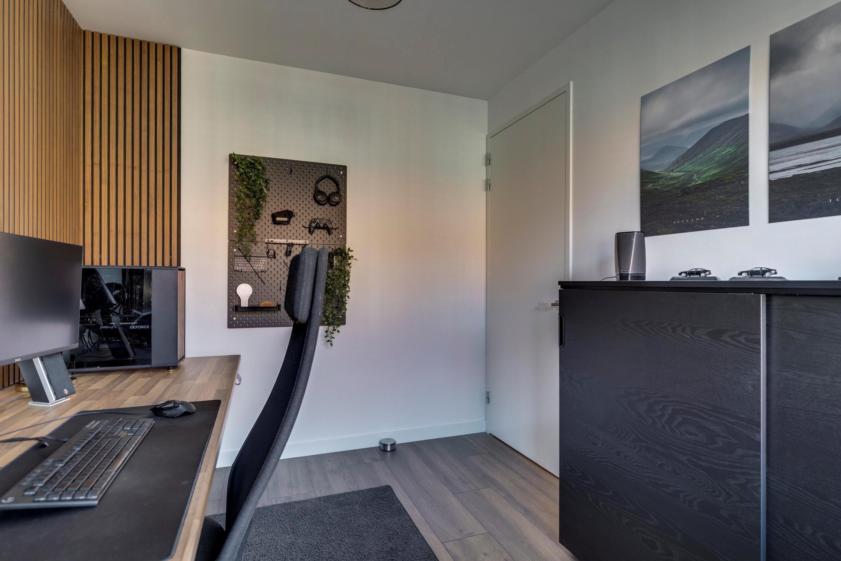 De slaapkamer aan de voorzijde is ruim van opzet en beschikt over een praktische inloopgarderobe, gecreëerd middels een kastenwand. Deze is desgewenst eenvoudig te verwijderen, waardoor u de ruimte geheel naar eigen wens kunt indelen. Daarnaast zijn de ramen voorzien van horren. Net als op de begane grond zorgen de deels aangebrachte akoestische panelen ook hier voor extra sfeer en een prettige akoestiek.