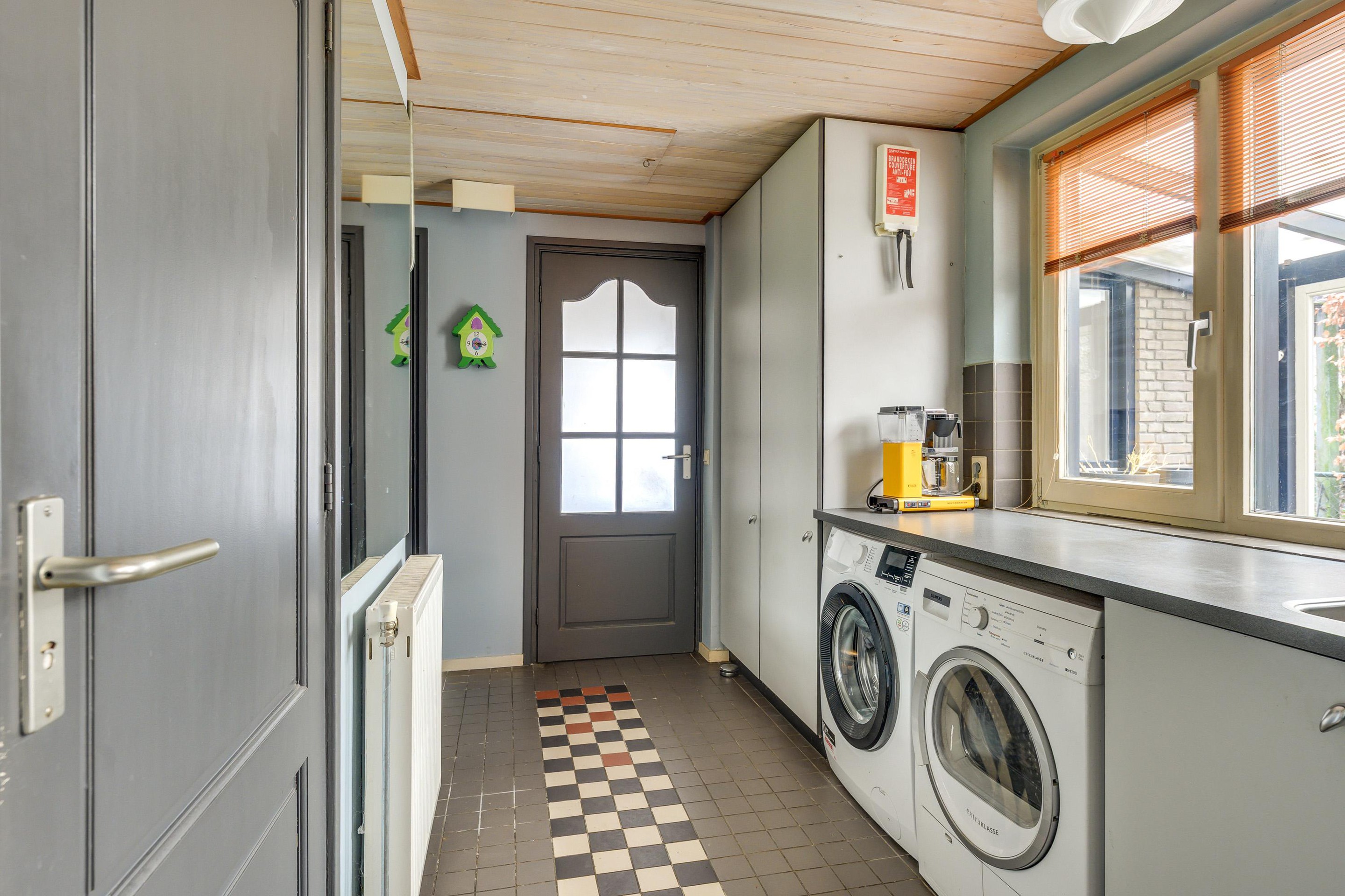 Vanuit de zitkamer loopt u door naar de praktische bijkeuken. Deze ruimte is afgewerkt met een tegelvloer en beschikt over een verdiepte trap-/kelderkast, ideaal voor extra provisie- of bergruimte. Het houten schroten plafond is voorzien van een vlizoluik naar een bergvliering (naast de extra opslagruimte, is hier de HR-combiketel Intergas 2017 opgesteld). De bijkeuken is voorzien van een aanrechtblad met spoelbak, de aansluitingen t.b.v. de wasapparatuur en vaste kasten, waardoor er volop bergruimte aanwezig is.