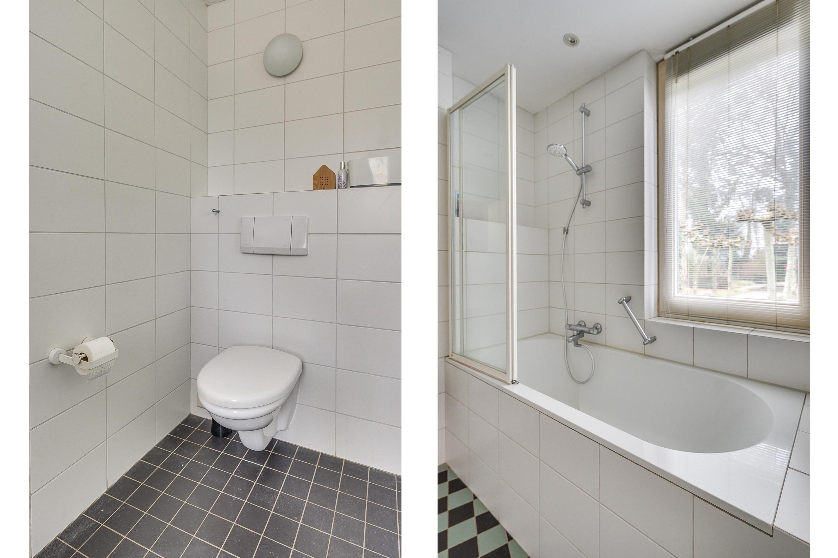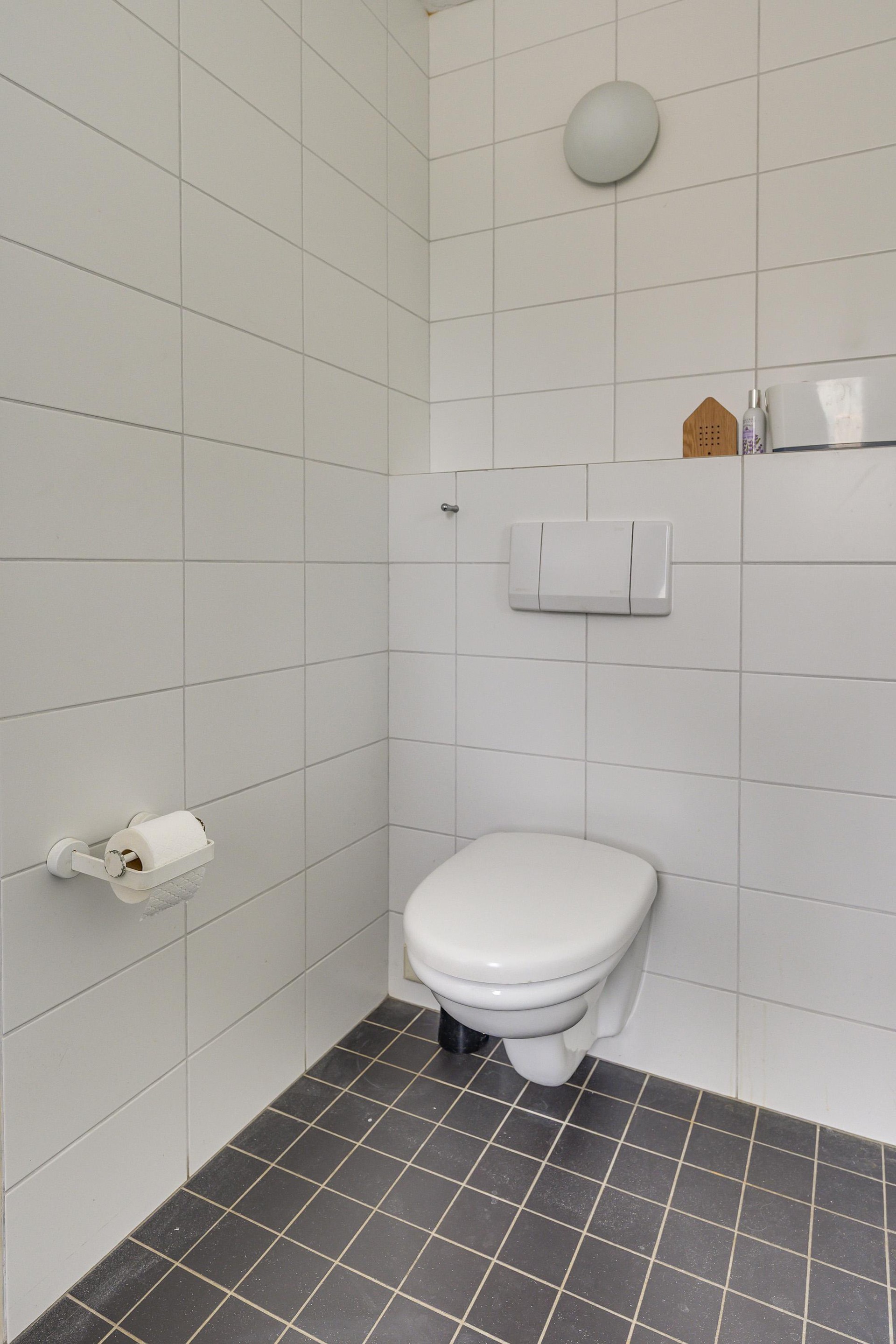 Aansluitend bevindt zich de doucheruimte, welke geheel is betegeld en is voorzien van een douchecabine en toilet met fonteintje.