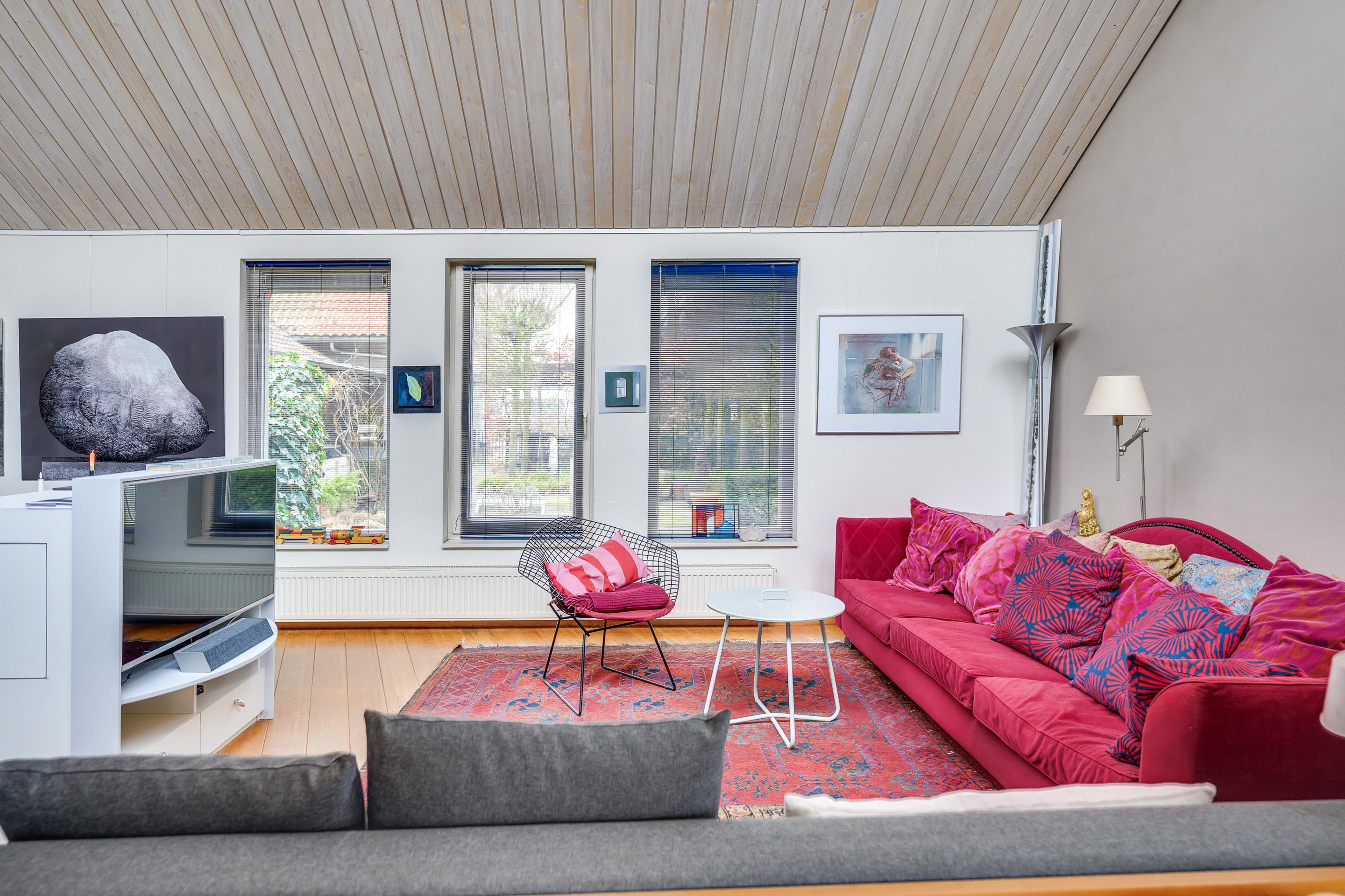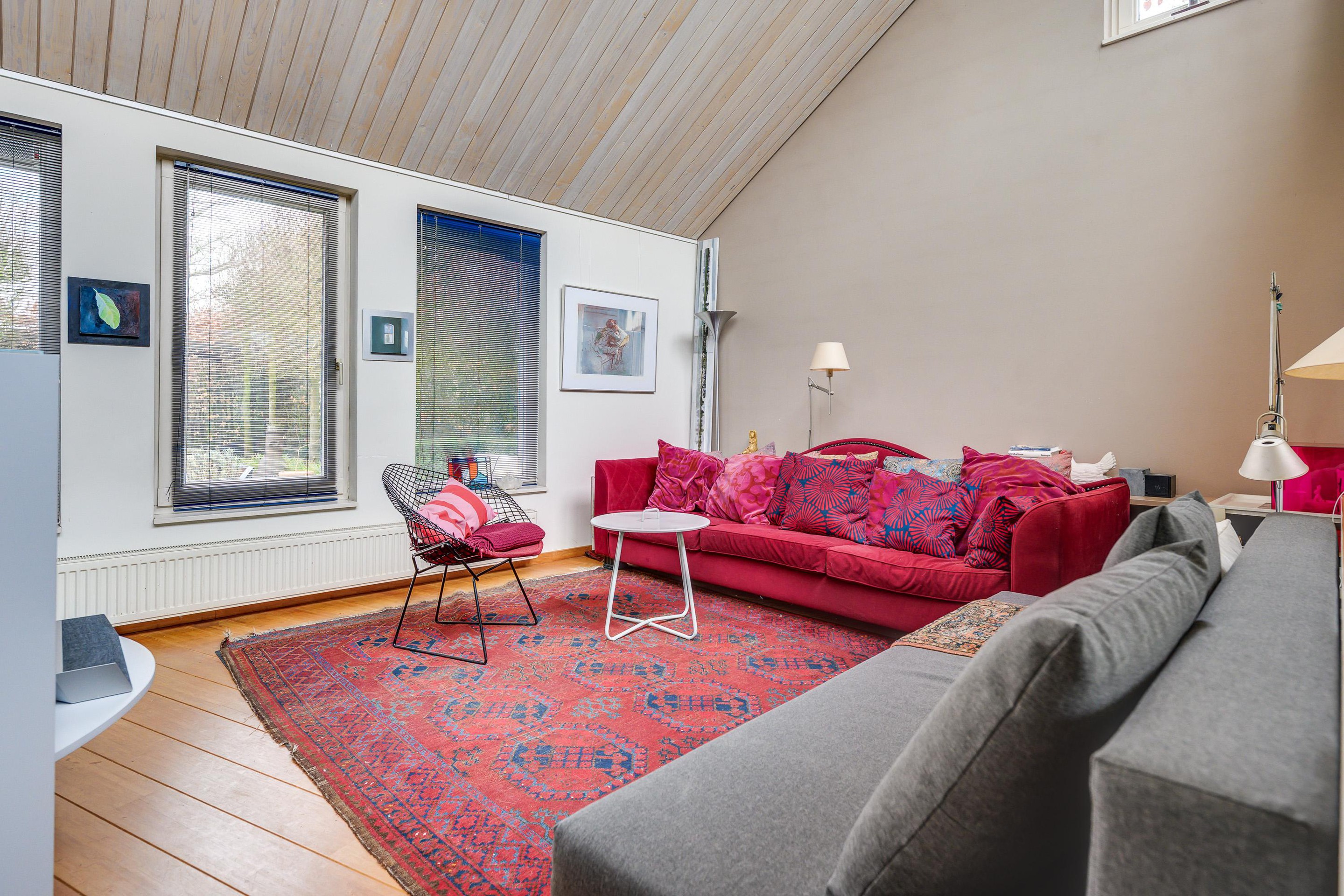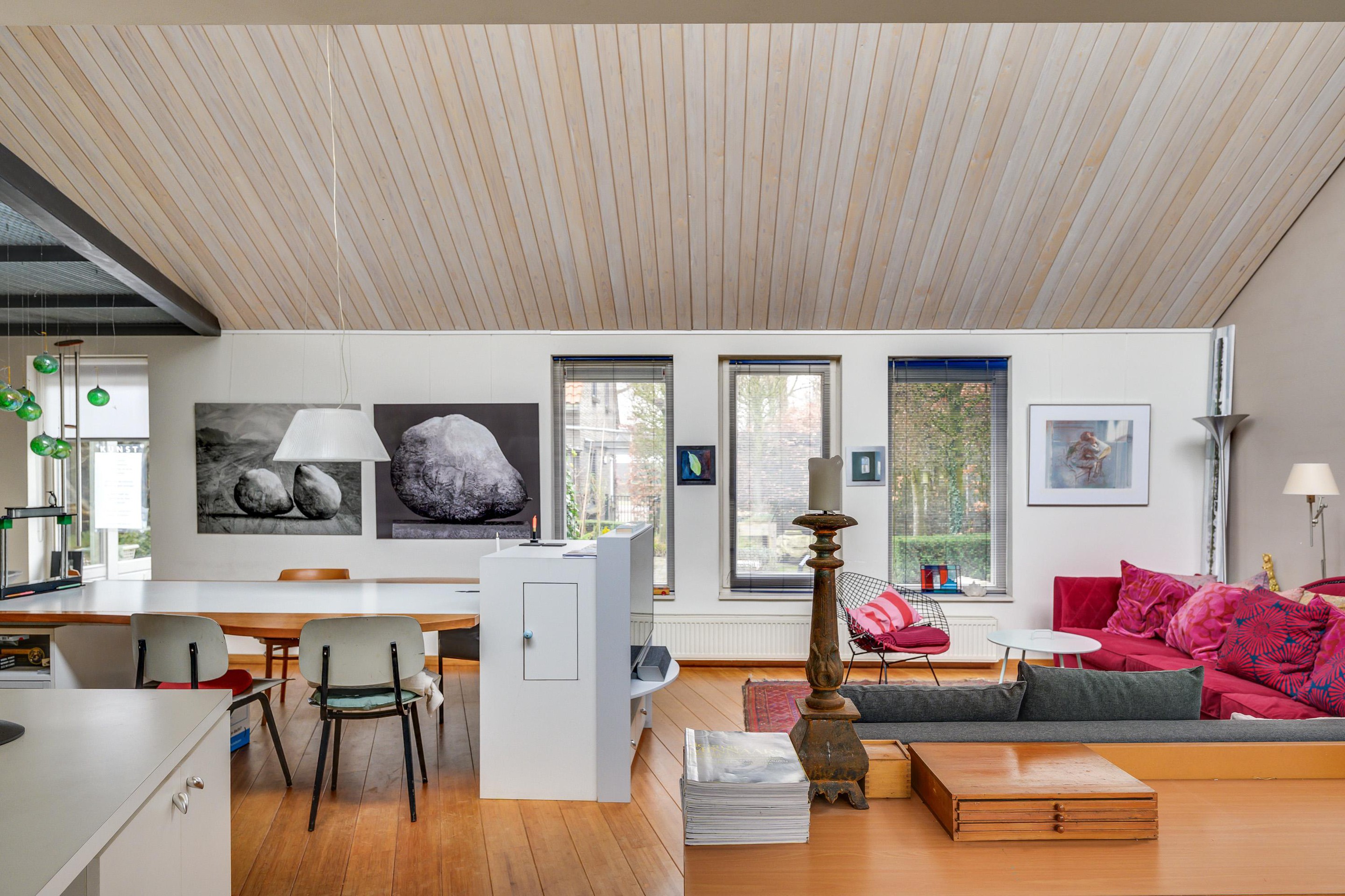 U komt hier in een indrukwekkend grote woonkamer met een warme bamboe vloer, een strak plafond met inbouwspots en openslaande deuren (v.v. plissé hordeur) naar de achtertuin. De vele raampartijen (waaronder de bovenlichten) zorgen voor een prachtige lichtinval en een open, ruimtelijk gevoel. Dit is een heerlijke leefruimte waar u moeiteloos meerdere zit- of leefhoeken kunt creëren en optimaal geniet van het contact met buiten. Of wat dacht u van een atelier of werkplek?