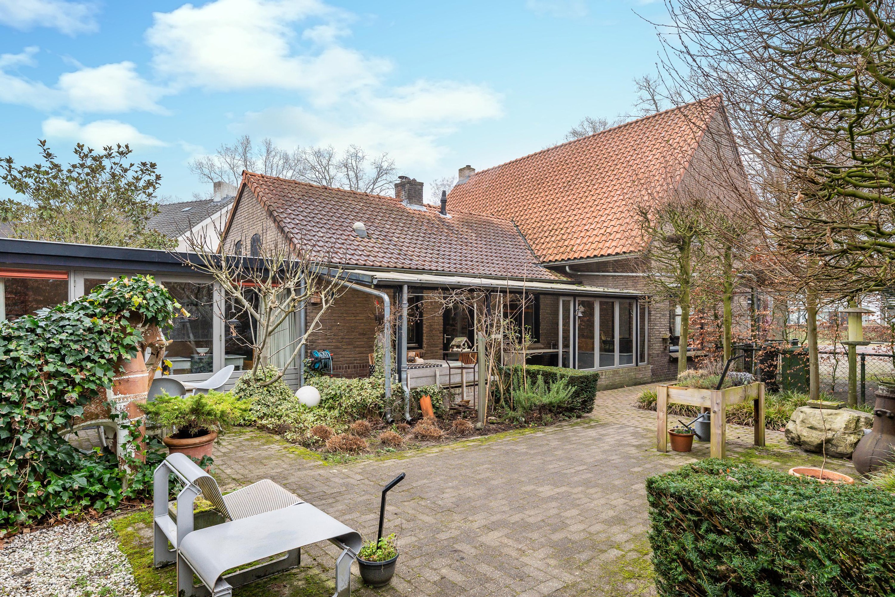 Uniek is de binnentuin die vanuit de keuken bereikbaar is. Deze sfeervolle buitenruimte beschikt over een groot overdekt terras, slingerende paadjes, beukenbomen en diverse vaste beplanting. Een beschutte plek waar u in alle rust kunt ontspannen en genieten van het buitenleven, ongeacht het seizoen.