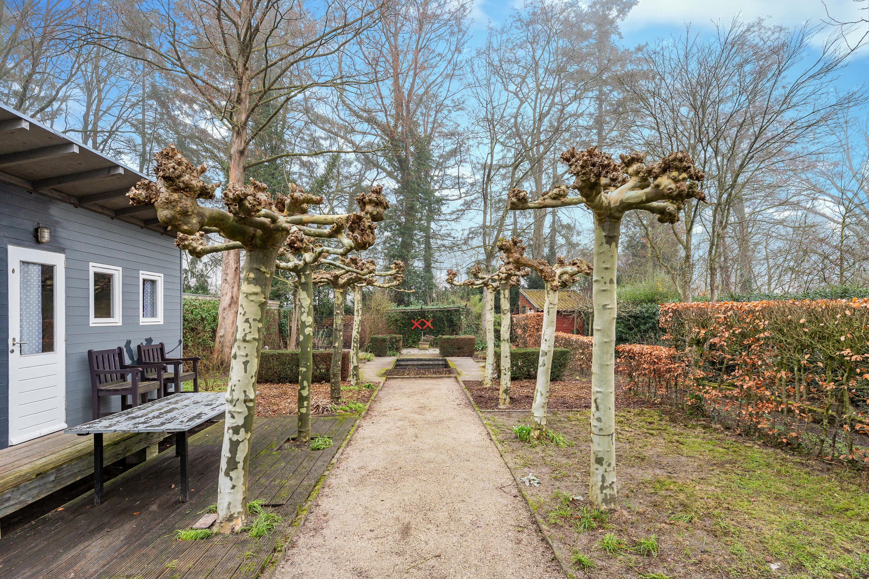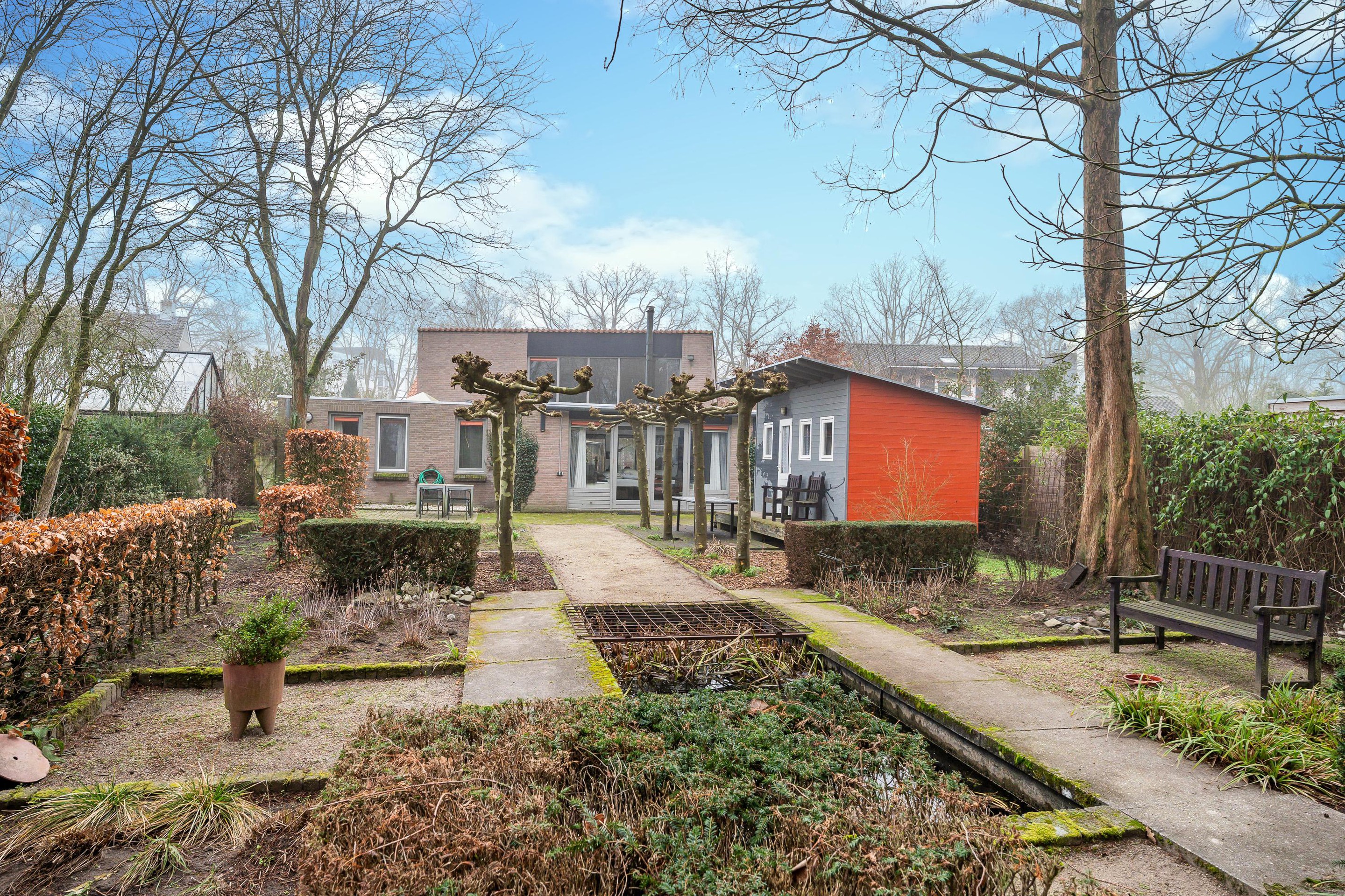 De achtertuin is fraai en verzorgd aangelegd met meerdere terrassen, een vijverpartij, volwassen bomen en diverse vaste beplanting. Dankzij de verschillende zitplekken kunt u hier op elk moment van de dag van zon of schaduw genieten. Er is een groot zonnescherm aanwezig, meerdere buitenkranen en een achterom. Daarnaast beschikt de tuin over een buitenberging én een extra tuinhuisje, dat uitstekend geschikt is als logeerplek, hobbyruimte of extra opslag.