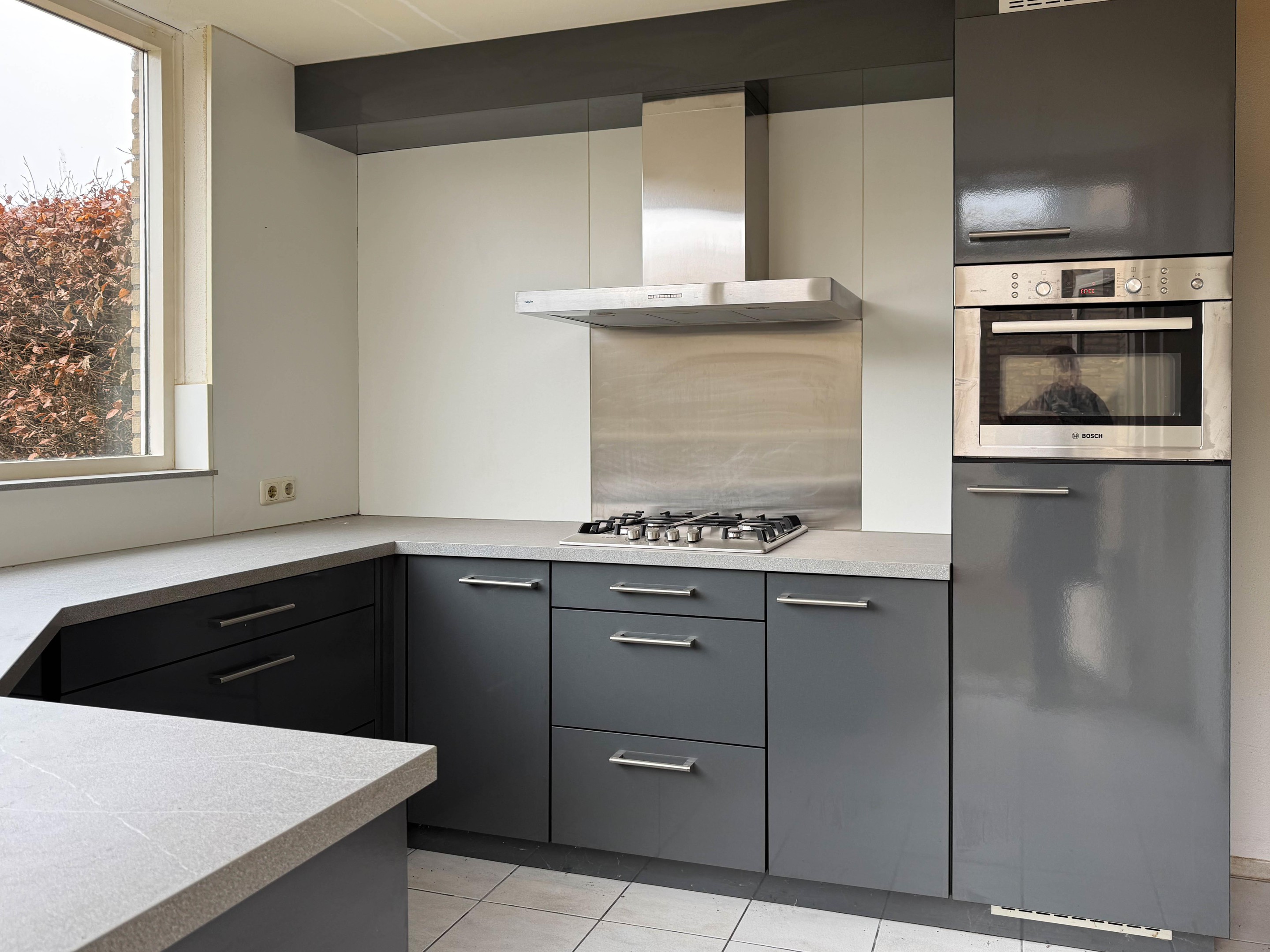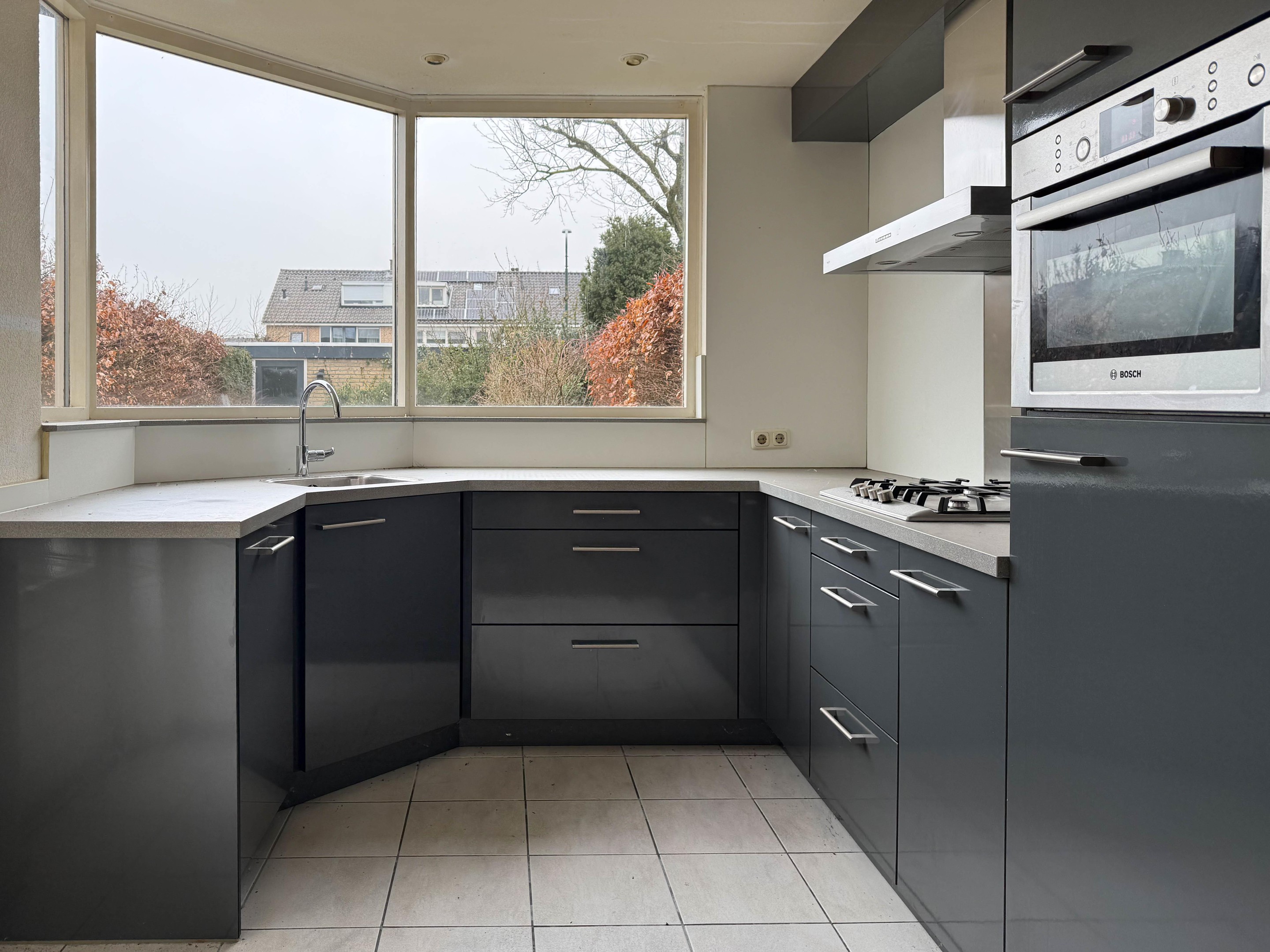 De keuken, gelegen in de uitbouw, is uitgevoerd in een nette praktische U-opstelling (Ikar) met lichte tegelvloer en inbouwspotjes. Hier kookt u met plezier dankzij de aanwezige inbouwapparatuur: 4-pits gaskookplaat, afzuigkap, combi-oven en vaatwasser (apparatuur grotendeels van Bosch). Daarnaast is er voldoende kastruimte en via de loopdeur staat u zo in de tuin.