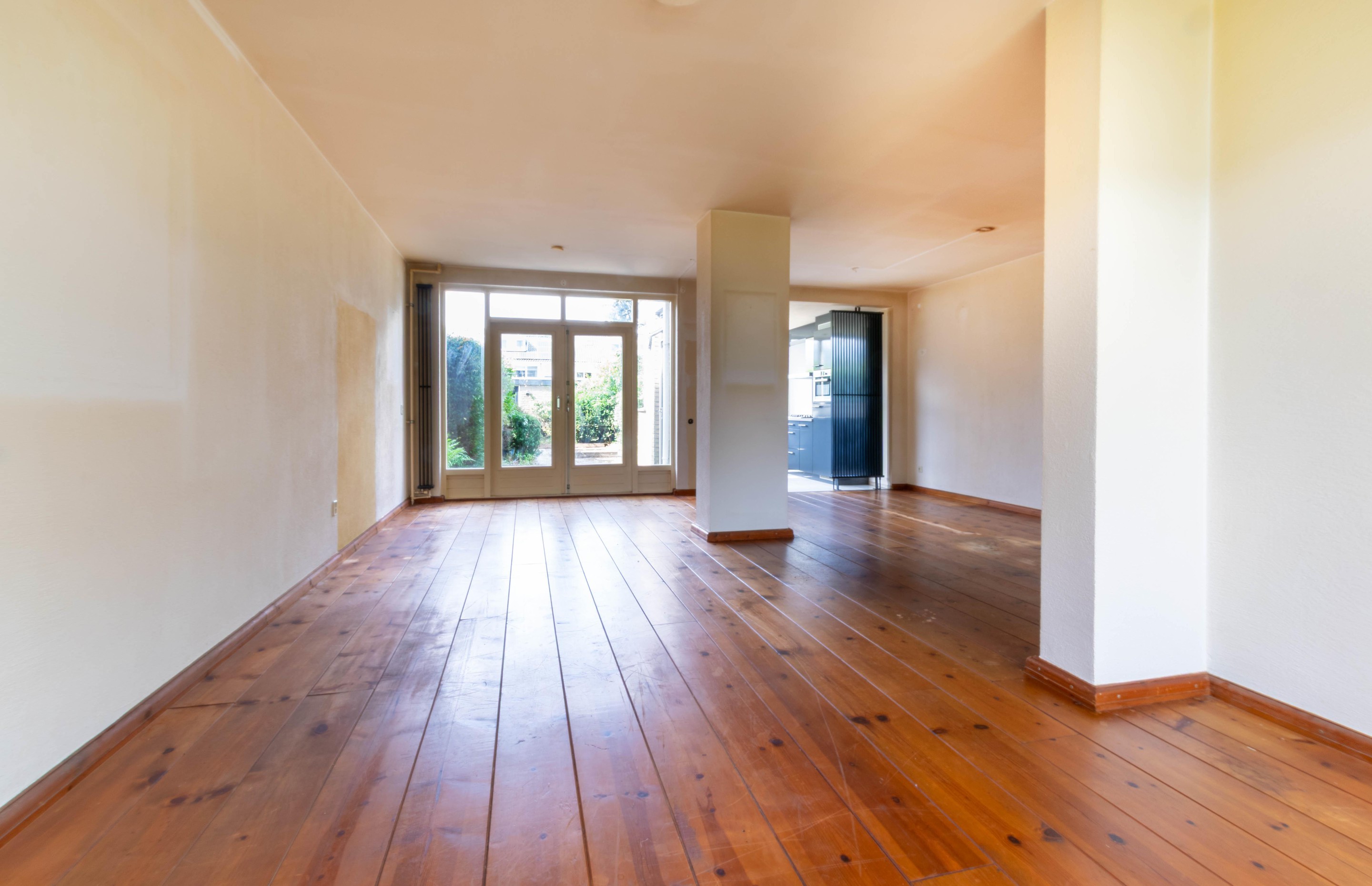 De lichte woonkamer vormt het hart van het huis. De ruimte is afgewerkt met dezelfde houten vloer, gestucte wanden en stucwerk plafond. Aan de achterzijde bieden openslaande deuren toegang tot de tuin – heerlijk veel daglicht én een directe verbinding met buiten. De trap naar de verdieping is op een subtiele manier in de ruimte verwerkt.