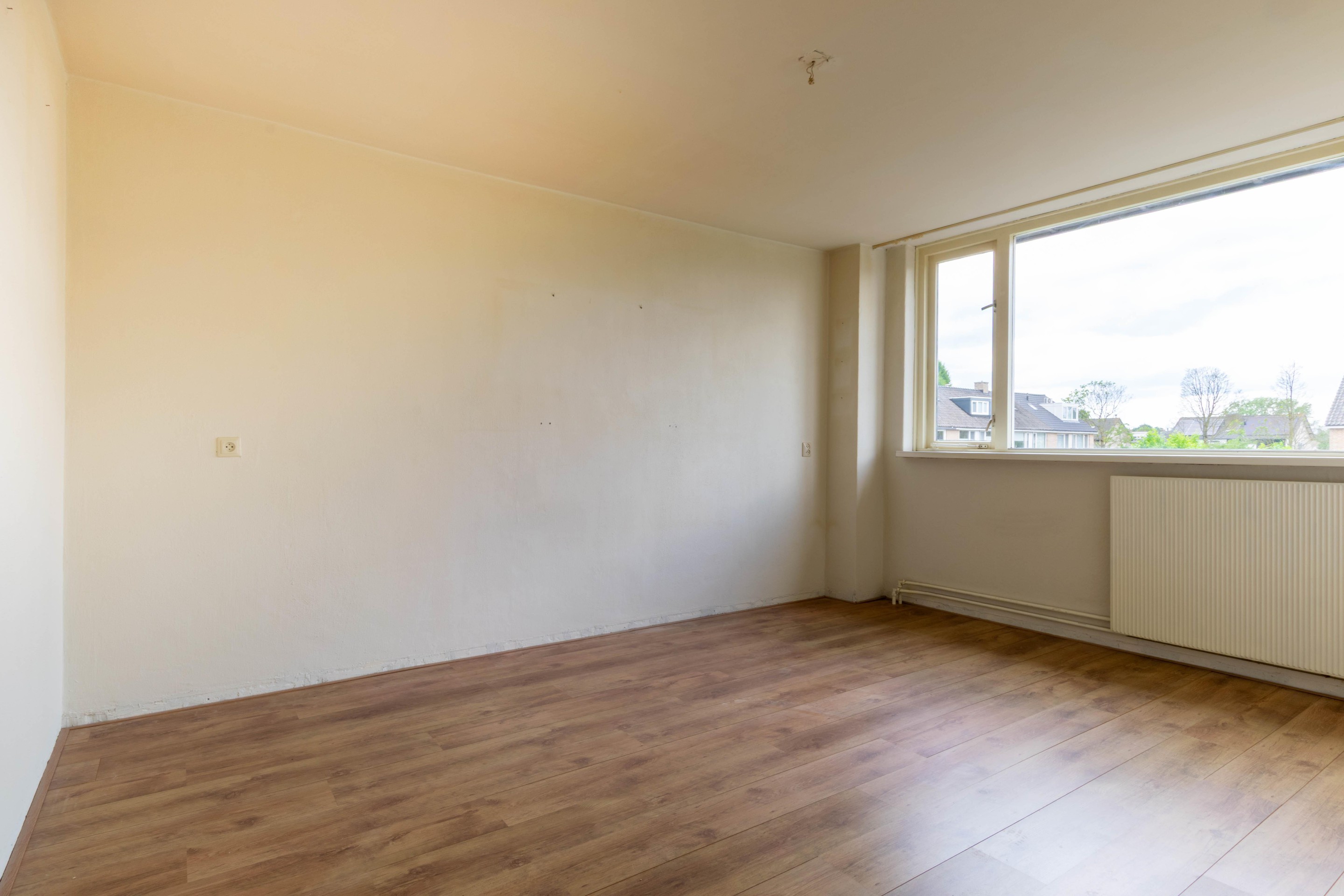 Slaapkamer 4 is voorzien van een dakkapel, laminaatvloer, gestucte wanden, lamellenplafond en bergruimte achter praktische schuifwandkasten.