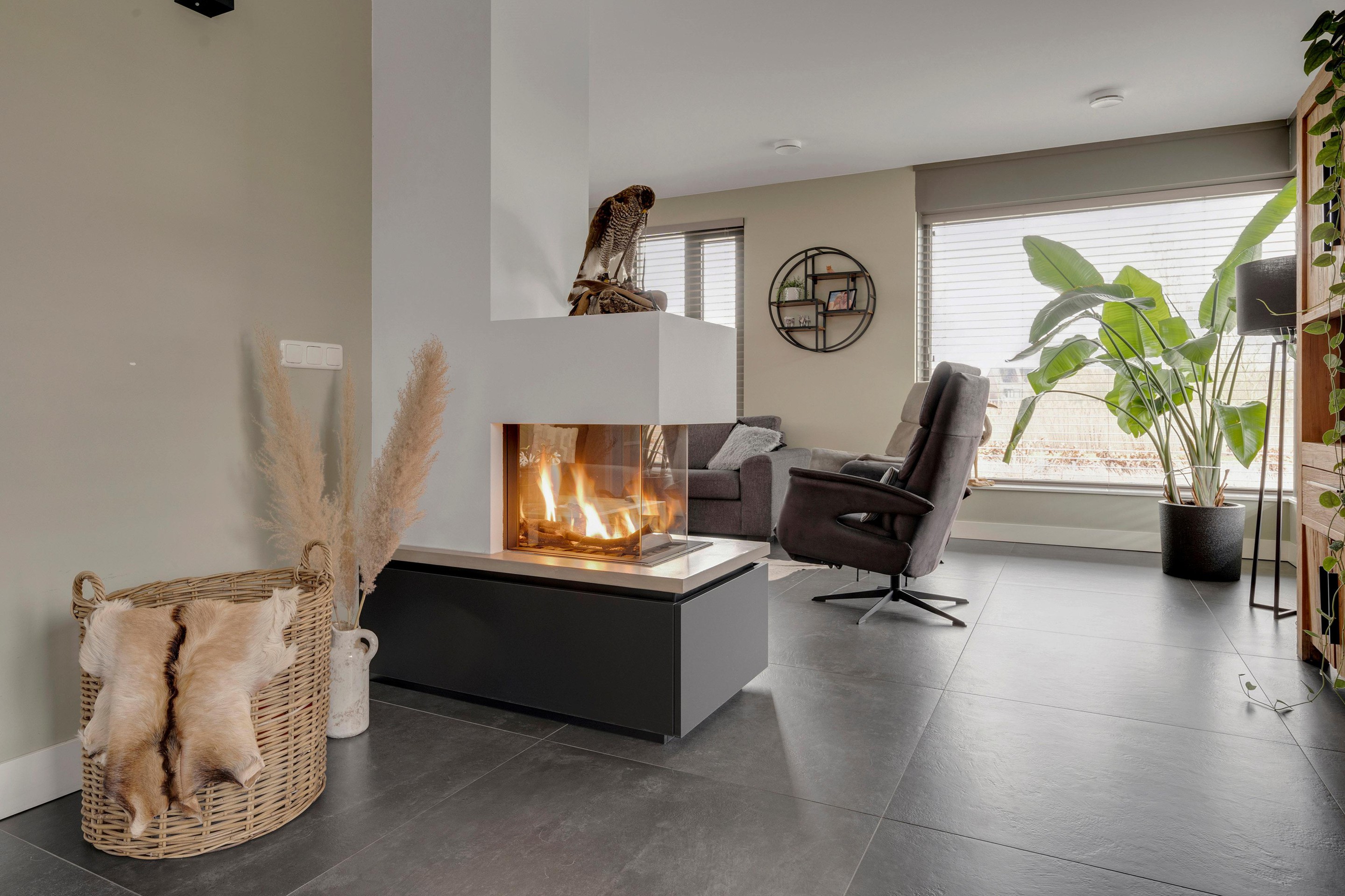 Royale woonkamer met sfeervolle gashaard en met een hoekraam waardoor er een fantastisch zicht op de tegenoverliggende parkvijver is.