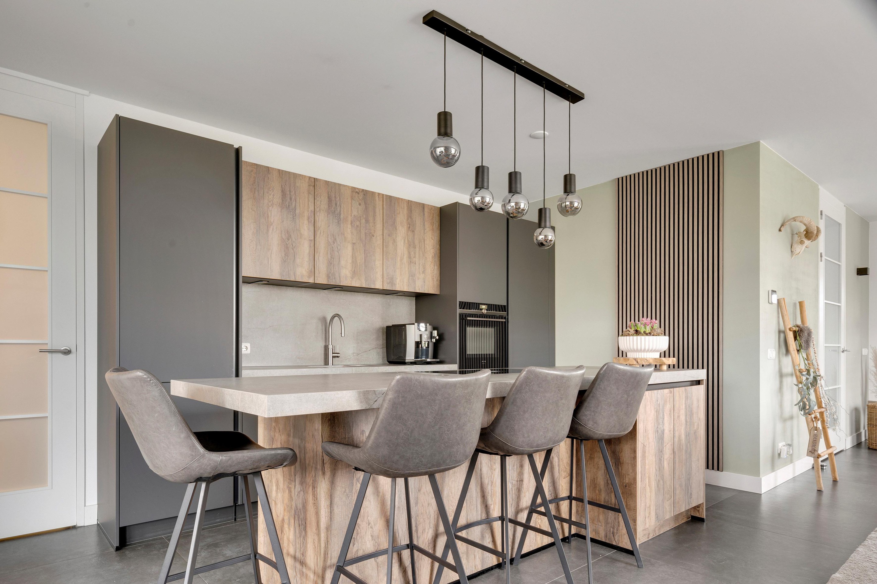 Luxe complete keuken (Koelkast, vriezer, vaatwasmachine, inductiekookplaat Bora, Quooker) met spoeleiland en heeft een warme uitstraling.