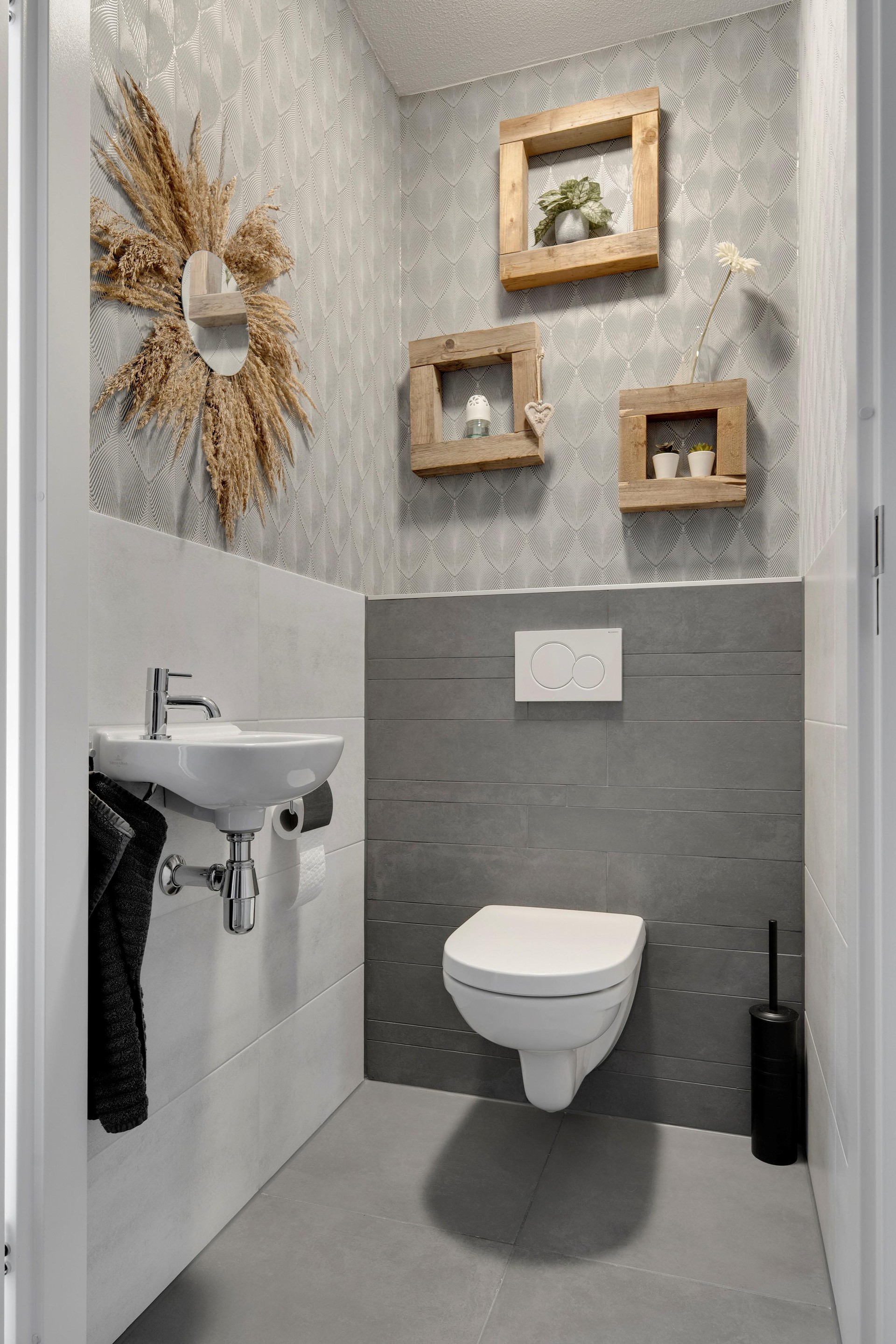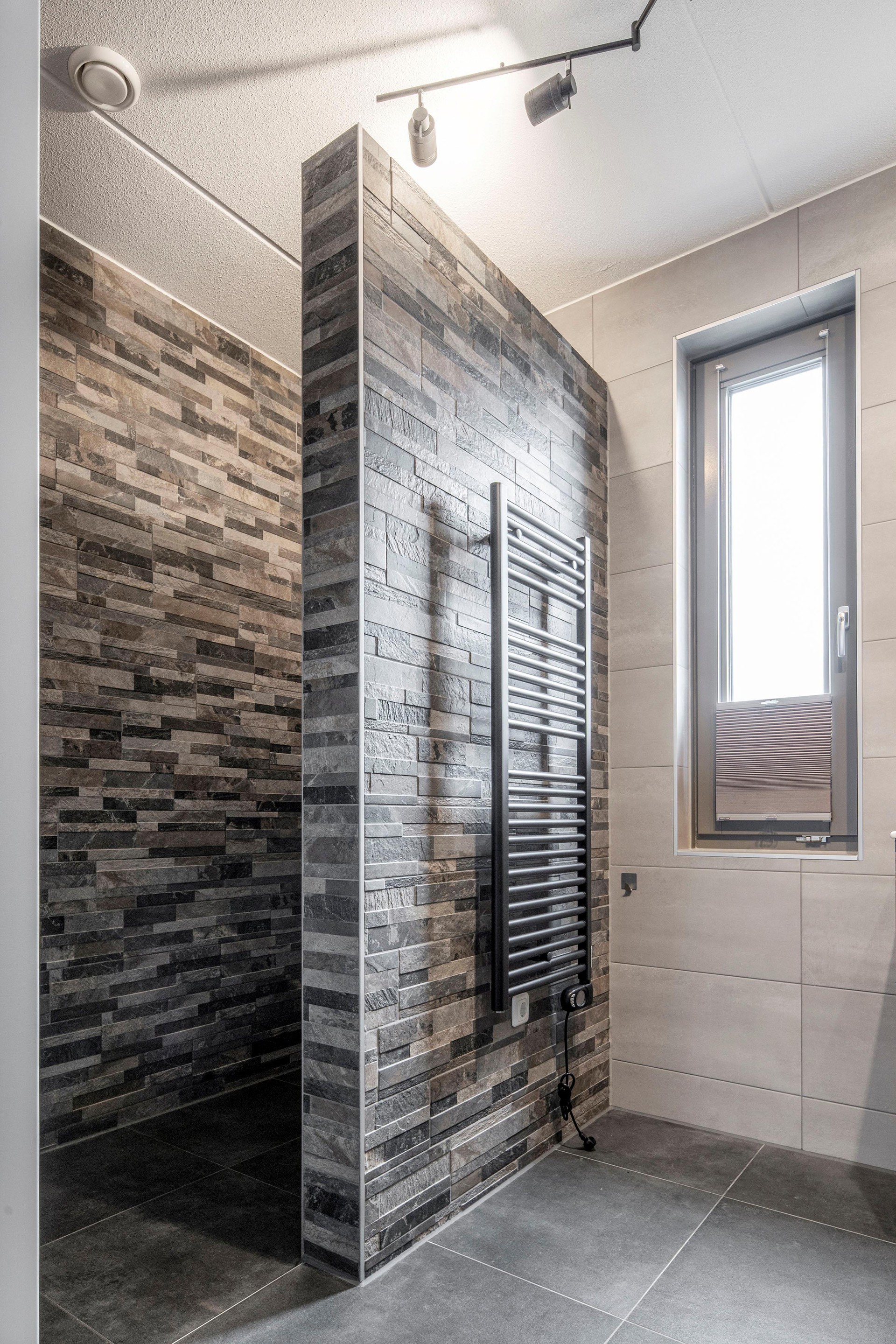 Geheel betegelde badkamer met inloopdouche, kastruimte en dubbel wastafelmeubel.