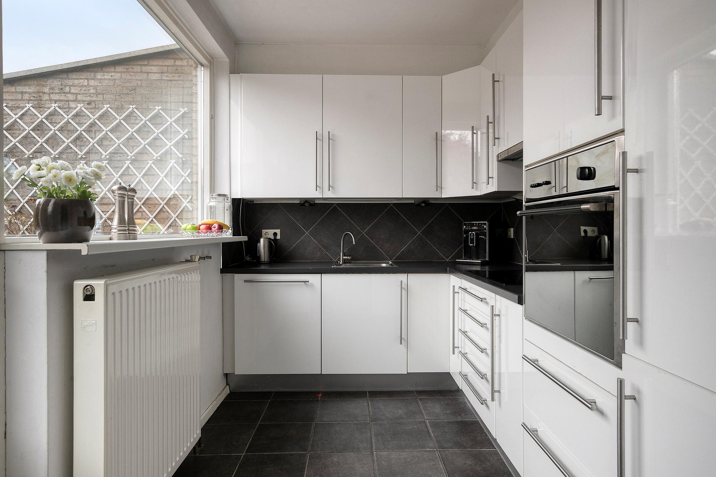 Aan de achterzijde is de keuken gesitueerd, geplaatst in een praktische L-opstelling. Deze is compleet uitgevoerd met een vierpits inductiekookplaat, vlakscherm afzuigkap, oven, koelkast, aparte vrieskast en een vaatwasser. Daarnaast is er volop kastruimte aanwezig en beschikt de keuken over een extra loopdeur naar de tuin.