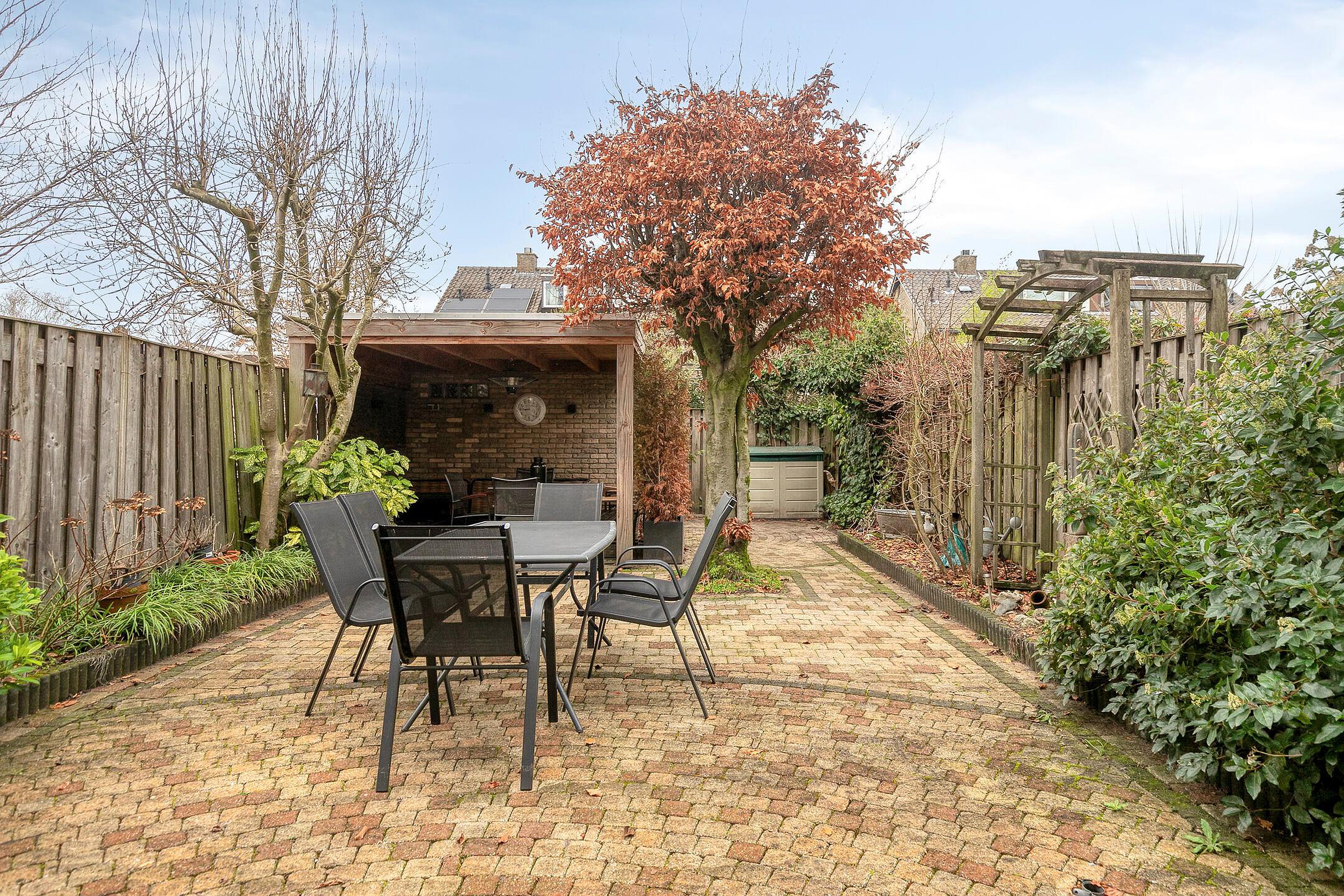 De achtertuin is keurig aangelegd en nagenoeg volledig bestraat, wat zorgt voor een onderhoudsvriendelijke buitenruimte. Langs de zijkanten zijn borders met vaste beplanting aangebracht. Achterin de tuin treft u een stenen berging (3.2m bij 2.8m), voorzien van elektra en deur naar de tuin. Aansluitend is hier een sfeervol overdekt terras gerealiseerd – een fijne plek om beschut buiten te zitten. De tuin beschikt over een achterom en er is een buitenkraan aanwezig.