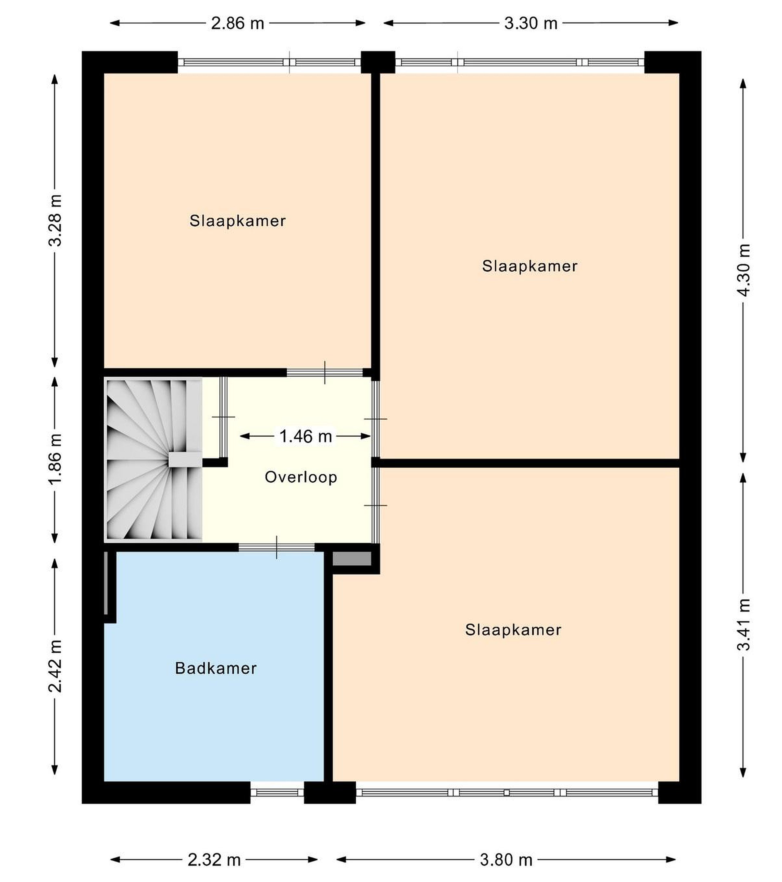 Eerste verdieping Op de eerste verdieping komt u op de overloop, afgewerkt met een lamelparket vloer en stucwerk wanden/plafond. Hier bevinden zich drie slaapkamers respectievelijk 14m2, 12.4m2 en 9.3m2 groot.