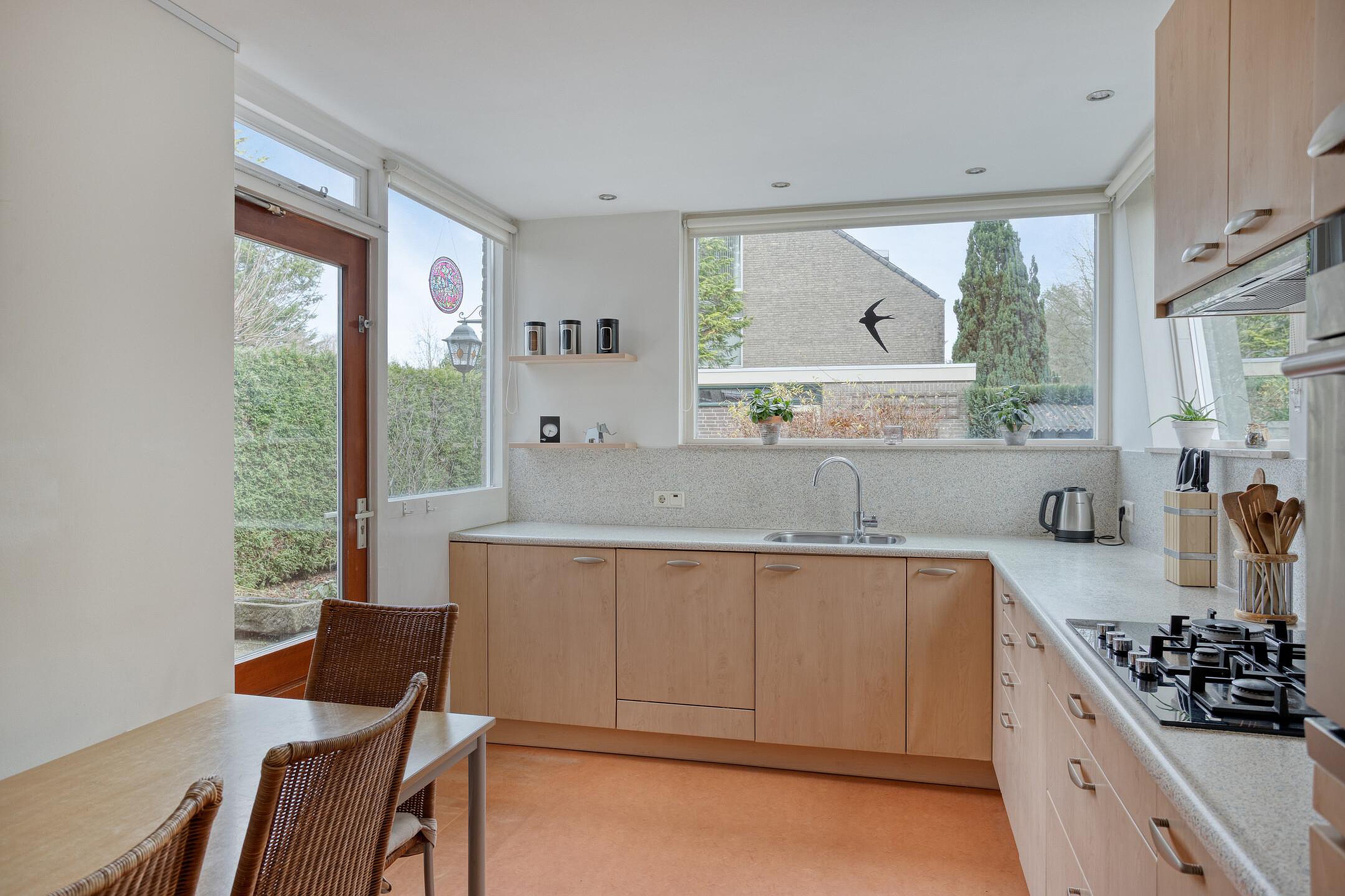 Vanuit de hal toegang tot de dichte keuken. De keuken met fijne grote raampartijen is uitgevoerd in een praktische L-opstelling en beschikt over een vaatwasser, 5-pits gaskookplaat, vlakscherm afzuigkap, koelkast, vrieskast en combimagnetron. Het stucwerk plafond is voorzien van inbouwspots en via een extra deur stapt u zo de achtertuin in. Tevens is de keuken ruim genoeg voor een zitje.