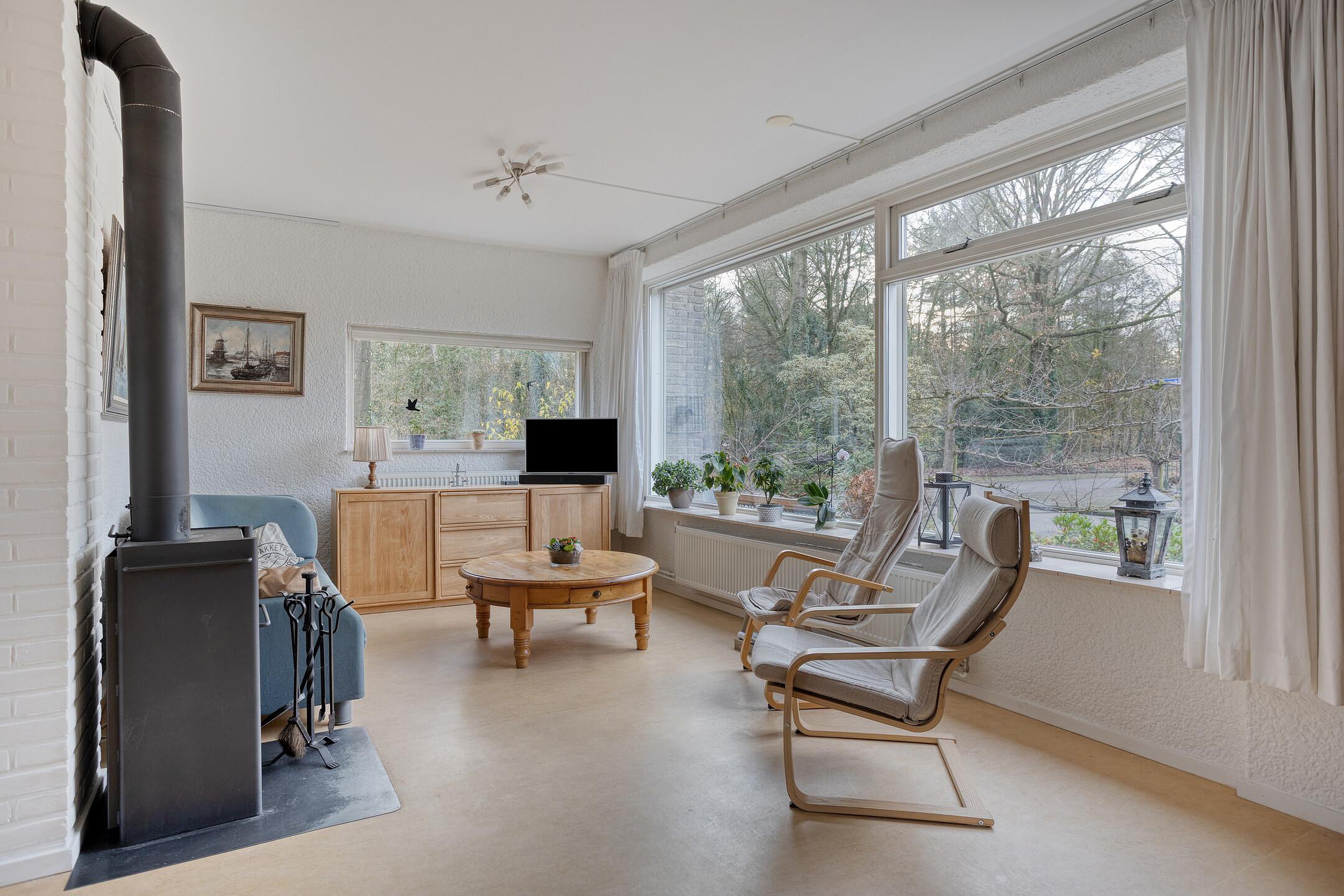 De royale living in een L-vorm is voorzien van schoonmetselwerk en krabwerk wanden en een stucwerk plafond, hier kunt u zowel een royale zit- als eetopstelling kwijt. De zithoek aan de voorzijde heeft een sfeervolle houtkachel. De voorramen zijn uitgerust met zonnescreens, ideaal op zonnige dagen. Aan de achterzijde zorgen de grote schuifpui en het zicht op de tuin voor een heerlijk gevoel van ruimte. Hier is bovendien een zonnescherm geplaatst, waardoor u ook op warme dagen comfortabel geniet. Een schilderij-ophangsysteem maakt het bovendien eenvoudig om uw kunstwerken stijlvol te presenteren.