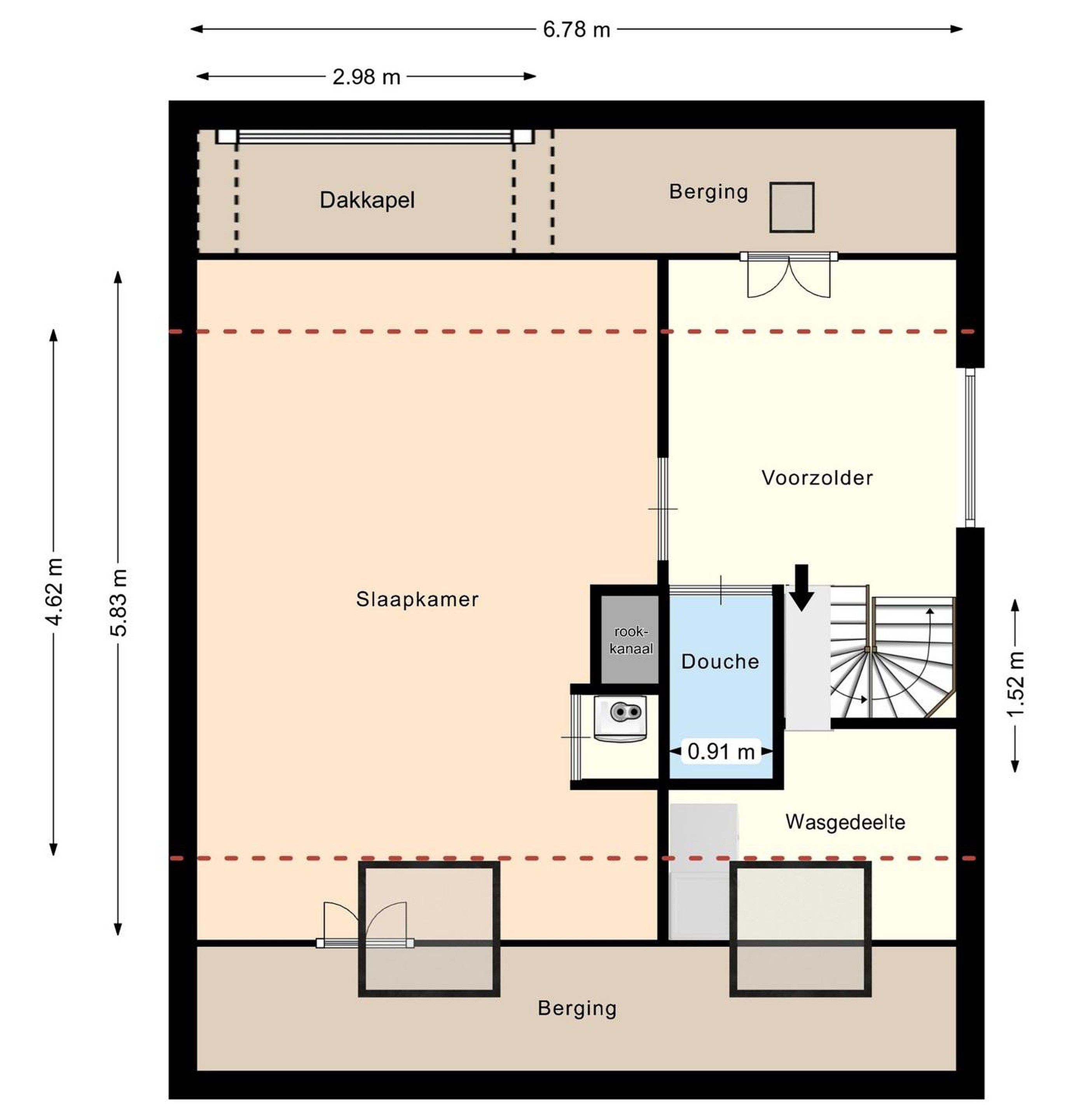 Tweede verdieping Via een vaste trap bereikt u de tweede verdieping. De overloop is opnieuw licht dankzij een zijgevelraam en een Velux dakvenster, en is keurig afgewerkt.