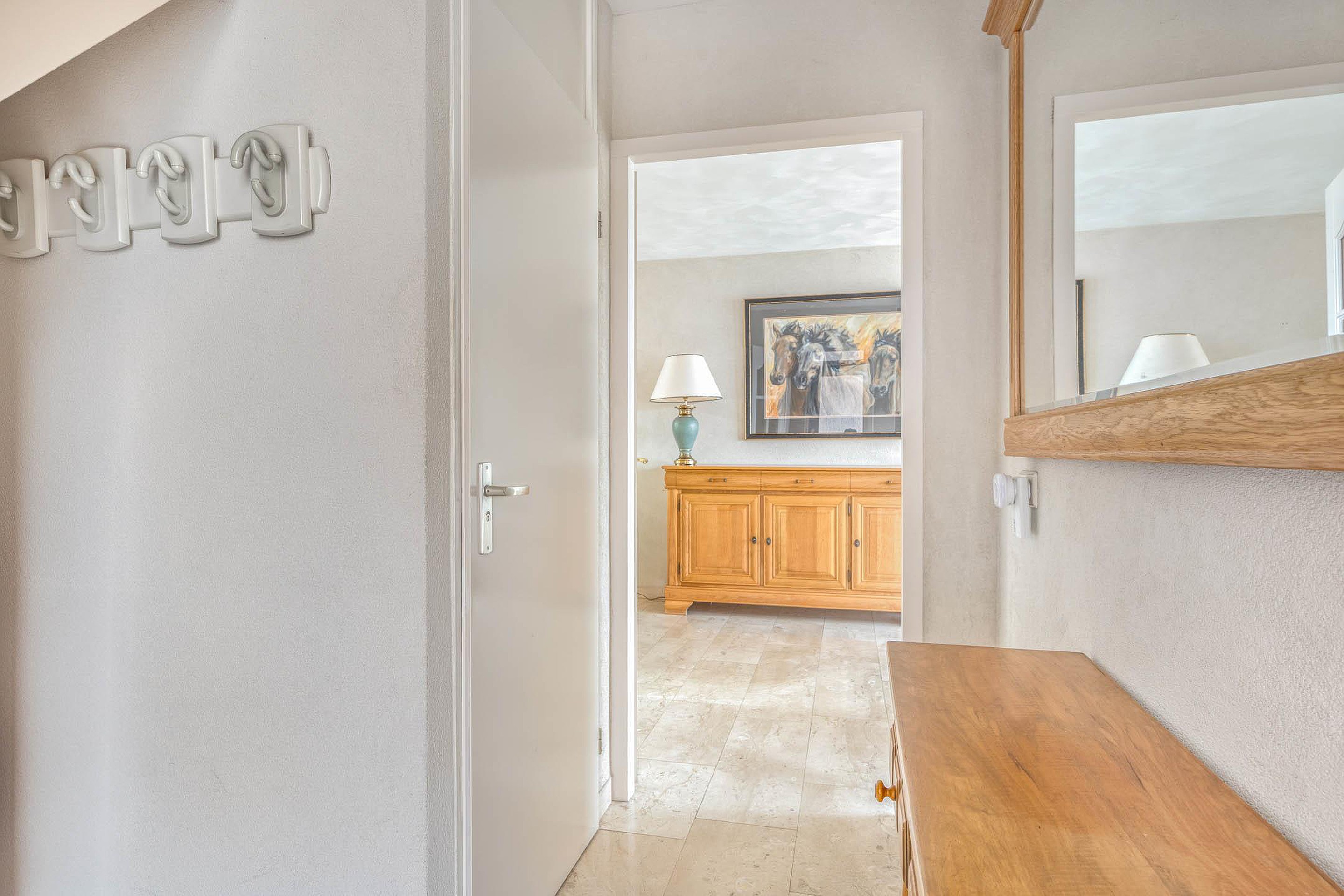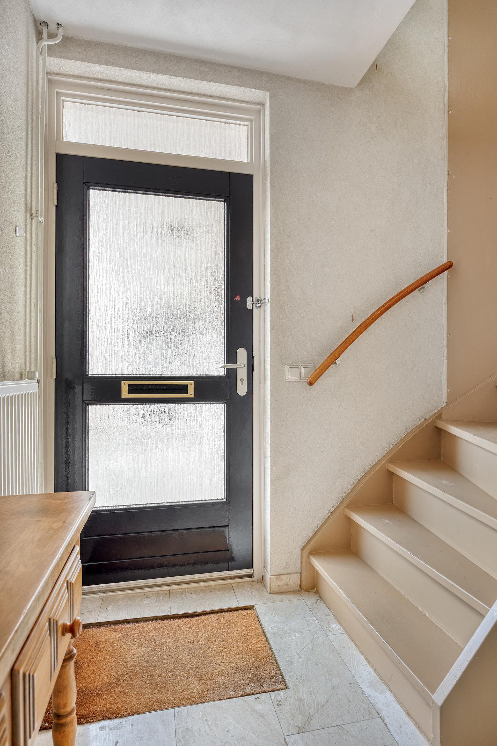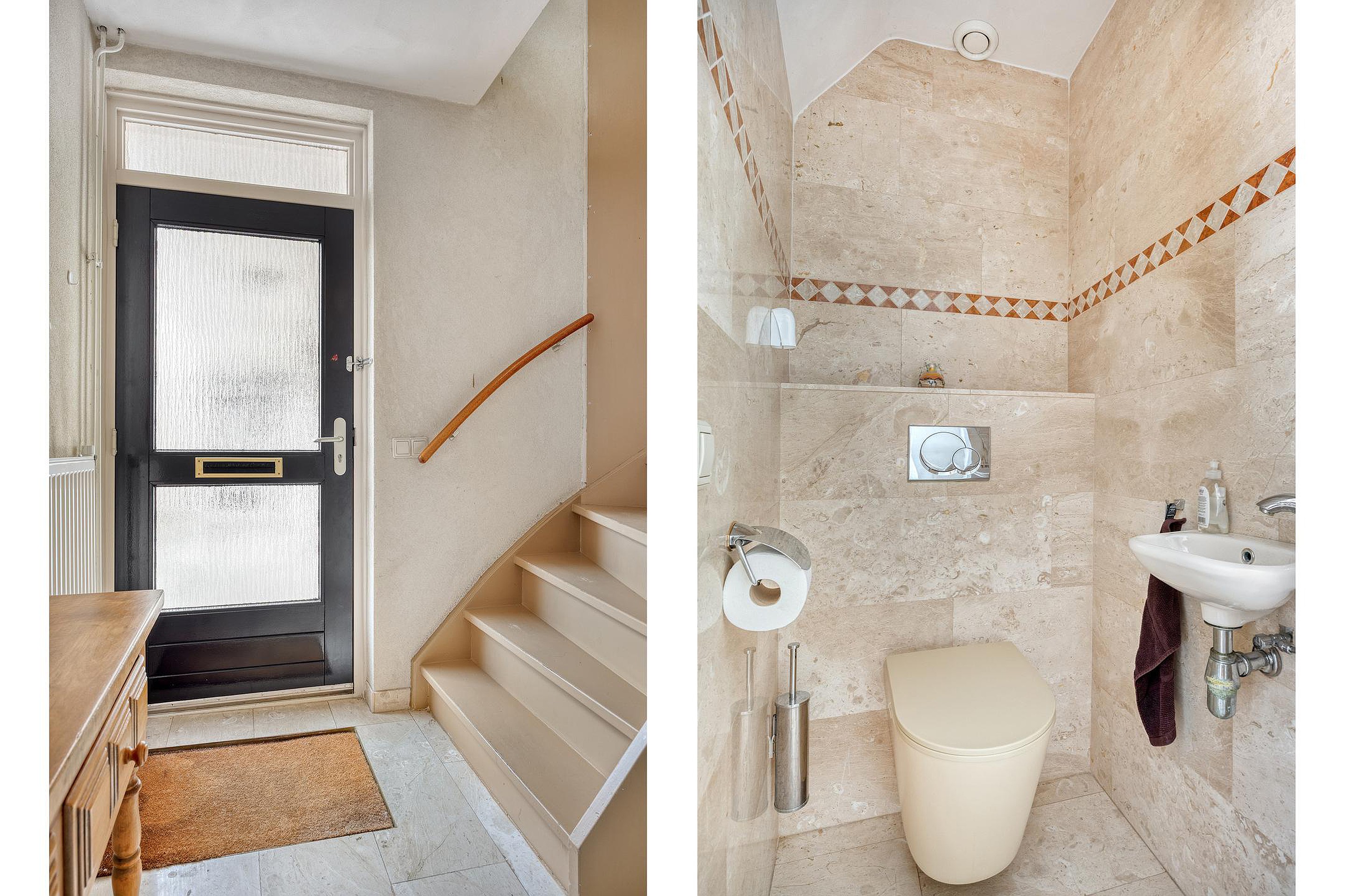 Via de oprit met overdekte entree bereikt u via de zijgevel de woning en stapt u binnen in de verzorgde ontvangsthal. Vanuit de hal heeft u toegang tot de woonkamer, toiletruimte en de trapopgang naar de verdiepingen. De toiletruimte is uitgevoerd met zowel vloer als wanden in natuurstenen tegels en voorzien van een vrijdragend toilet en een fonteintje.