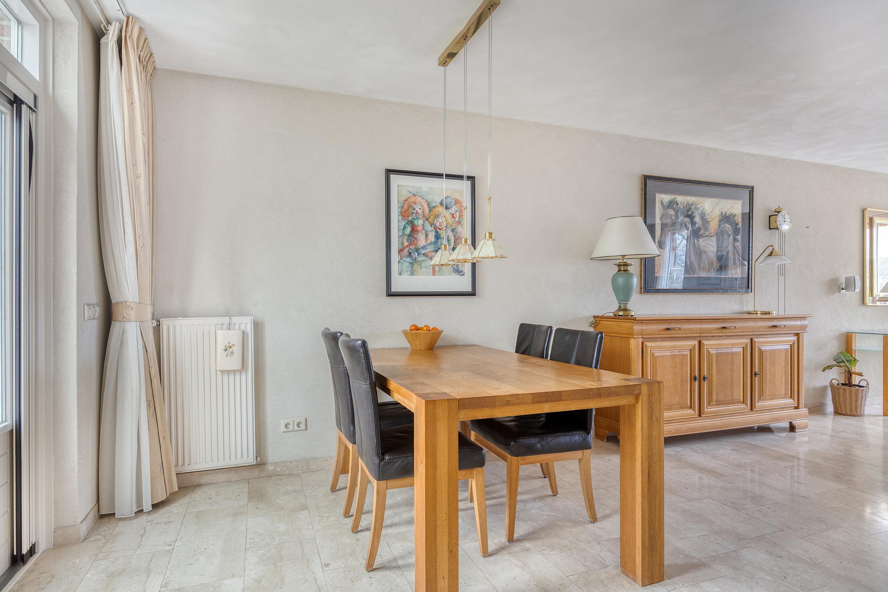 De woonkamer is uitgevoerd in L-vorm, met aan de voorzijde het zitgedeelte, deze beschikt over een sfeervolle gashaard. Grote raampartijen bieden zorgen voor veel lichtinval en een fraai vrij uitzicht. Aan de voorzijde zijn er sfeervolle markiezen aanwezig en een zonnescreen bij het zijgevelraam. Aan de achterzijde stapt u via de dubbele tuindeuren zo het overdekt terras in.