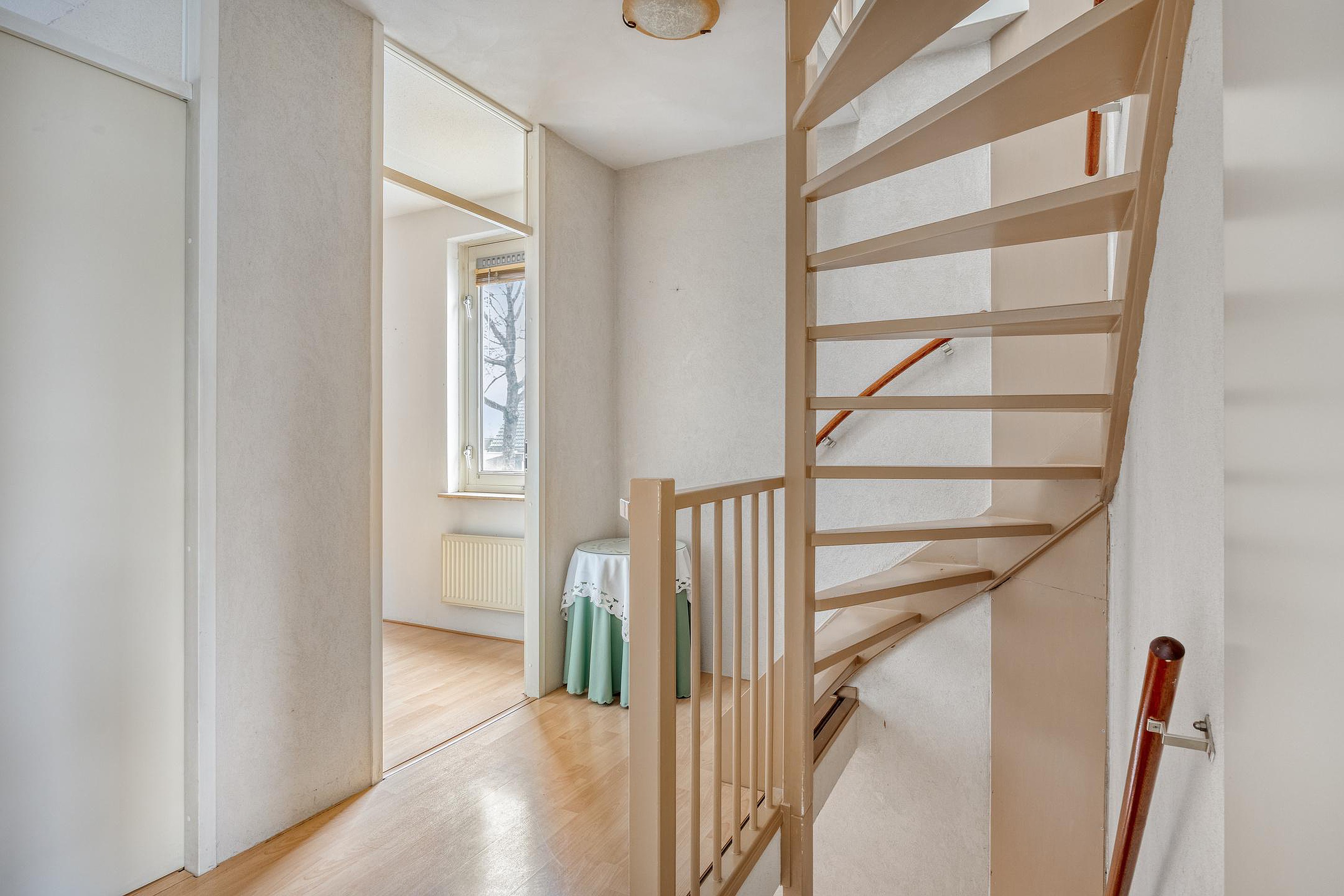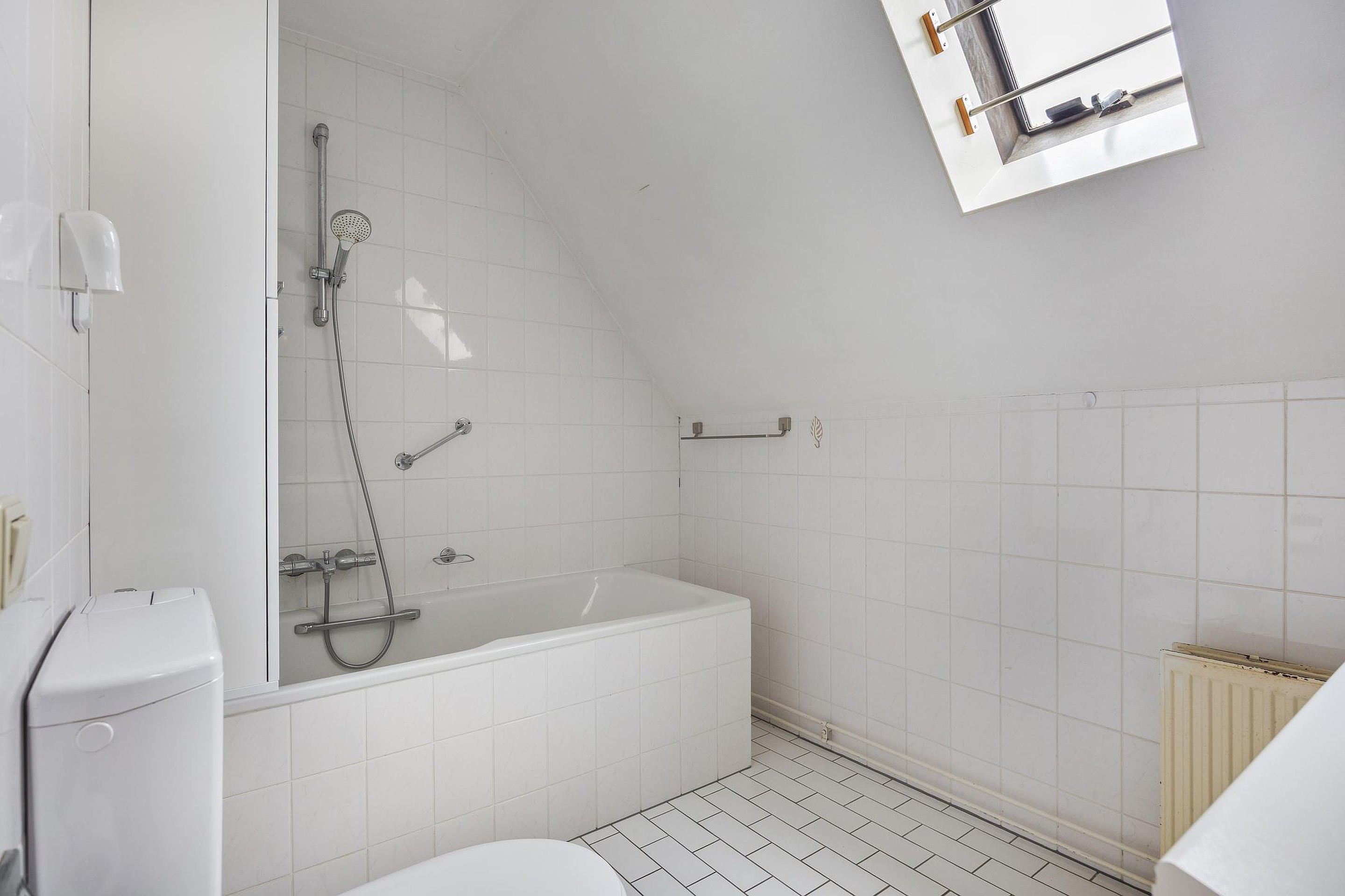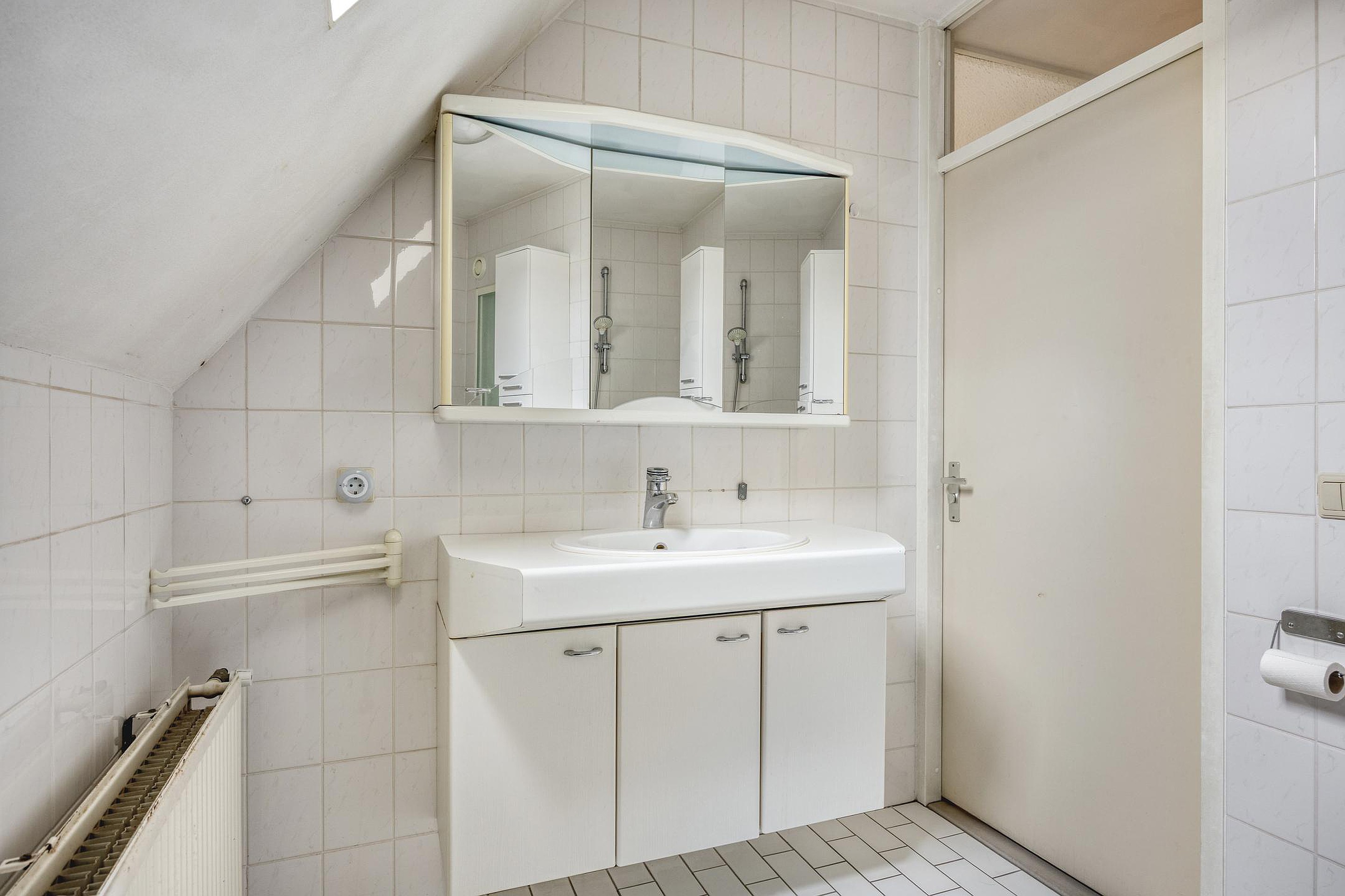 Eerste verdieping Via de vaste trap bereikt u de 1e verdieping. De overloop is netjes afgewerkt met een laminaatvloer en spachtelputz wanden. Slaapkamer 1, momenteel ingericht als werkkamer, is voorzien van een laminaat vloer, gestucte wanden en zijgevelraam. Slaapkamer 2 is eveneens afgewerkt met een laminaat vloer en stucwerkwanden en beschikt over een dakkapel met vrij uitzicht aan de voorzijde. Extra fijn is de grote vaste kastenwand, die zorgt voor volop bergruimte. Ook is hier een handmatig bedienbaar rolluik aanwezig. Aan de achterzijde bevindt zich slaapkamer 3, eveneens keurig afgewerkt met een laminaatvloer, stucwerk wanden/plafond, een vaste wastafel en tevens een dakkapel. De badkamer is eenvoudig, grotendeels betegeld en beschikt over een ligbad met douchespatscherm, een wastafel met een dubbel meubel met spiegel, toilet en dakraam.