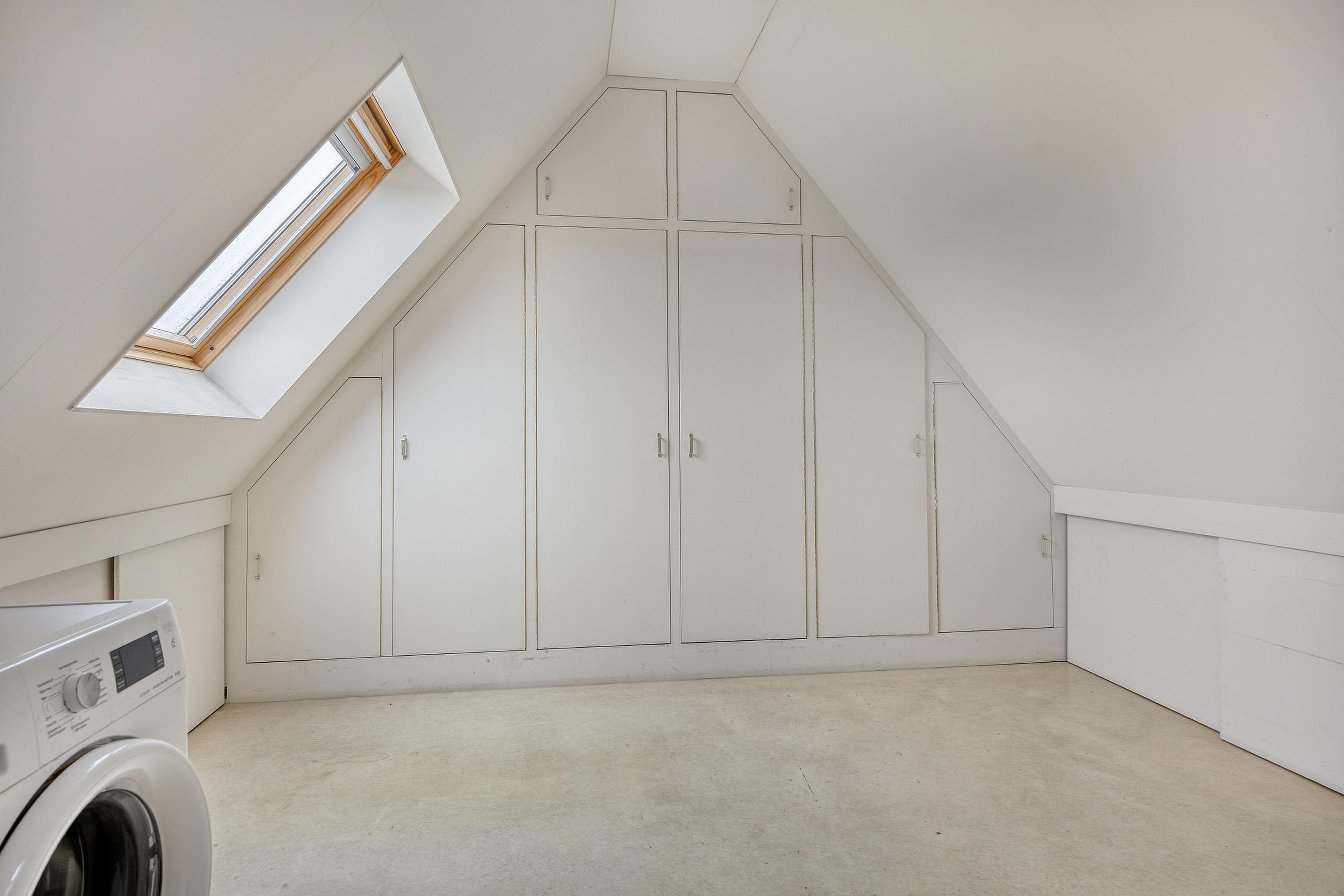 Tweede verdieping Via de vaste trap komt u op een verrassend ruime en keurig afgewerkte zolderverdieping welke voorzien is van een vinylvloer, vaste wandkasten, knieschotten voor extra bergruimte en een Velux dakraam met verduistering. Hier bevinden zich de aansluitingen t.b.v. de wasapparatuur, de mechanische ventilatie unit en de opstelling HR-combiketel Intergas (2007).