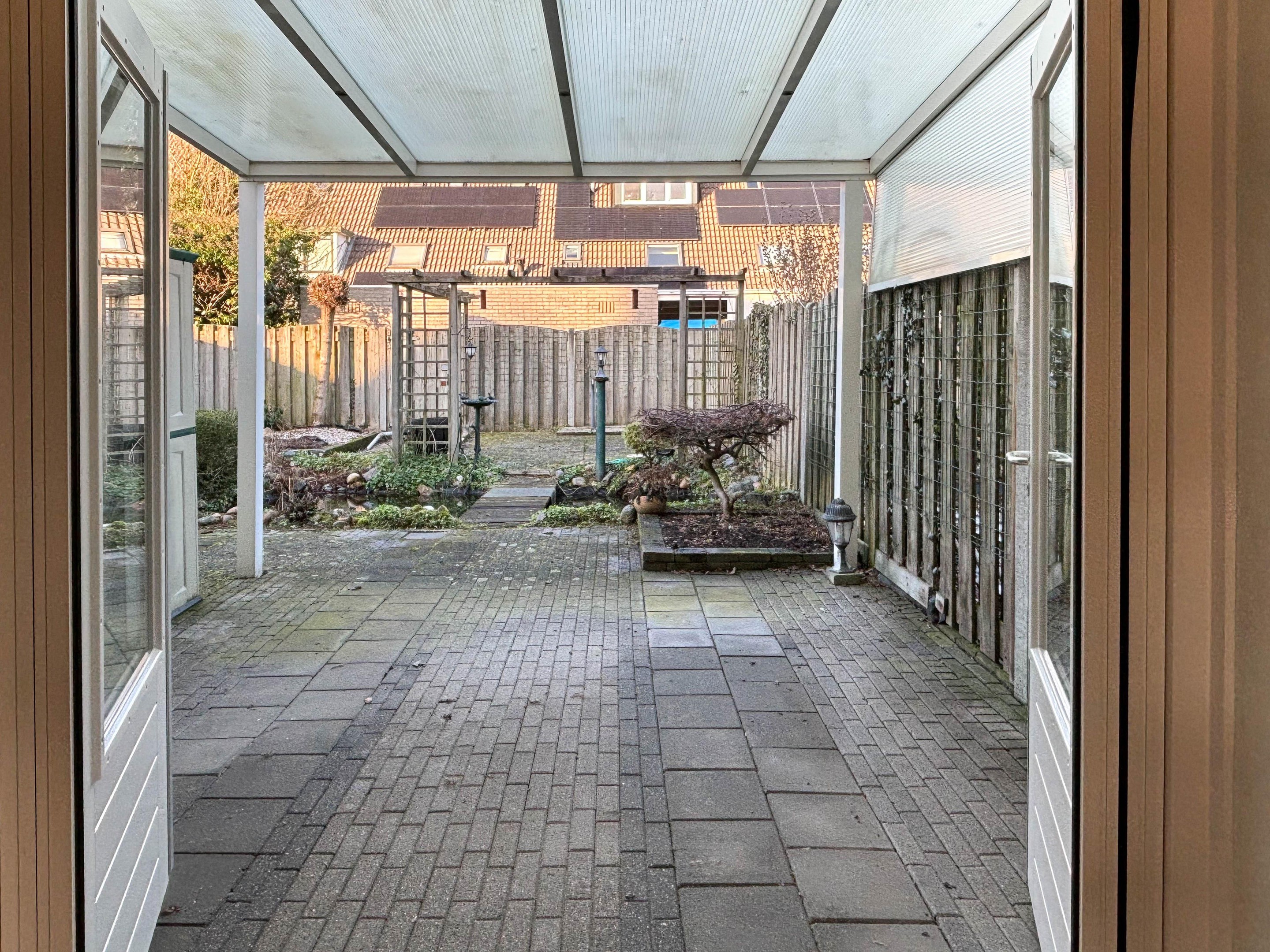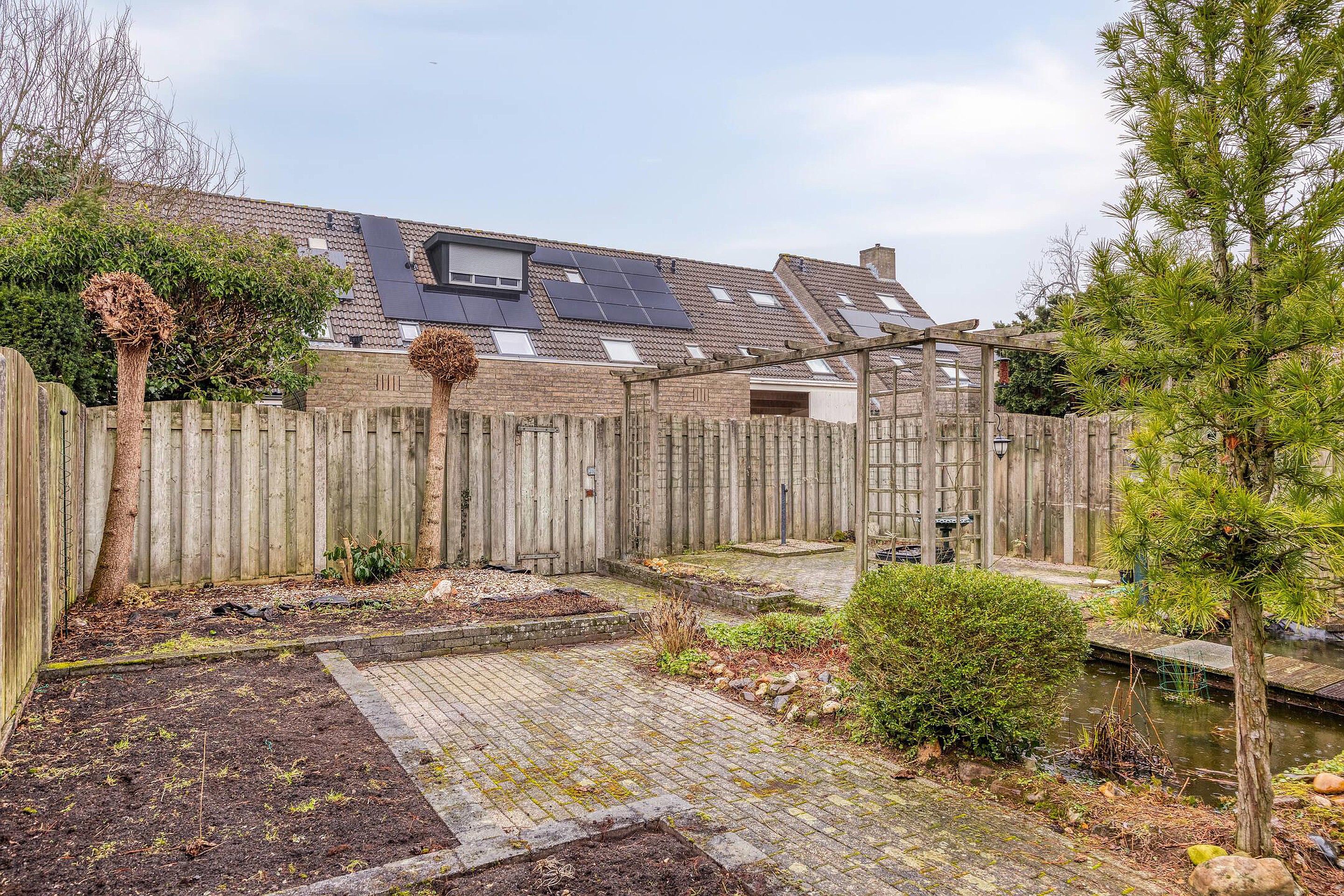 De tuin beschikt over een achterom en is volledig omheind.