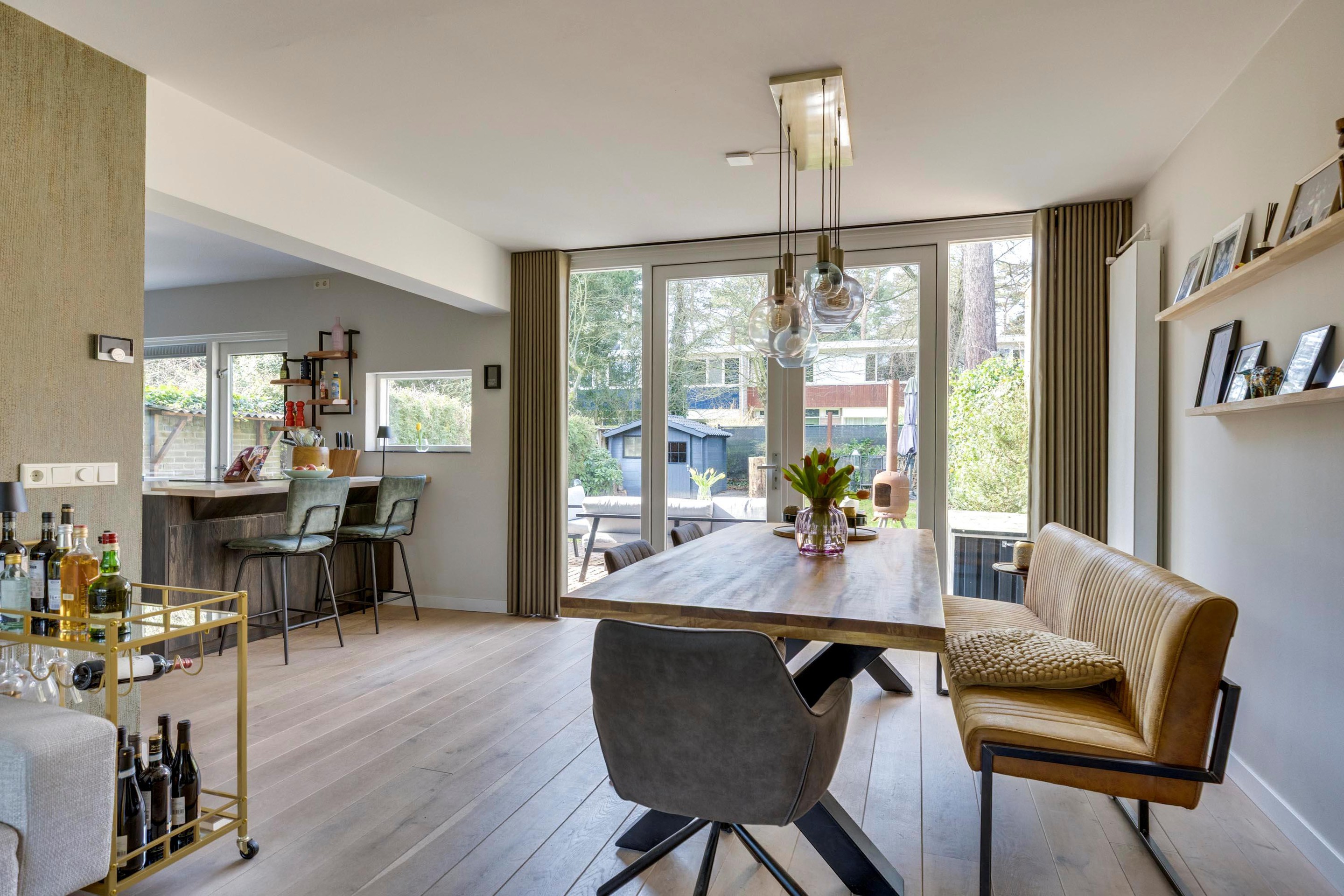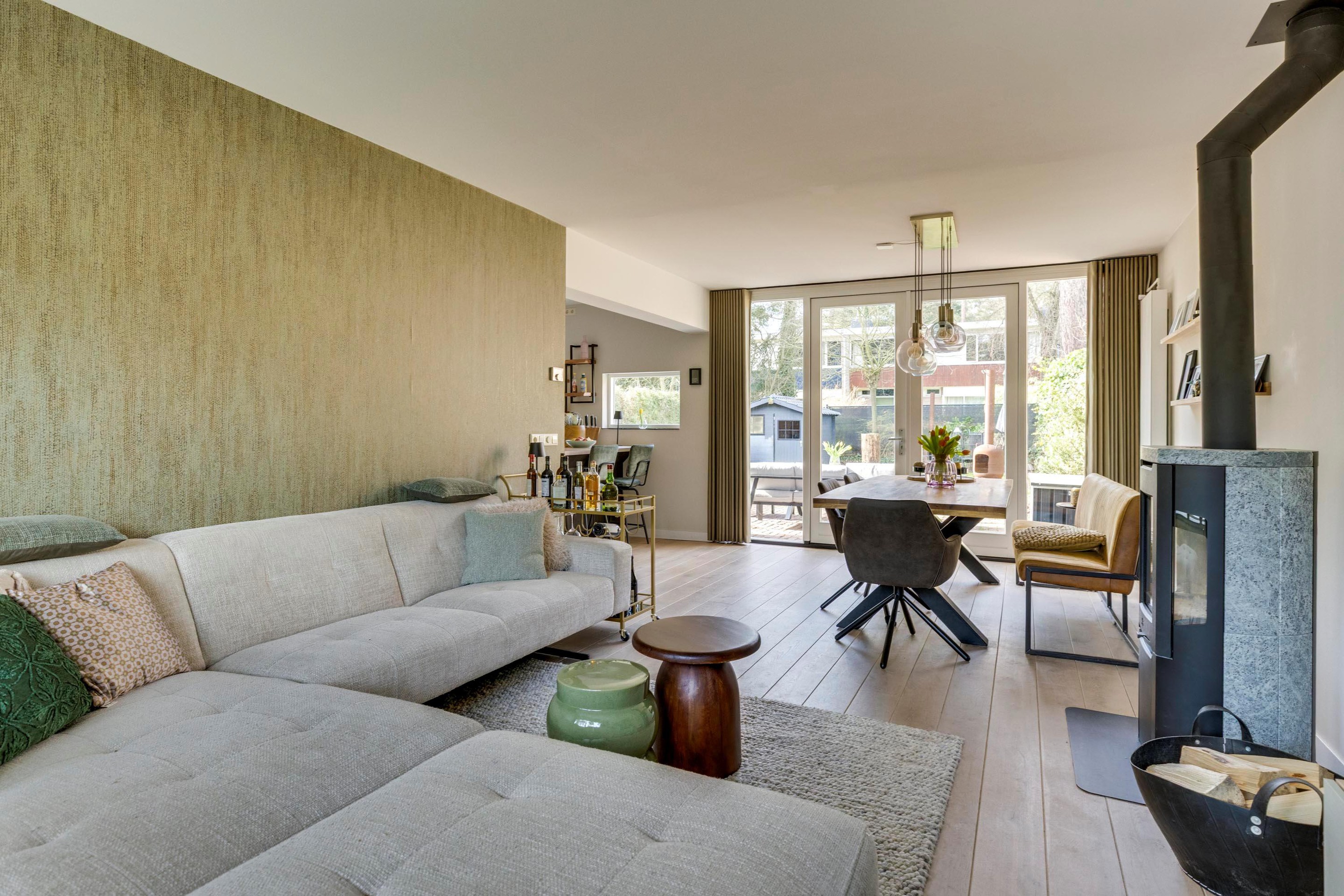 De woonkamer is een heerlijke leefruimte met een warme en moderne uitstraling. De houten vloer, hoge plinten en het strakke stucwerk vormen een stijlvolle basis. Centraal staat de sfeervolle houtkachel (TO). Aan de achterzijde bevindt zich het eetgedeelte met openslaande deuren naar de tuin – een prachtige verbinding tussen binnen en buiten. Bij de grote pui is bovendien een zonnescherm aanwezig.