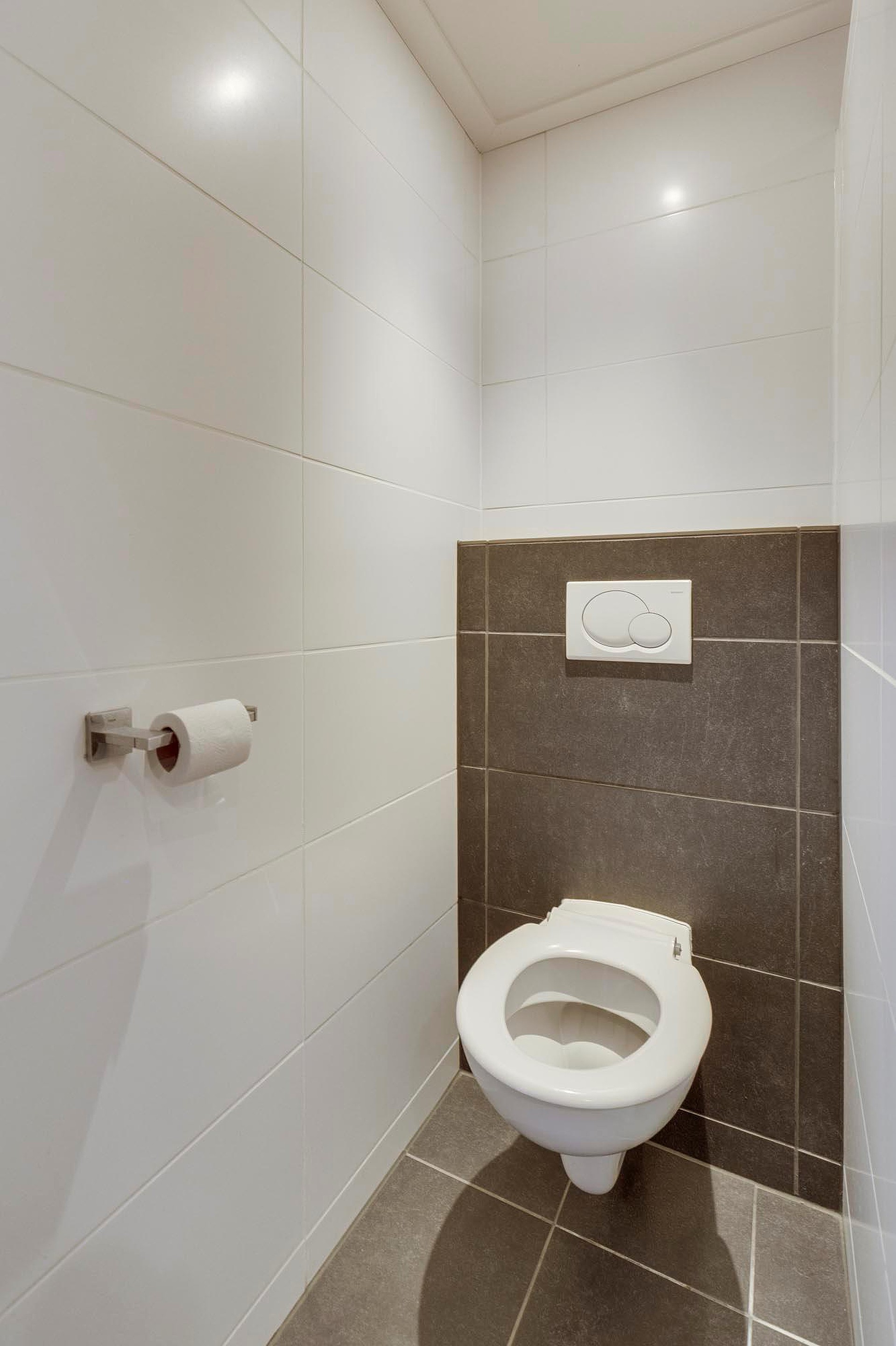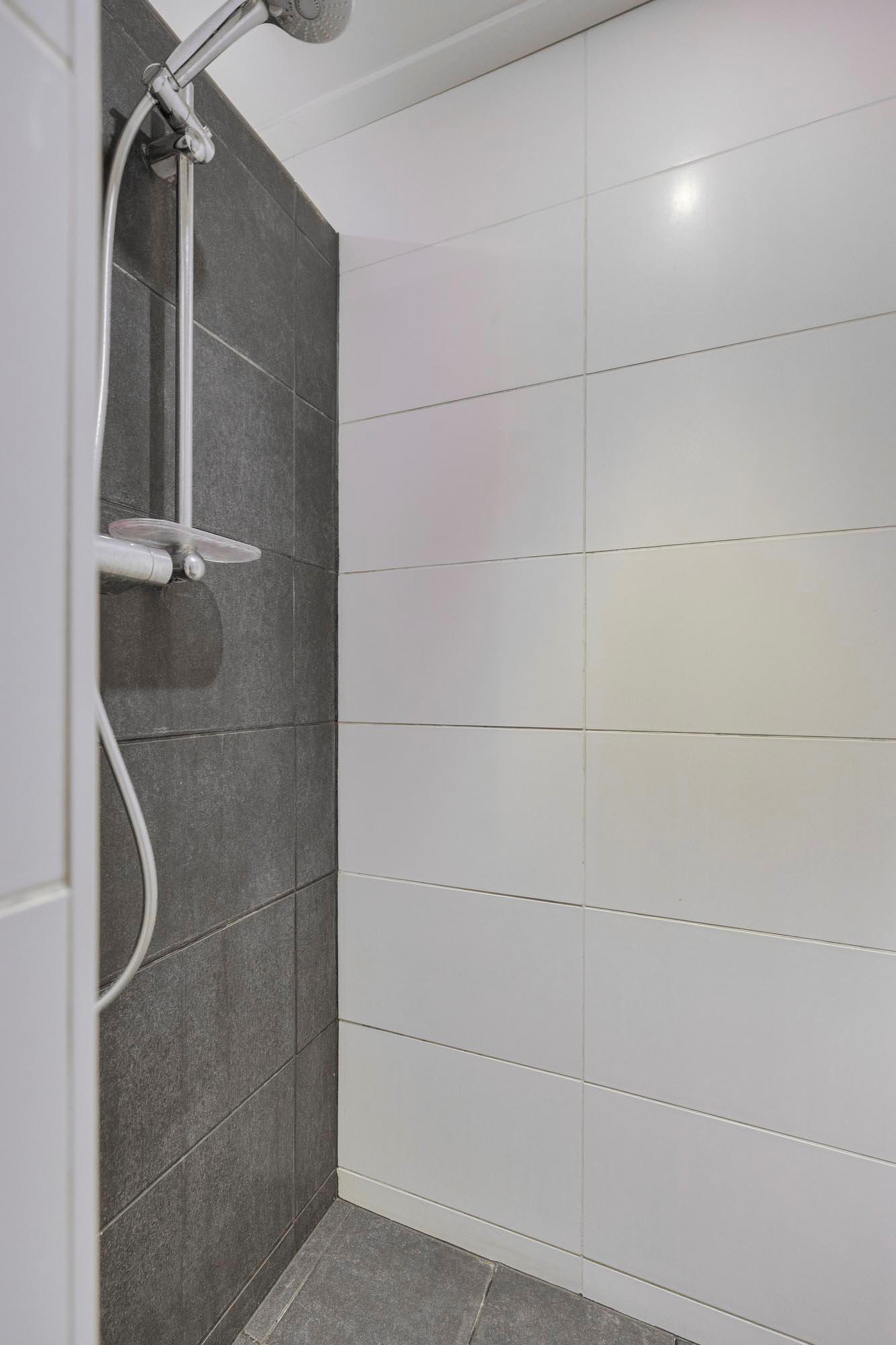 De moderne badkamer is volledig betegeld en compleet uitgerust met een inloopdouche, twee wastafels en een vrijdragend toilet. De handdoekenradiator en inbouwspots maken het geheel af.