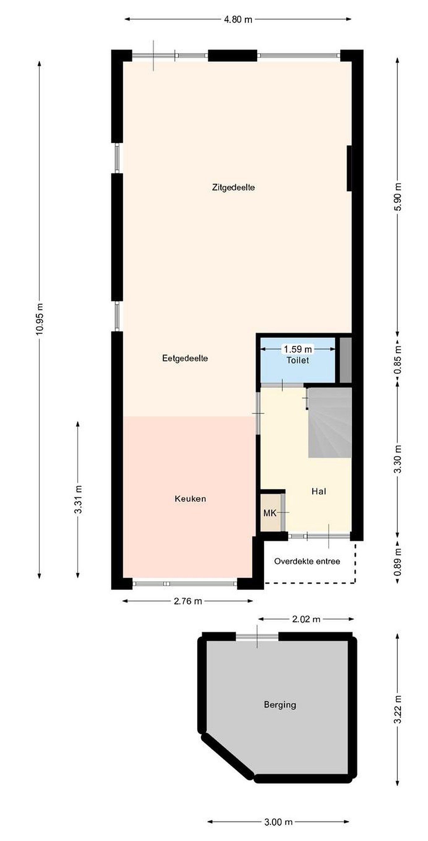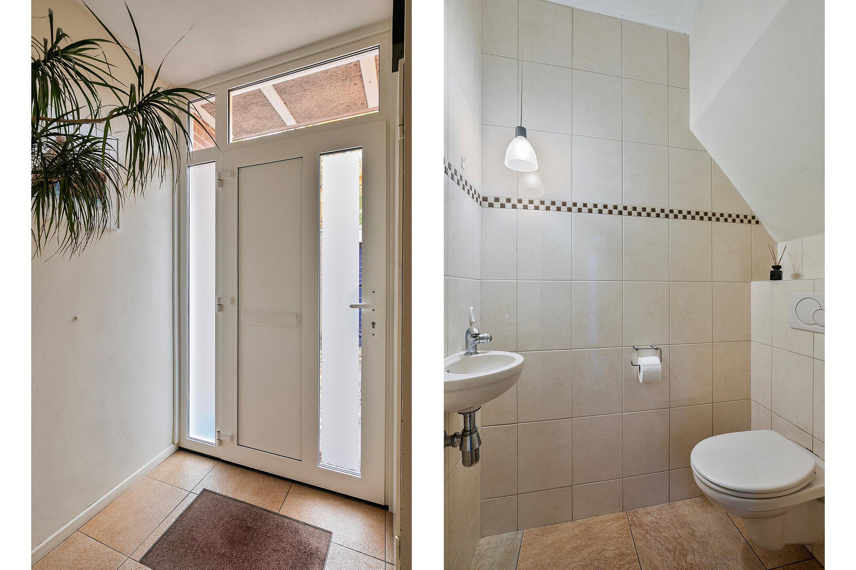 Via de nette voortuin, waar zich ook de praktische stenen berging bevindt, bereikt u de overdekte entree. In de ontvangsthal bevinden zich de trapopgang, meterkast en een trapkast met de vloerverwarmingsunit. De toiletruimte is geheel betegeld en voorzien van een vrijdragend toilet en fonteintje.