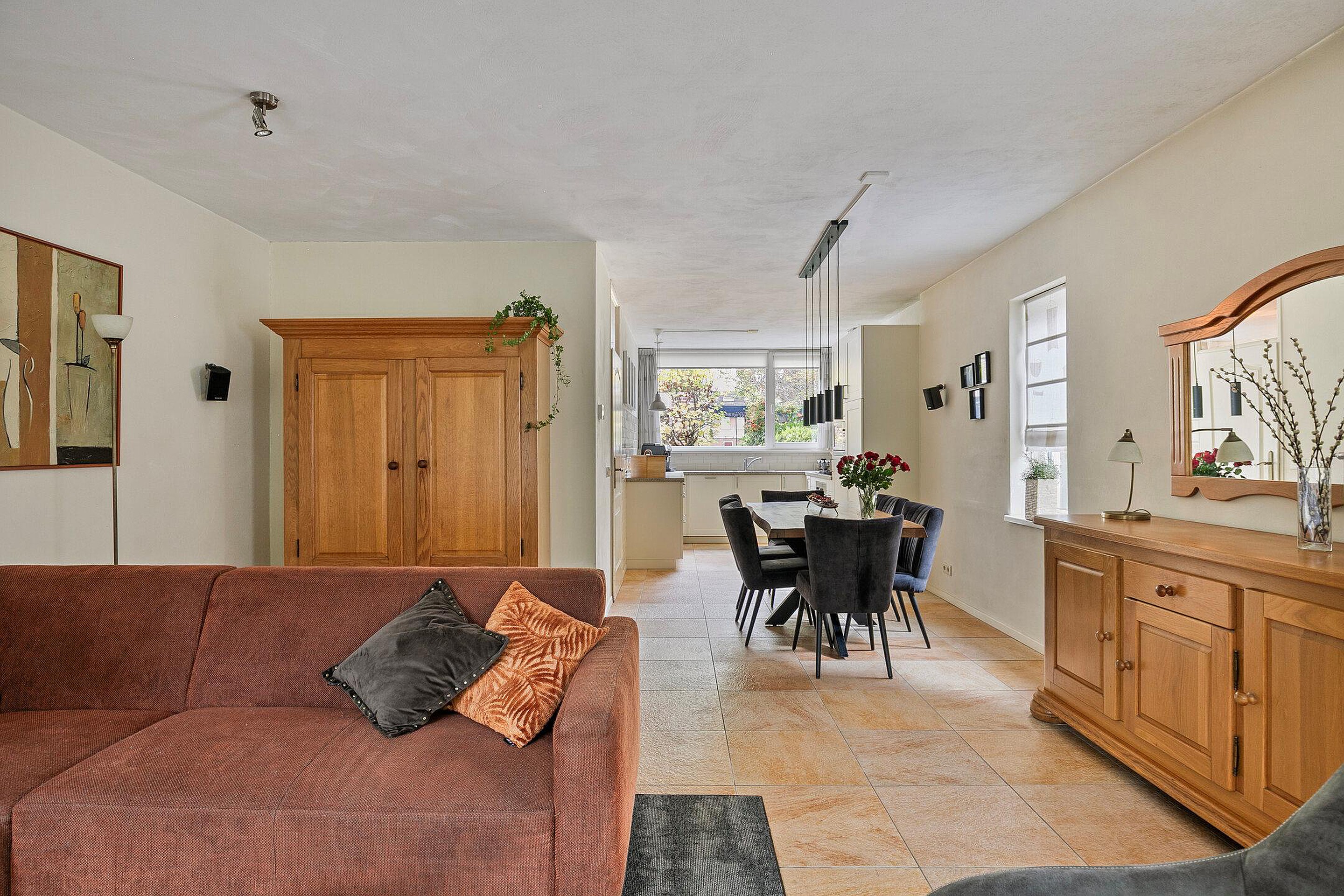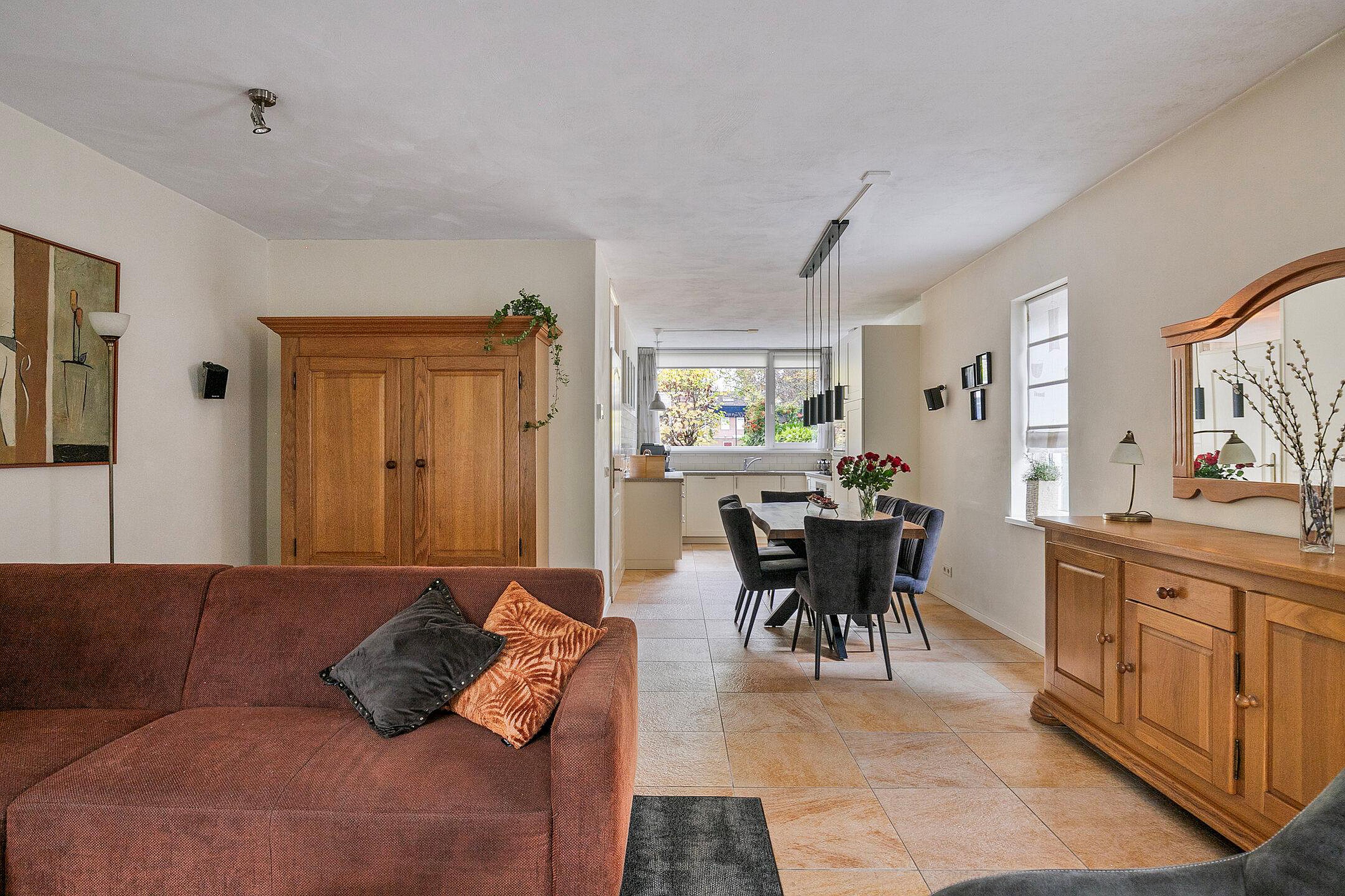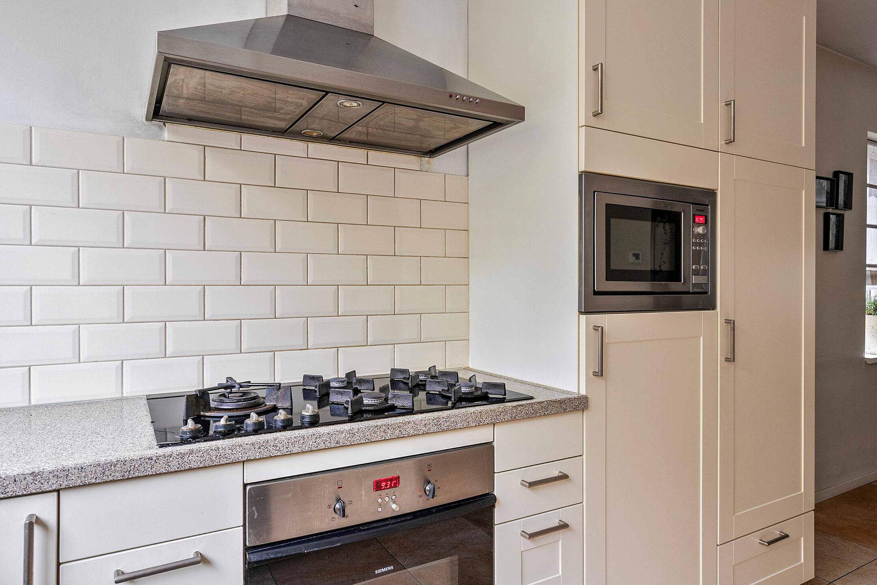 De woonkamer is verrassend ruim dankzij de uitbouw aan de achterzijde. Het geheel is stijlvol afgewerkt met een tegelvloer voorzien van vloerverwarming en gestucte wanden/plafond. Dankzij de extra zijgevelramen geniet u hier van extra daglicht. Aan de voorzijde bevindt zich de keuken, opgesteld in een praktische U-vorm. Deze is compleet uitgerust met een 5-pits gaskookplaat, afzuigkap, oven, magnetron, koelkast, vriezer, vaatwasser (ca. 1 jaar oud) en volop kastruimte – waaronder een handige carrouselkast.