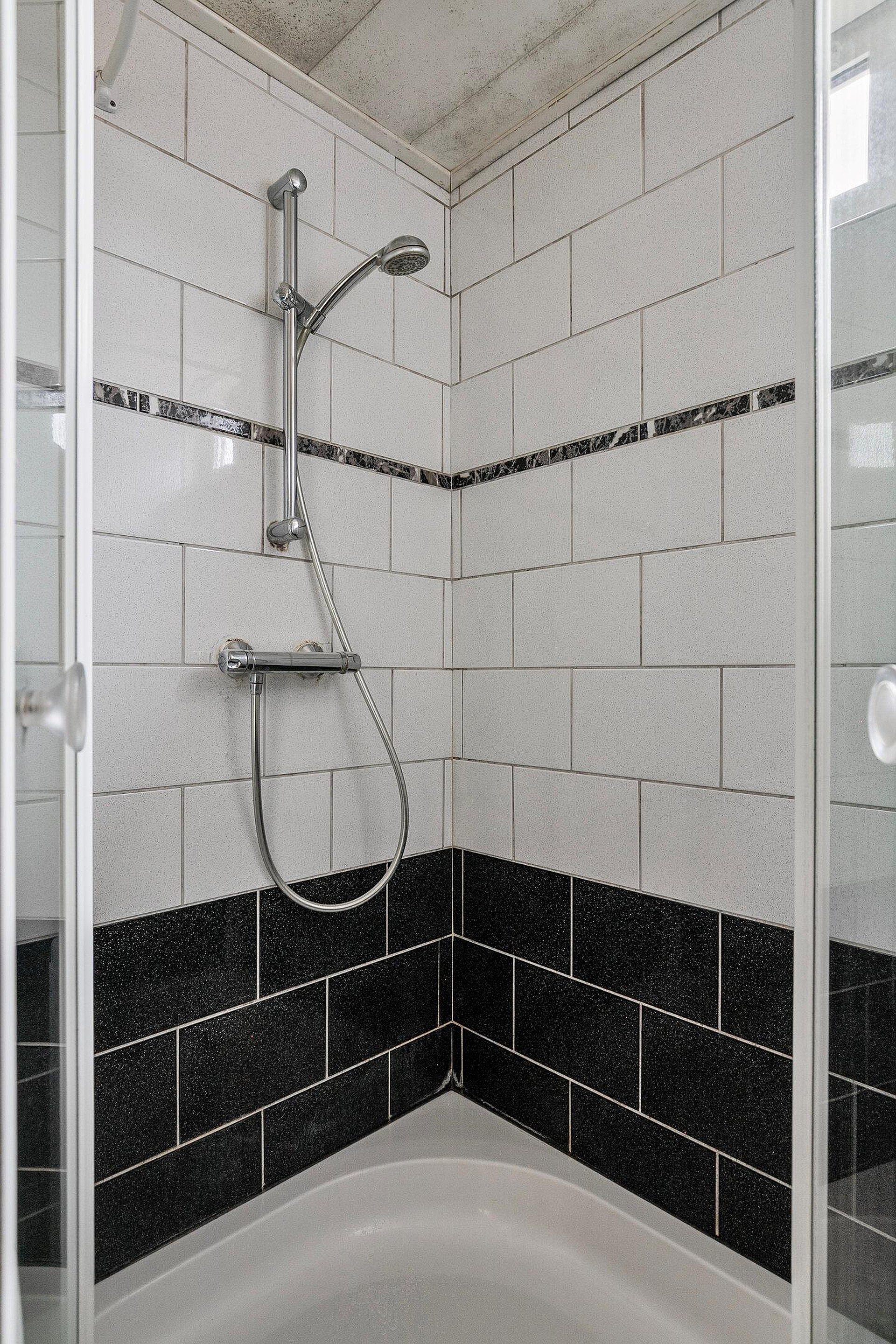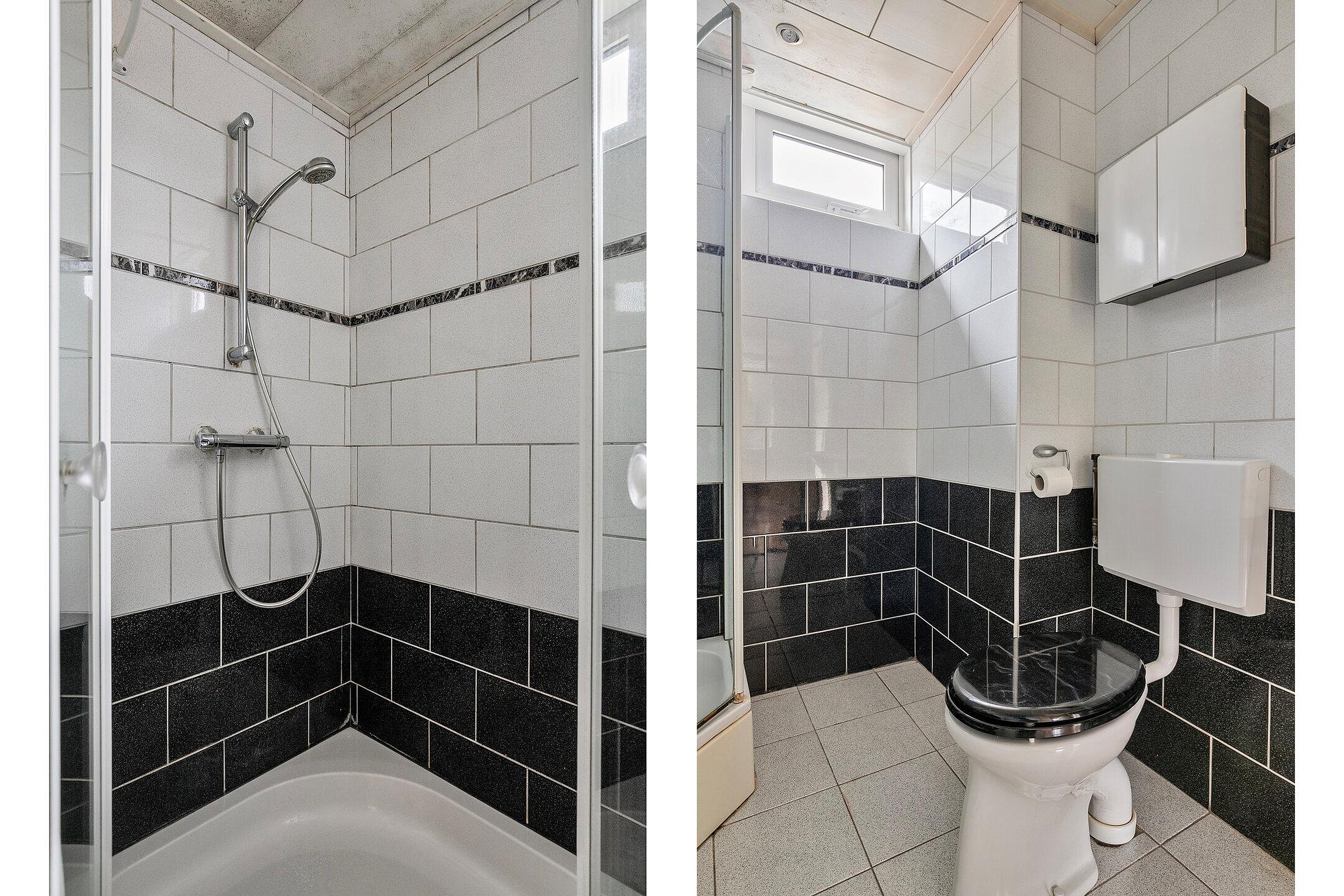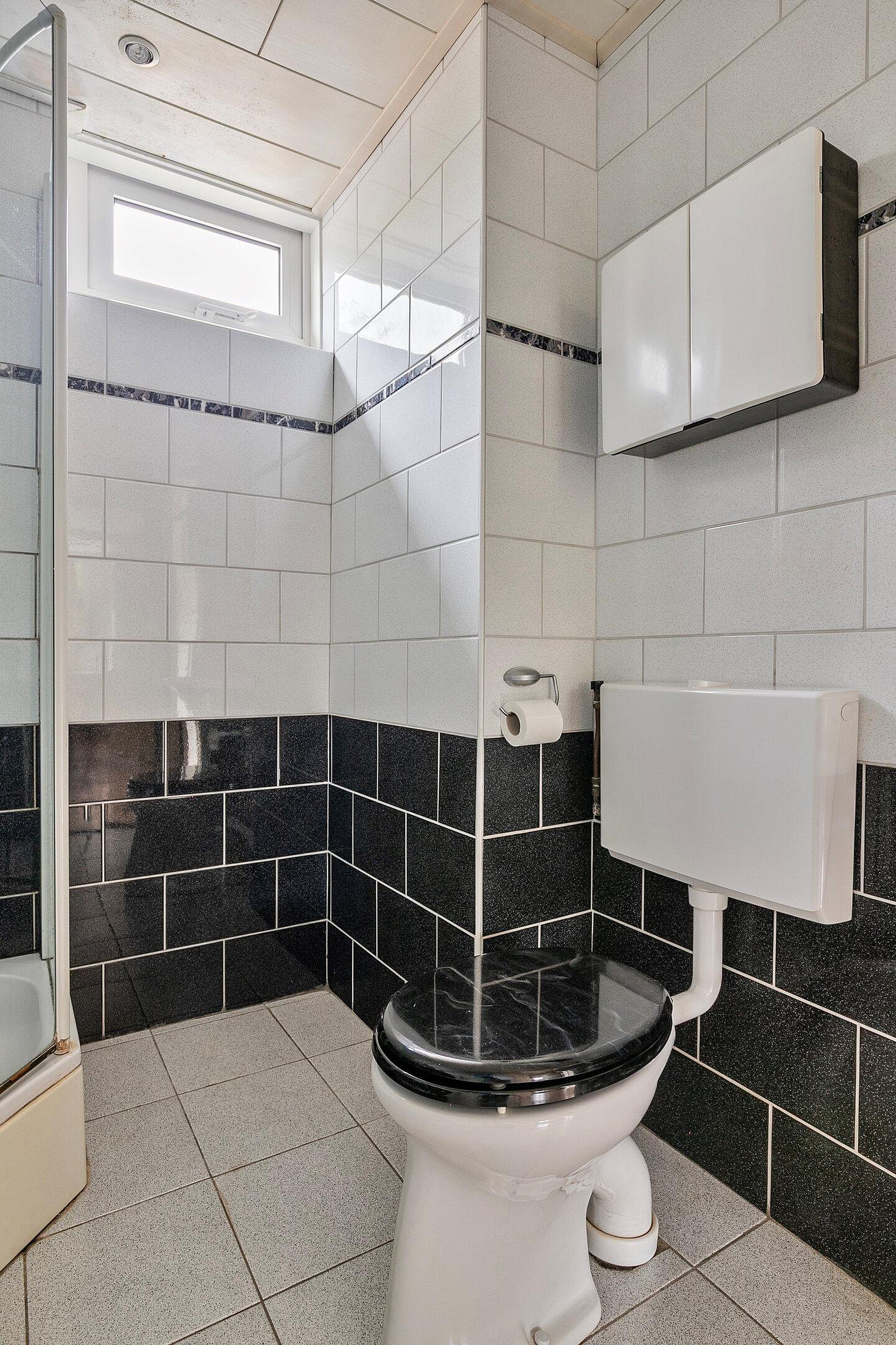 De badkamer is volledig betegeld en voorzien van een douchecabine, staand toilet, vaste wastafel, handdoekenradiator en aansluitingen t.b.v. de wasapparatuur. Dankzij het extra raampje is er natuurlijke ventilatie aanwezig.