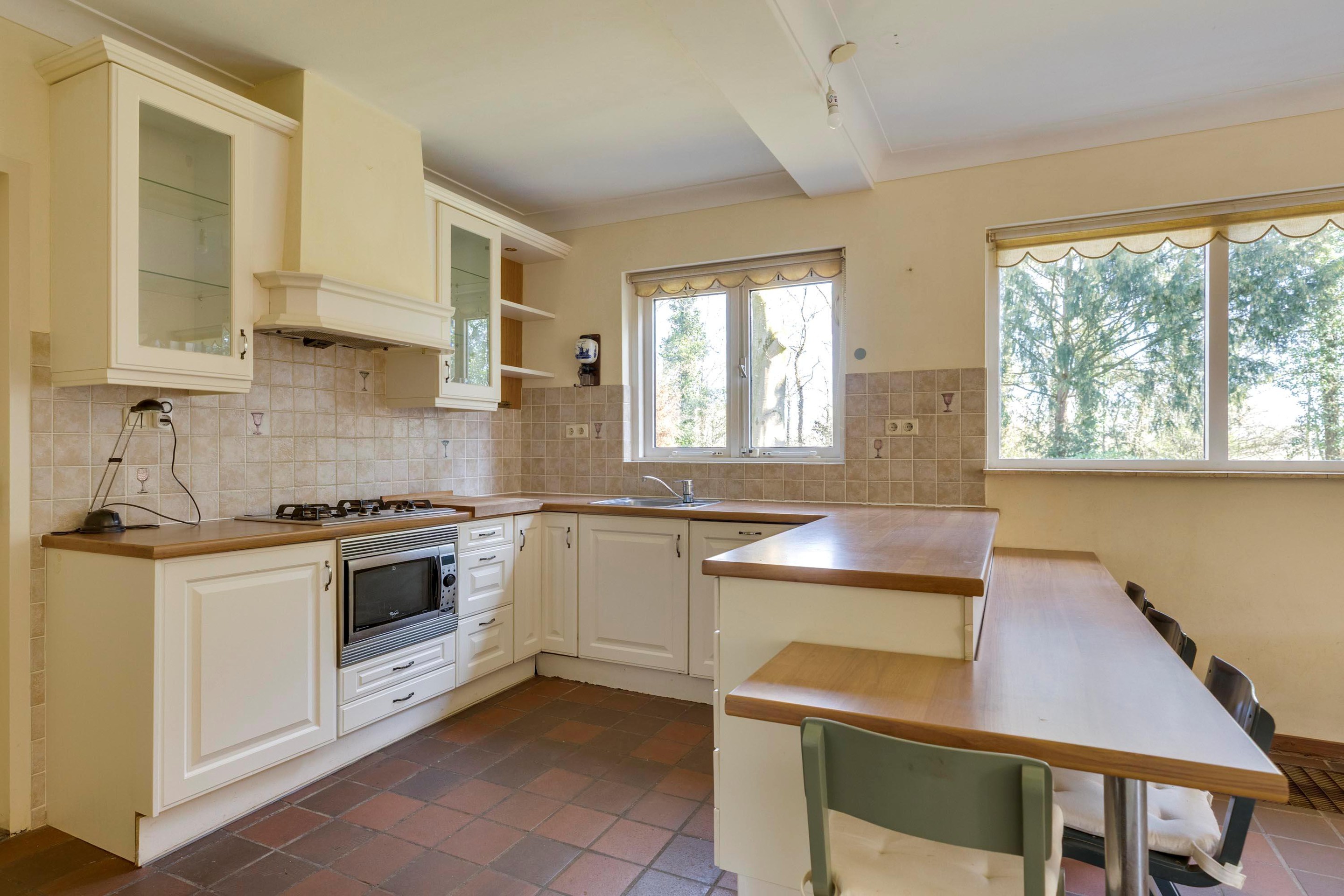 keuken beschikt over een eetbarretje en is uitgerust met diverse apparatuur, waaronder een