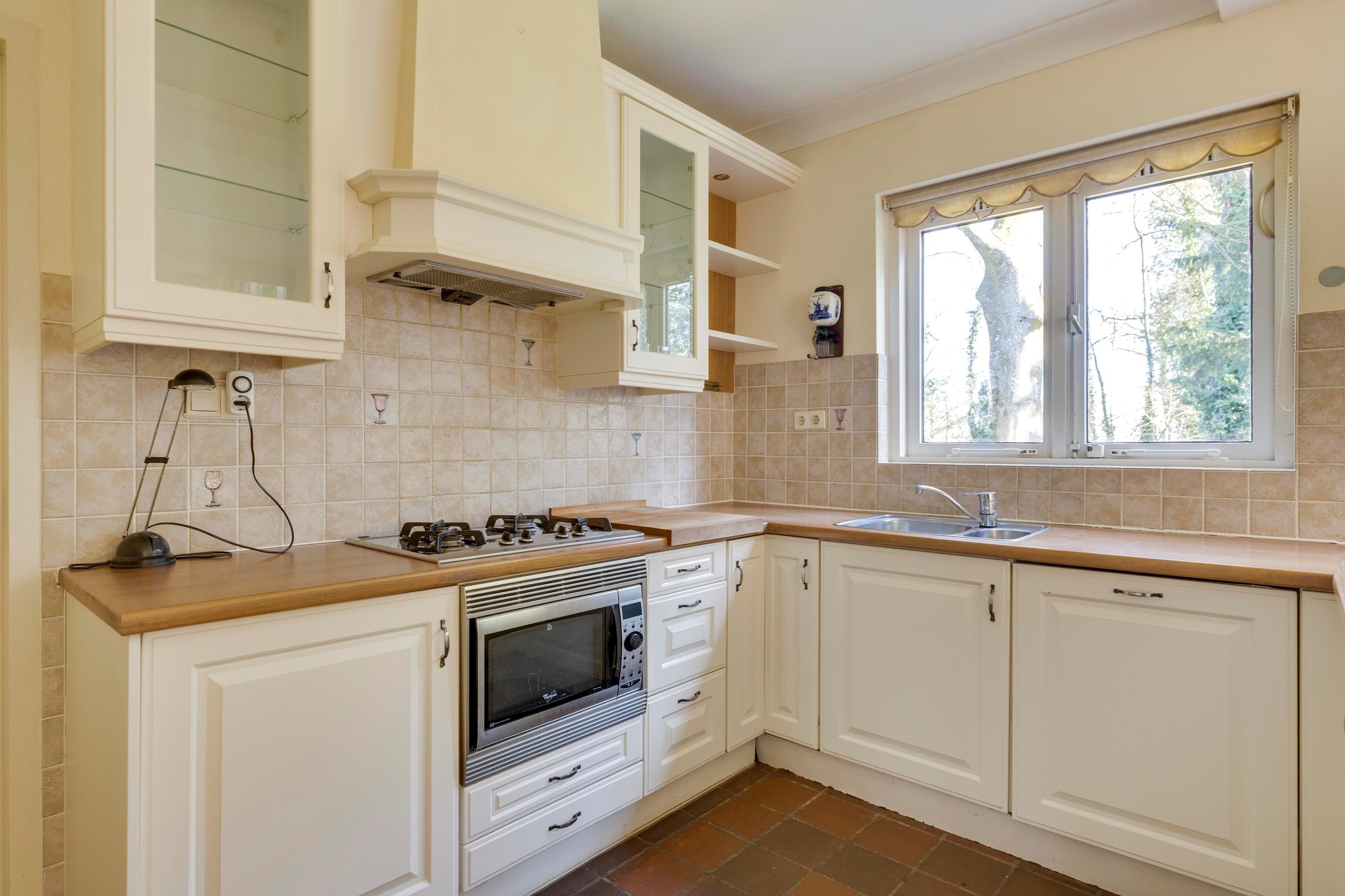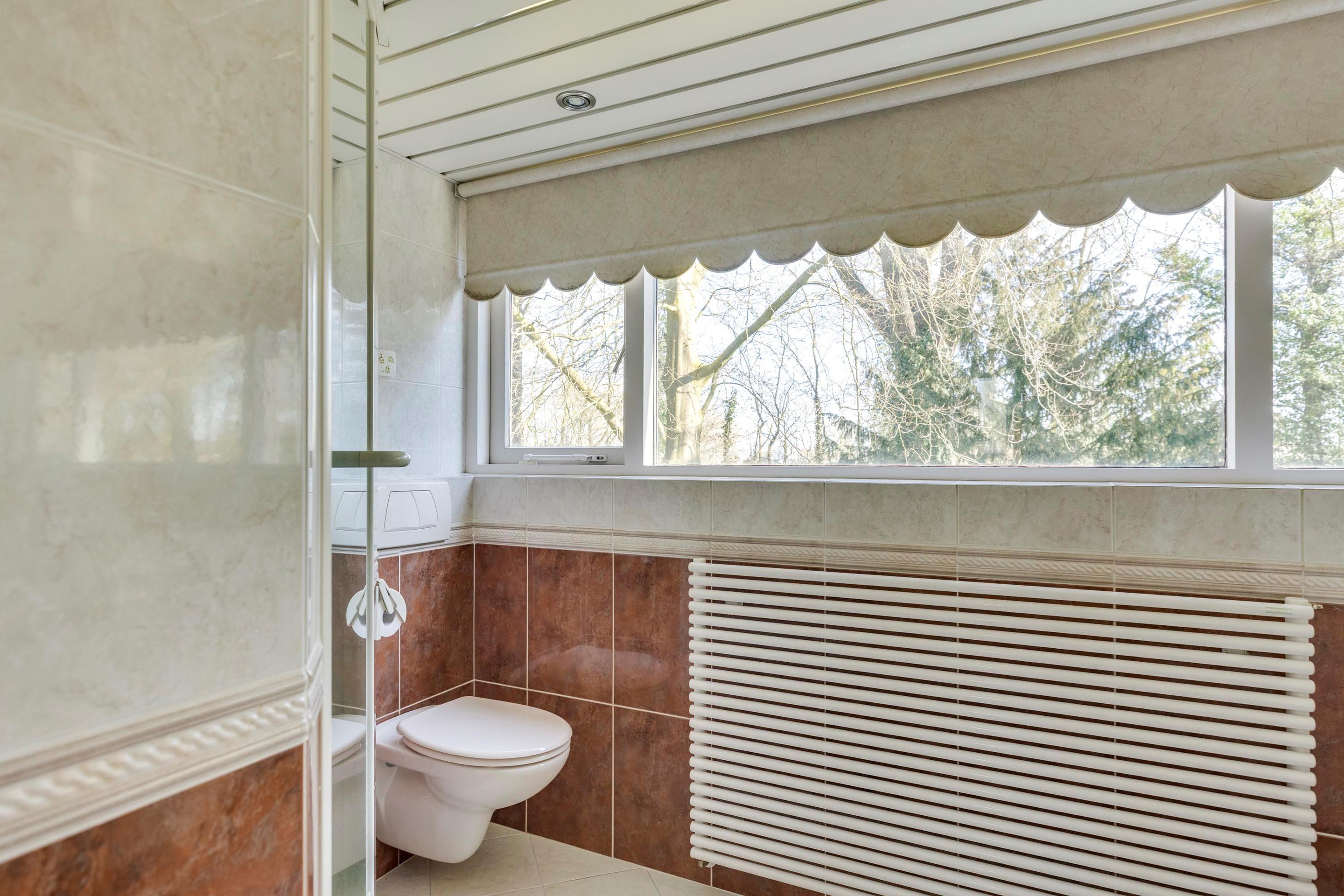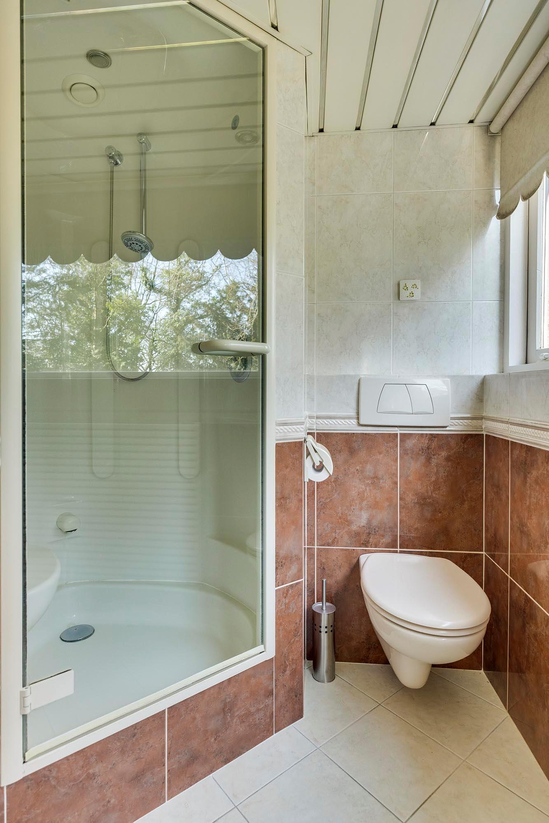 De badkamer is volledig betegeld en beschikt over een grote raampartij met uitzicht op de tuin.