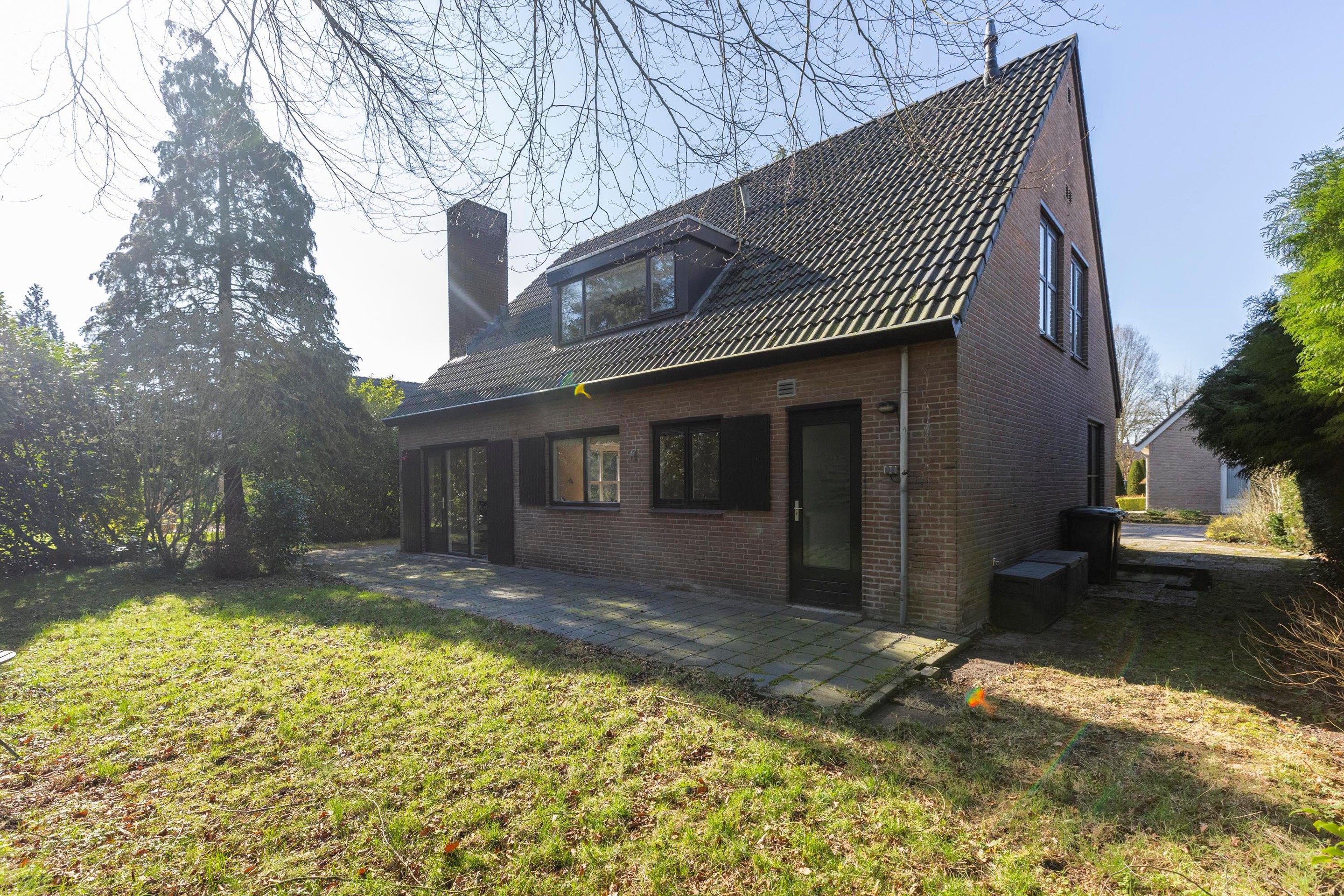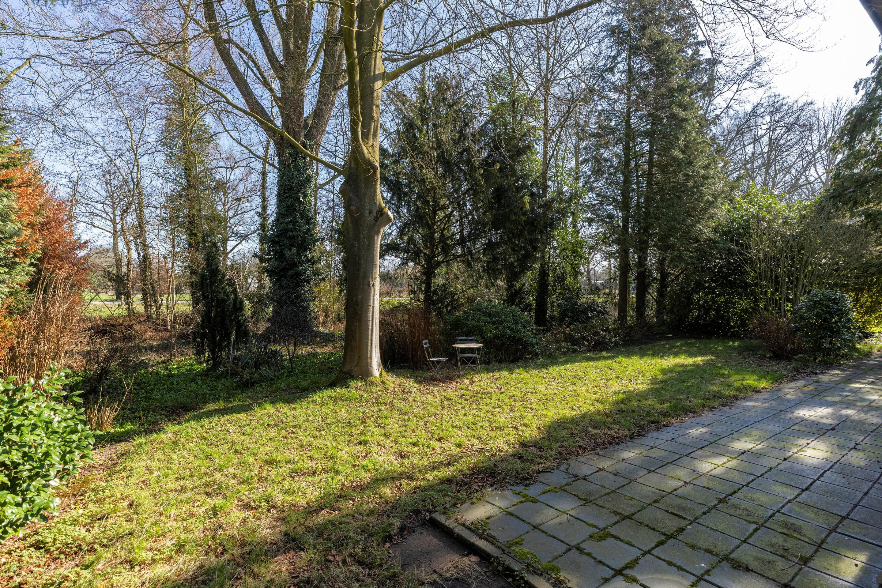 De achtertuin grenst aan een brede gemeentelijke groenstrook met volwassen bossage en